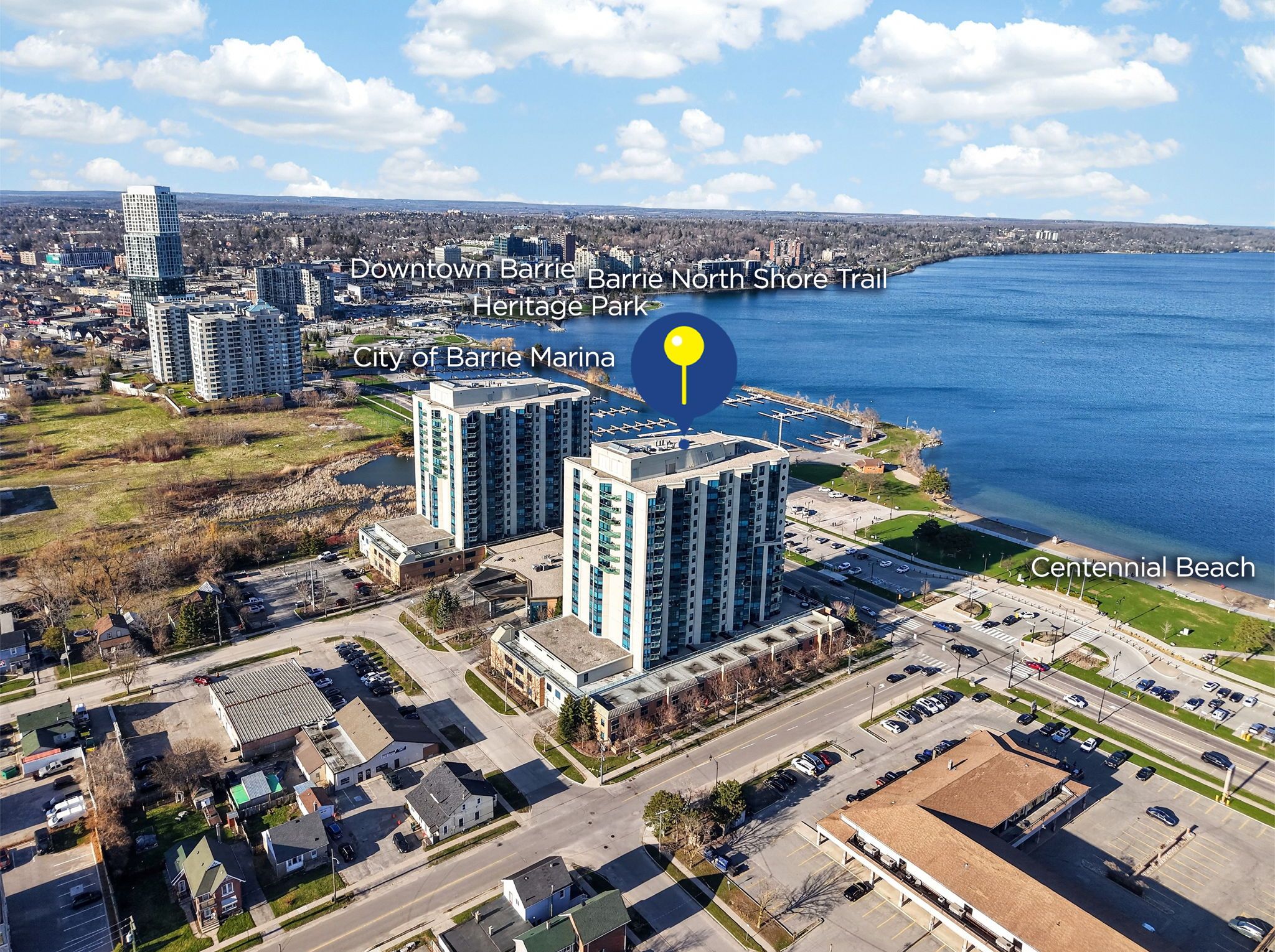 Welcome to this inviting waterfront-inspired residence overlooking barrie's kempenfelt bay. This beautifully renovated bimini model in the highly sought-after nautica community offers a warm blend of comfort, quality, & scenic living. Ideally positioned across from the waterfront, this 8th-floor suite showcases beautiful views of kempenfelt bay, the marina, & barrie's downtown skyline. This bright & welcoming 2-bedroom, 2-bathroom split-layout suite features a thoughtfully designed interior with quality upgrades throughout. The kitchen has been tastefully updated with quartz countertops, custom soft-close cabinetry, a functional island, pantry storage, & upgraded stainless steel appliances-perfect for everyday living & entertaining. The open-concept living area is filled with natural light from large windows & offers a walk-out to the balcony, creating a seamless indoor-outdoor flow. Complete with custom motorized blinds (2026), this space is ideal for relaxing or hosting while taking in the calm waterfront views. The spacious primary bedroom includes double closets & a private ensuite with a jetted tub & separate shower. The second bedroom featuresa built-in murphy bed & bookcase, offering a flexible & comfortable space for guests or a home office, along with its own walk-out to the balcony. Additional features include in-suite laundry & one conveniently located underground parking space near an interior entry point. Residents of nautica enjoy a secure, well-managed building with concierge service & a full range of amenities, including an indoor pool, hot tub, sauna, games room, library, & party rooms. Ideally located just steps from barrie's waterfront, trails, marina, & downtown amenities, & within close proximity to the go station, this home offers a wonderful opportunity to enjoy easy, low-maintenance living in a beautiful setting. Come experience the comfort & charm of waterfront living on kempenfelt bay!