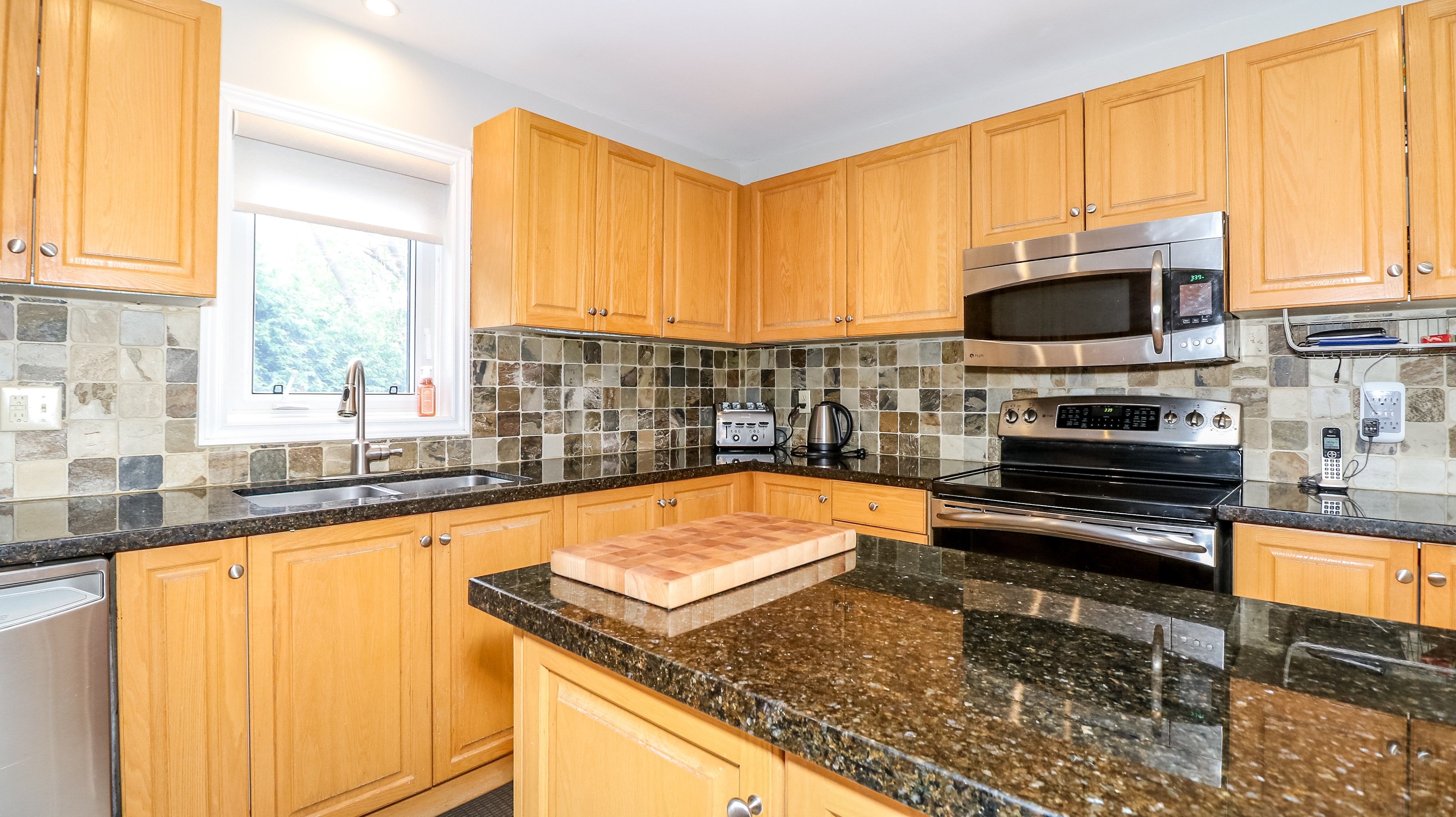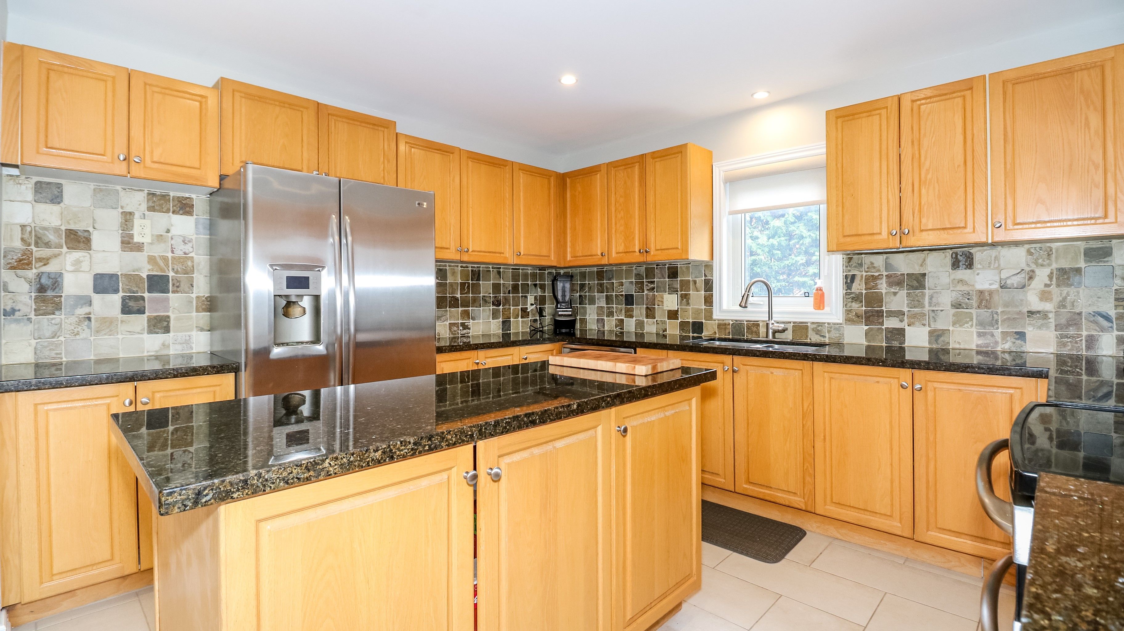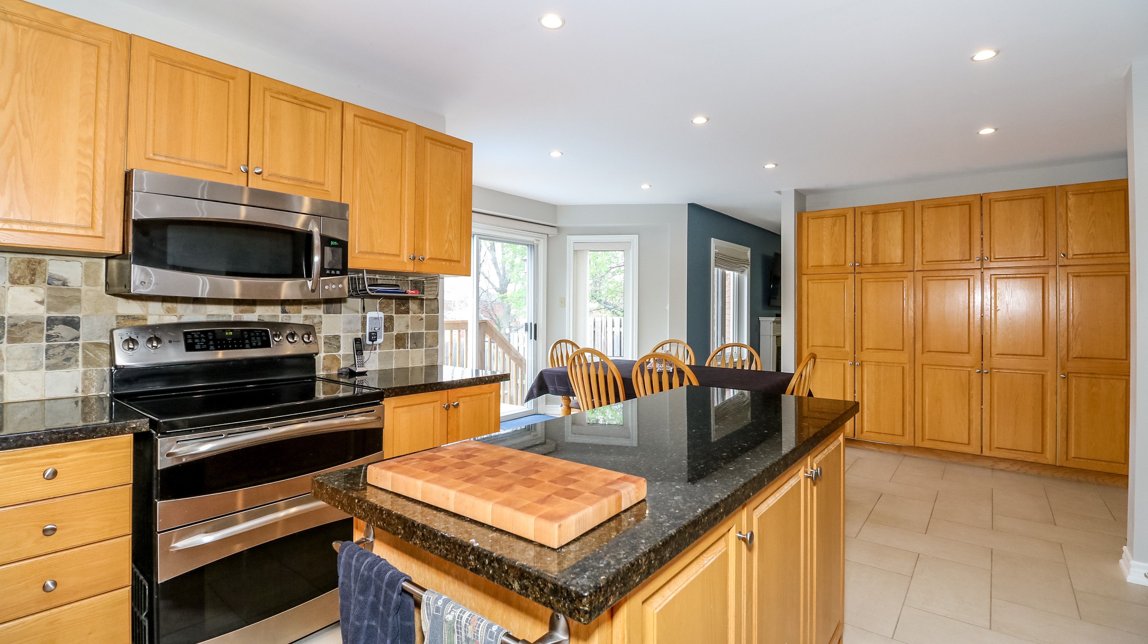 • Beautiful kitchen with stone counters, center island, and large pantry.