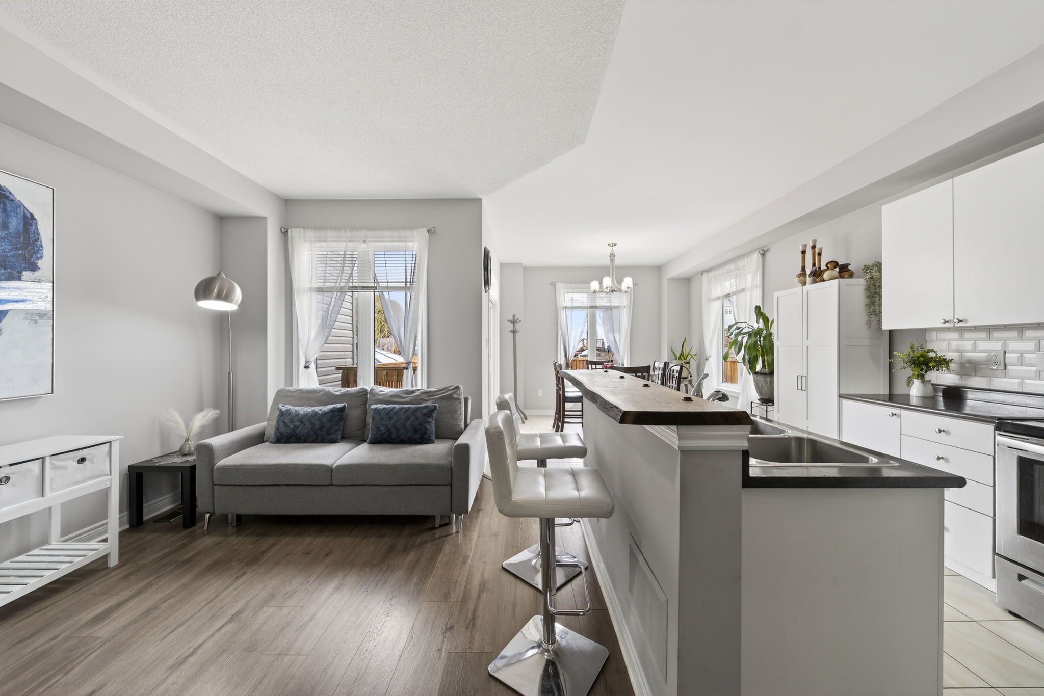 Welcome to 37 greenwood dr!! Discover modern living in this stunning family friendly pocket in coveted angus! Amazing, beautifully maintained sun-drenched freehold three large bedroom end-unit townhome (*** no sidewalk***) backing onto ravine that combines modern elegance with practical comfort. Main floor features 9 ft ceilings, open concept, bright combined living, dining, kitchen and huge breakfast area w walk-out to deck that allows for seamless entertaining! Large kitchen boasts stainless steel appliances, backsplash and convenient breakfast bar complete with a live edge solid wood counter! Make your way upstairs to three generously sized bedrooms that all feature great sized closets and large windows! The primary room is complete with a spacious 4-pc en-suite, large soaker tub, stand alone shower and two large closets (one is a walk-in). Incredible, large second floor laundry room with ample storage! Soak in the sun on the interlocked patio & fully fenced in yard. Enjoy the convenience of a large garage and direct access to the house! Situated in a quiet pocket and backing onto ravine this home offers the best of both worlds: tranquility with walking trails and prime location - minutes away from schools (new elementary school opening at 152 greenwood in 2027), shopping, transit & easy access to major highways making everyday life seamless & enjoyable. This house is more than a home - it's a lifestyle!