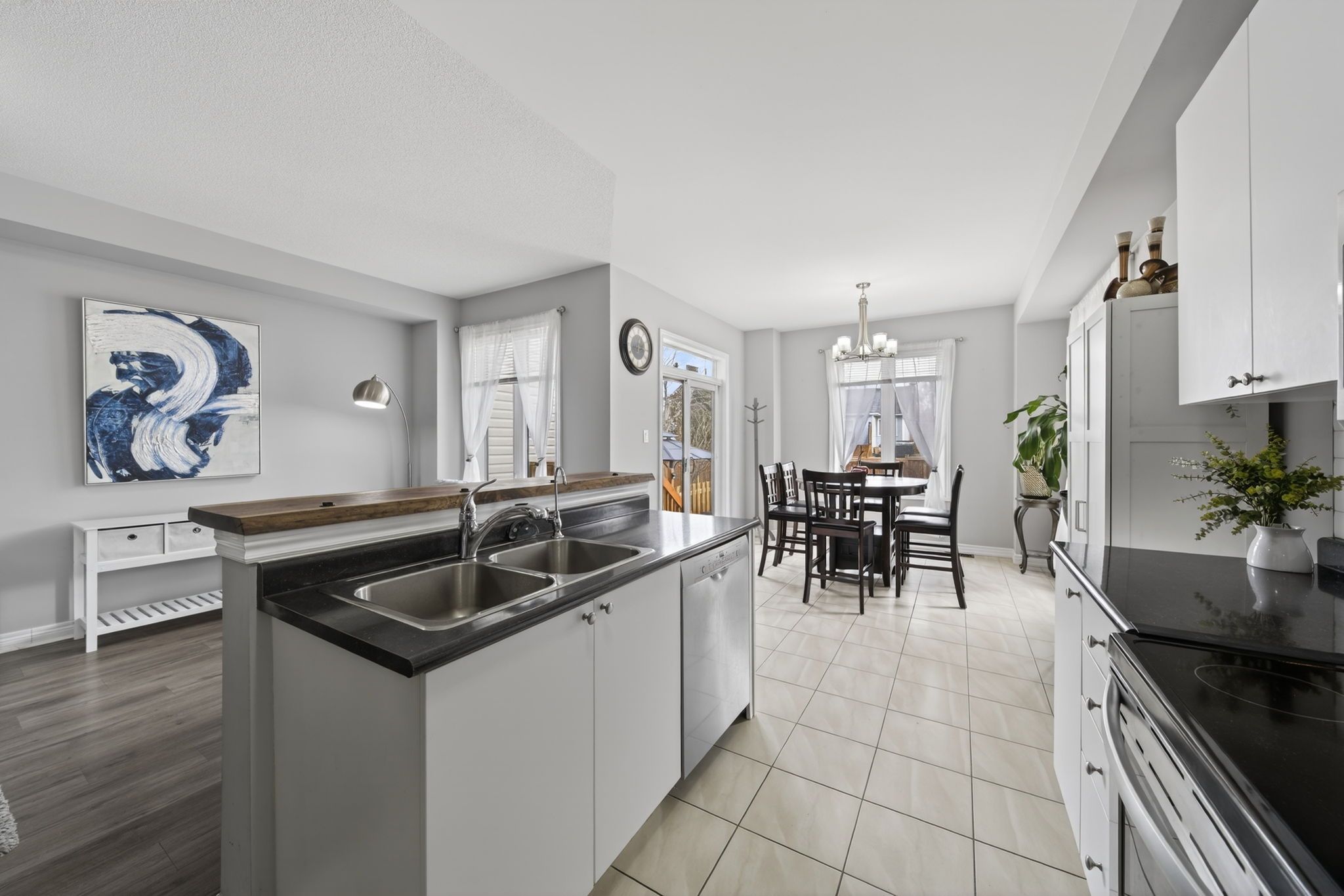 • Large kitchen with stainless steel appliances and live edge wood countertop.