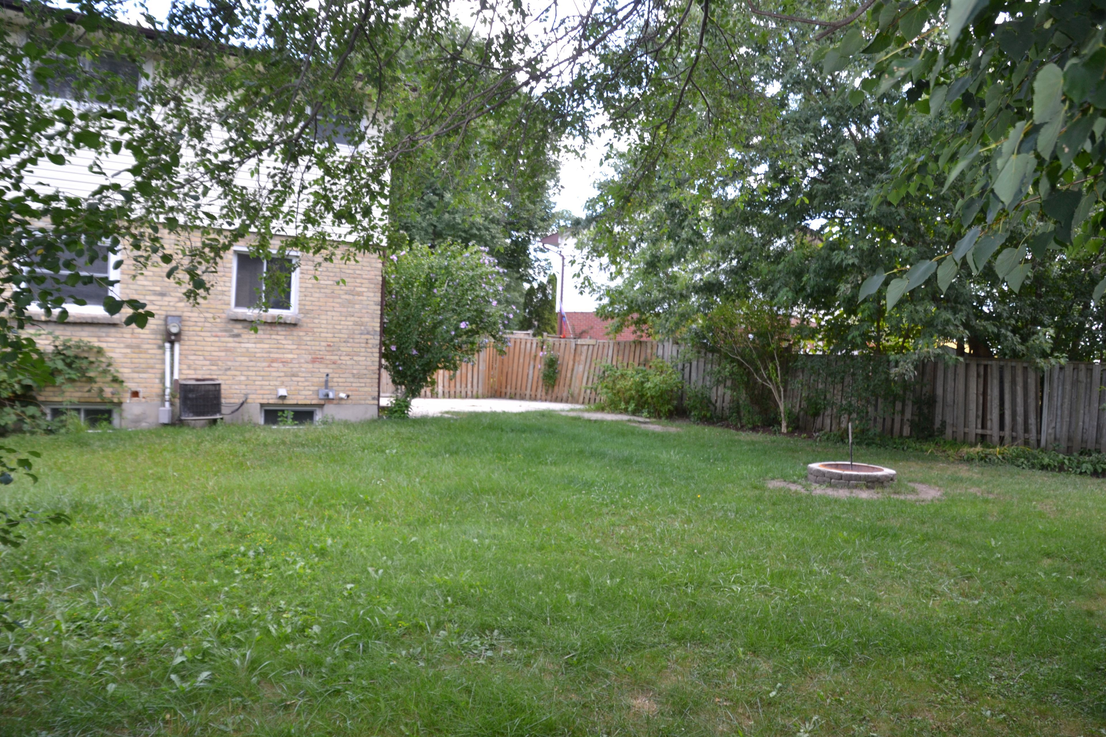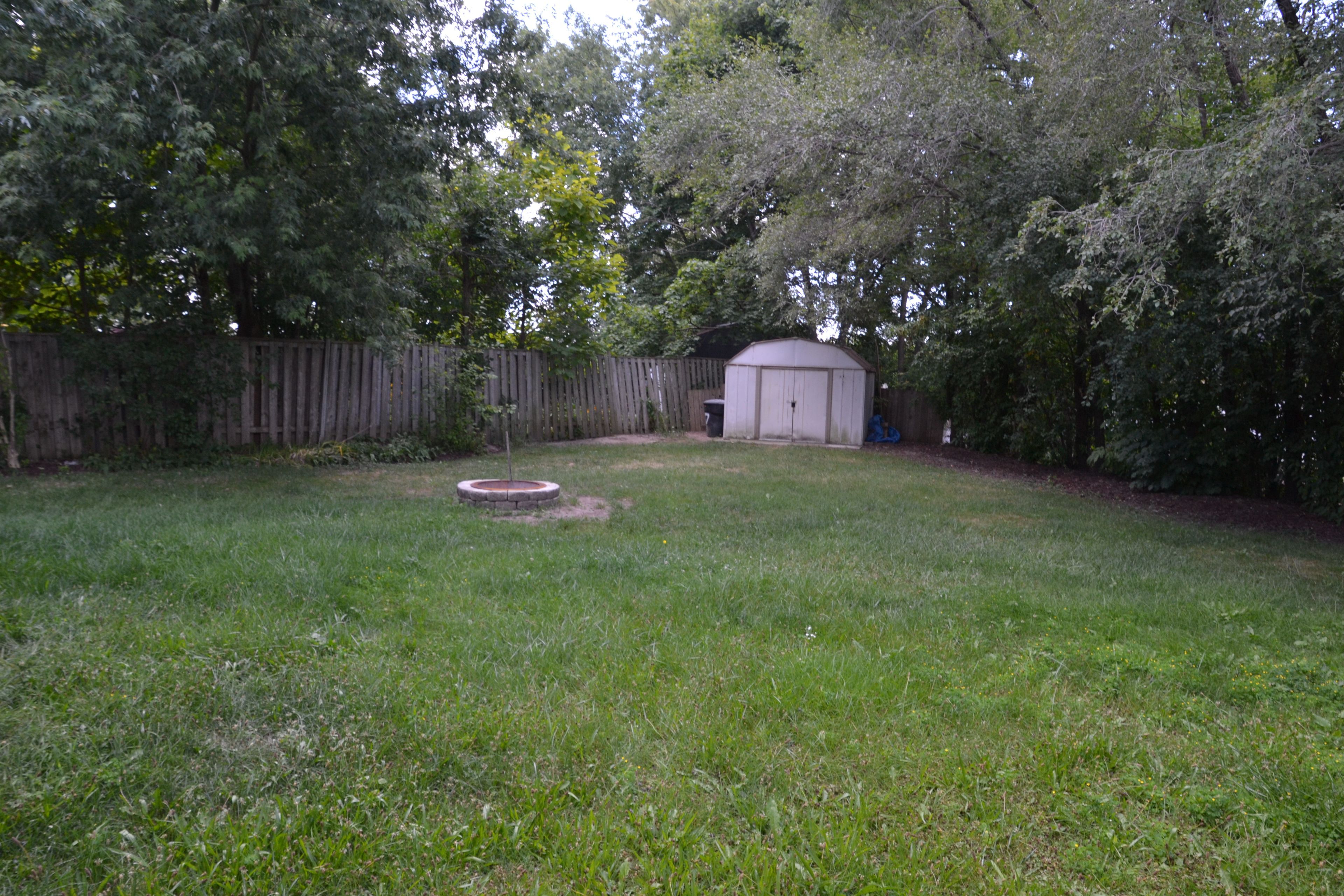 • Fenced backyard with stamped concrete seating area and fire pit.