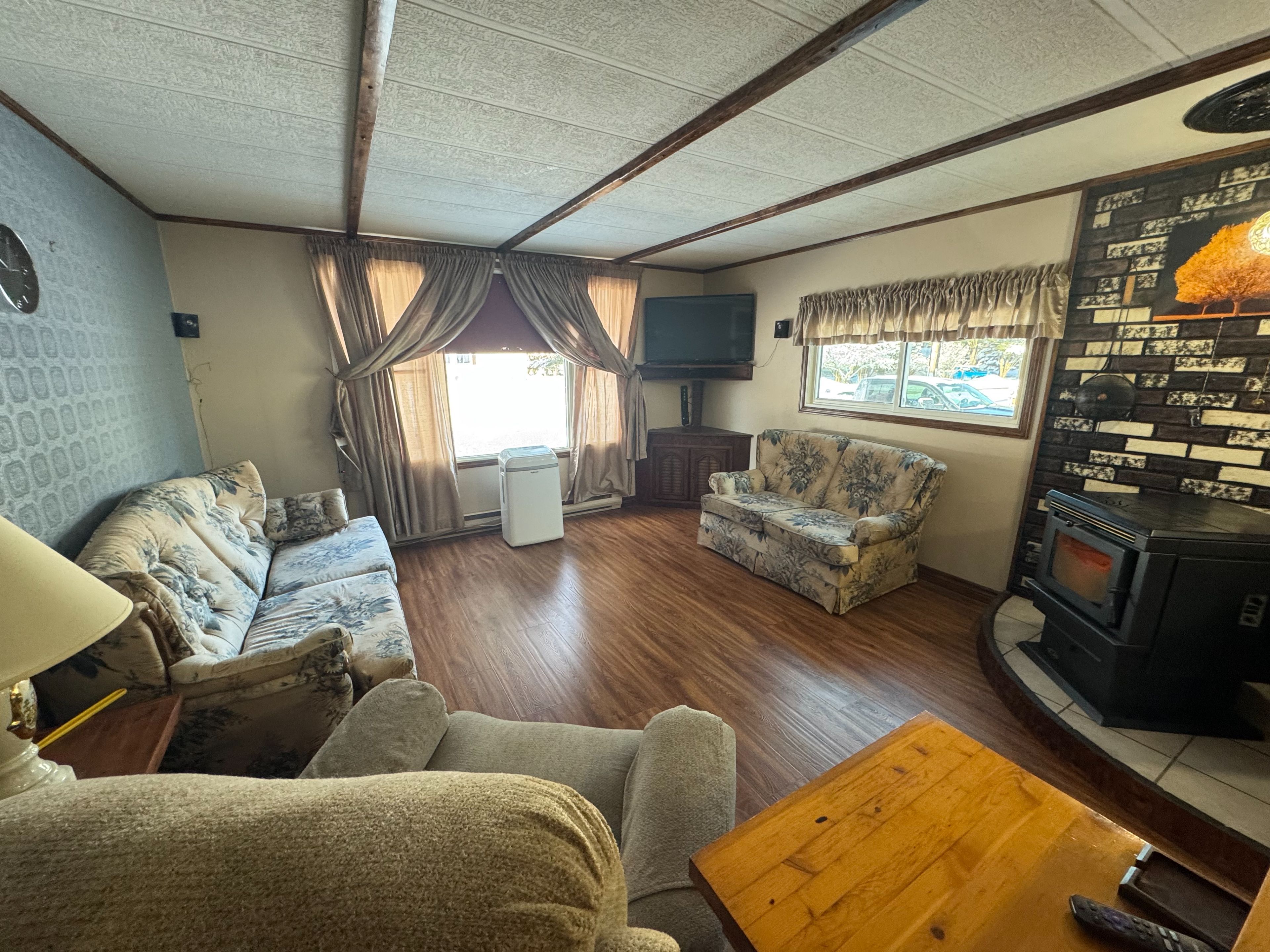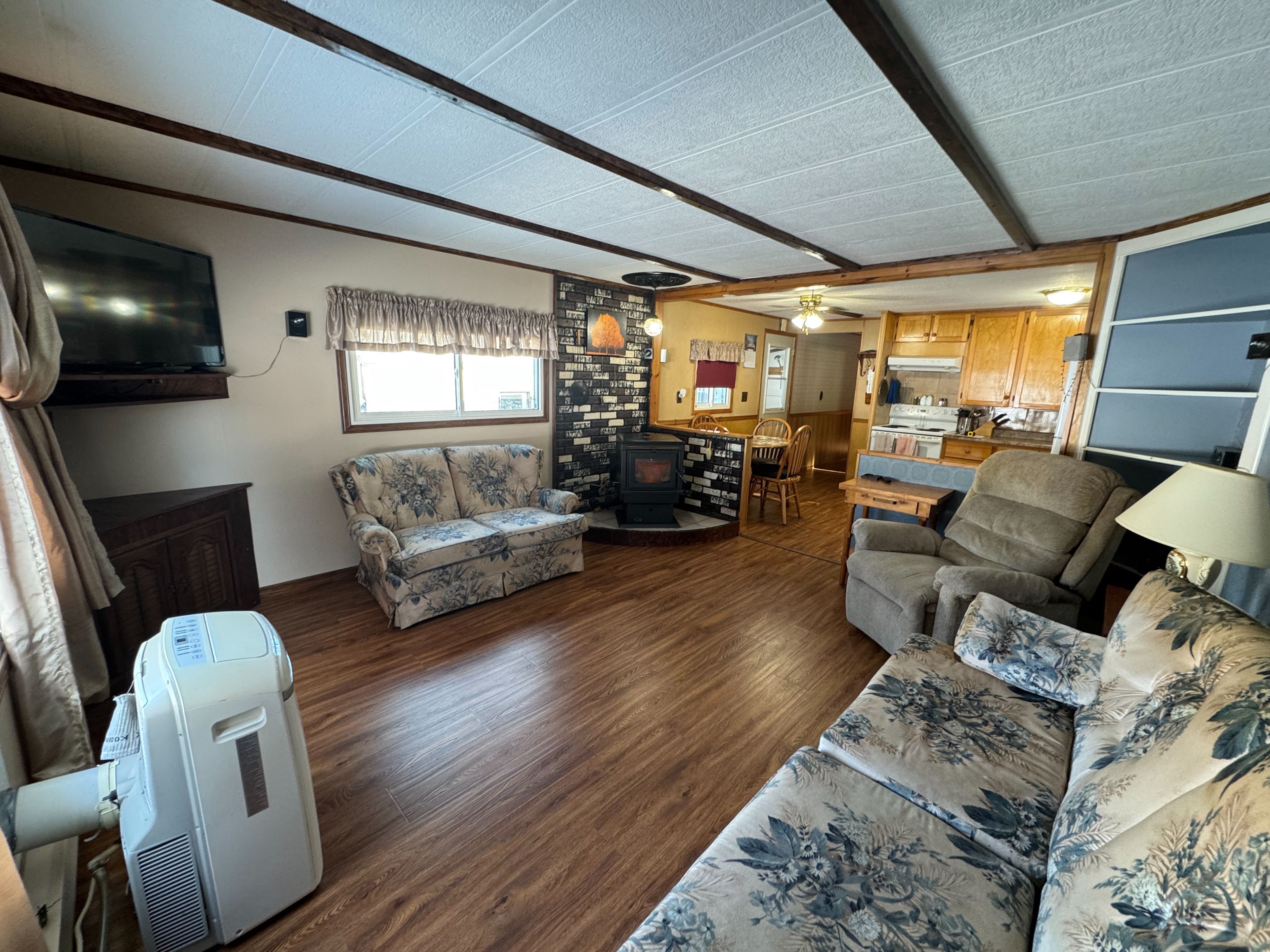 • Heated with pellet stove and electric baseboard for warmth.