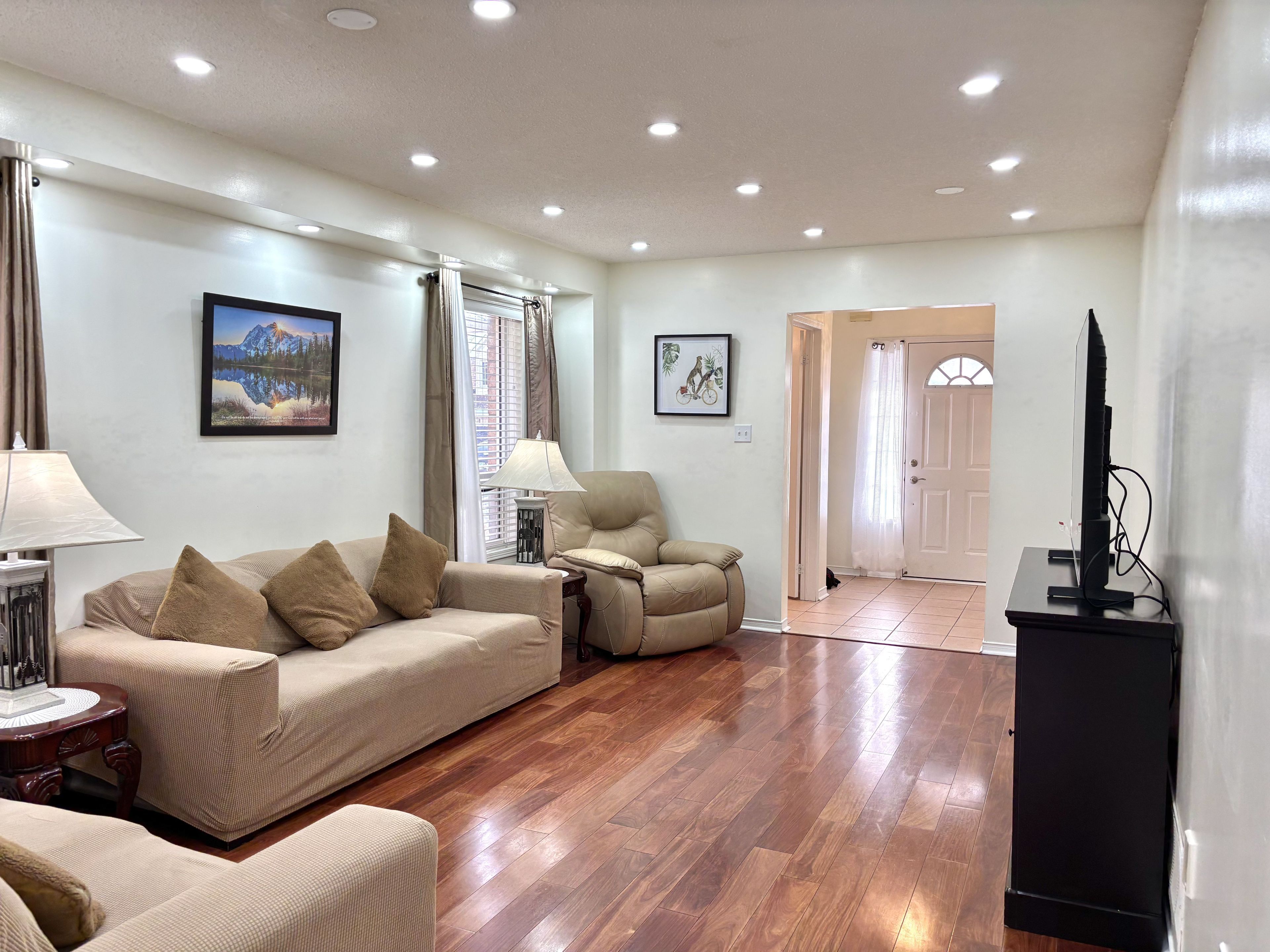 Discover this beautifully maintained detached home featuring a bright and functional layout, three spacious bedrooms on the second floor, and a nicely designed finished basement. The main level offers a family-sized kitchen with quartz countertops, breakfast area and walk-out to the backyard, along with newly installed pot lights and a modern staircase. Upstairs features three spacious bedrooms, including a primary with a walk-in closet and 4-piece ensuite, plus a second full 4-piece bathroom. The finished basement includes a spacious recreation room, additional room, convenient kitchenette, and a full 3-piece bathroom, ideal for a home office, guest space, gym or extended family living. The property also offers excellent potential to create a private side entrance. Direct access from the garage to the main level and a driveway with no sidewalk provide added everyday convenience and parking for up to 3 vehicles. Ideally located within walking distance to schools, shopping, parks and cassie campbell community centre, and just minutes to mount pleasant go station and highway 410. A welcoming home that delivers both comfort and functionality!