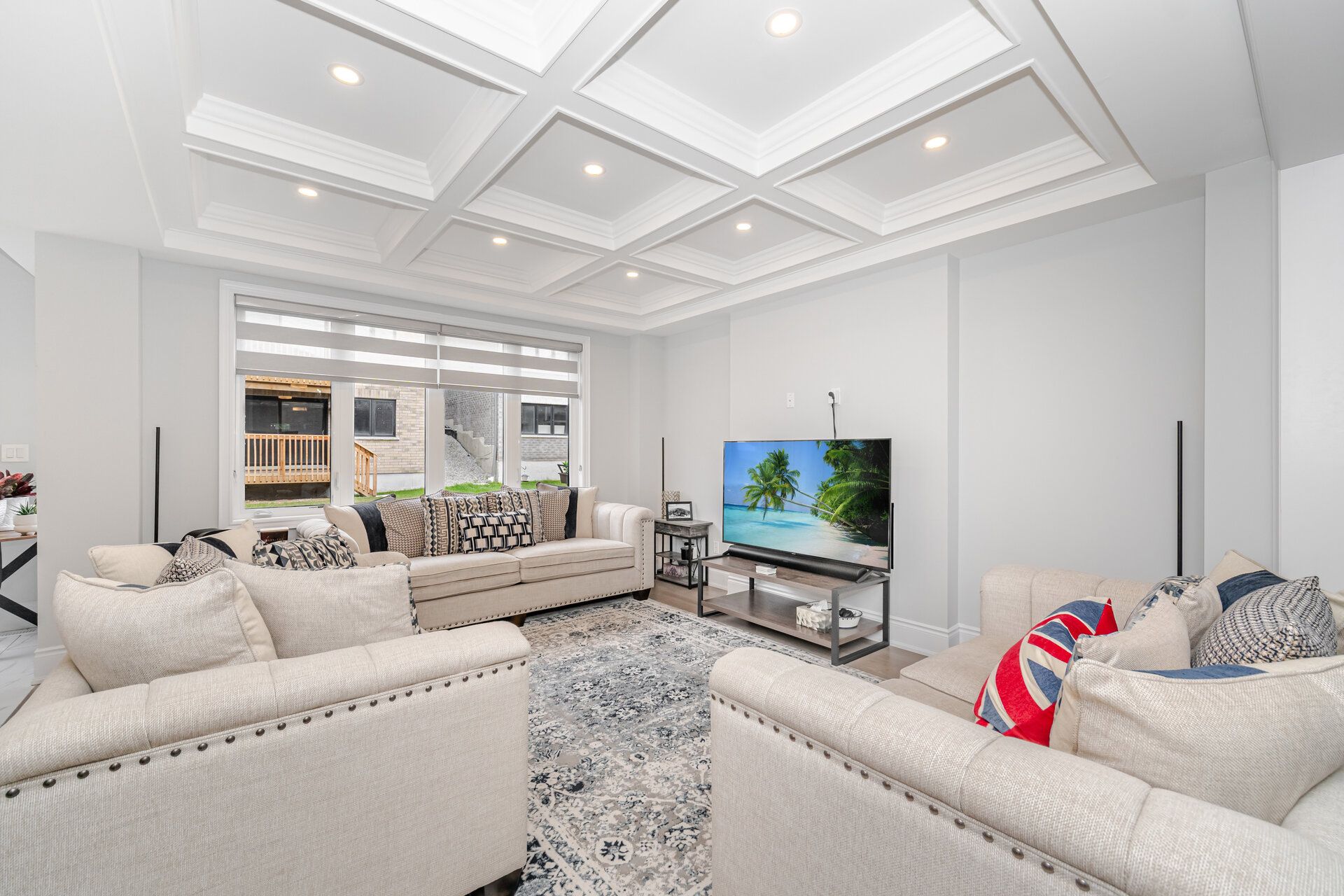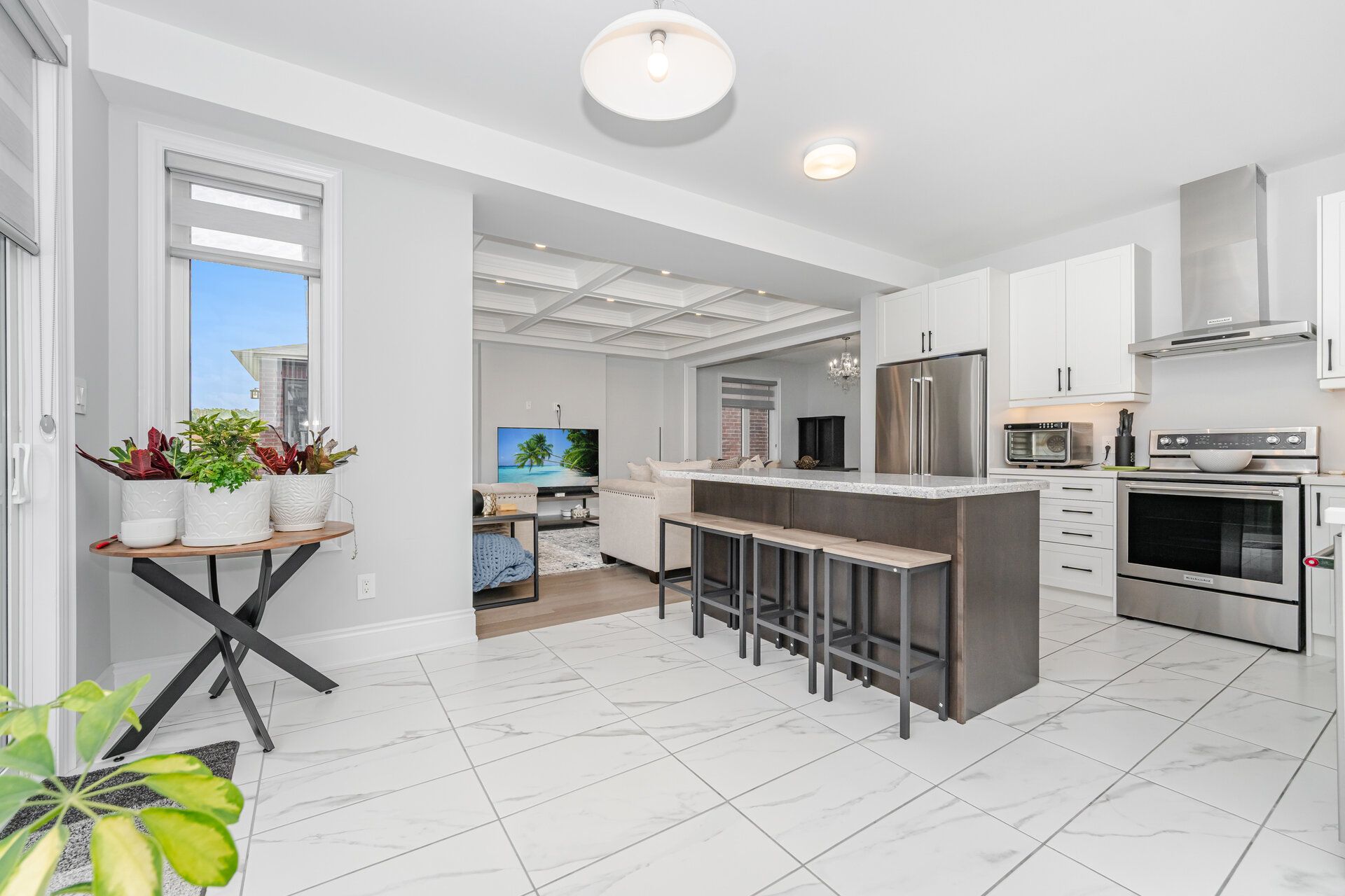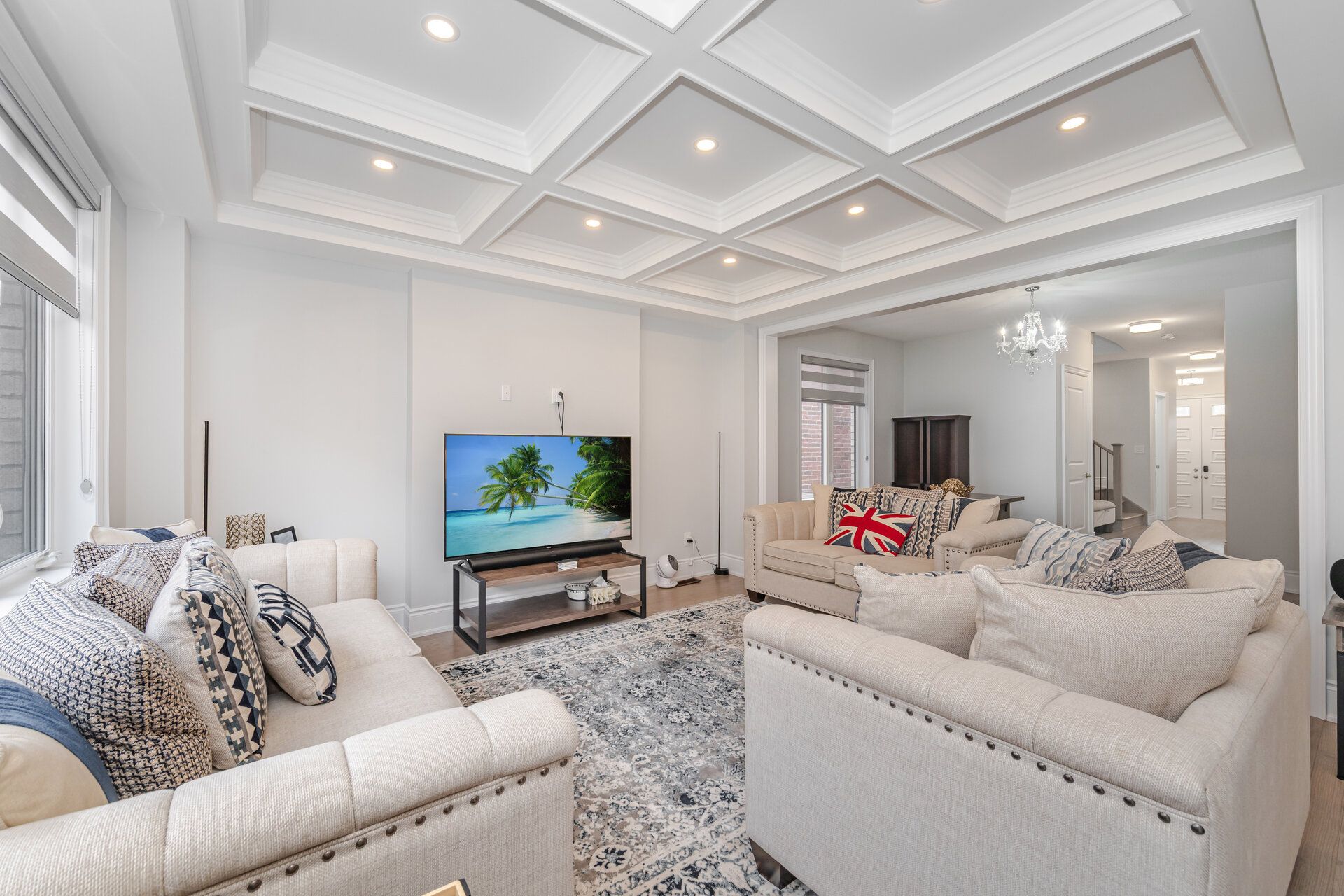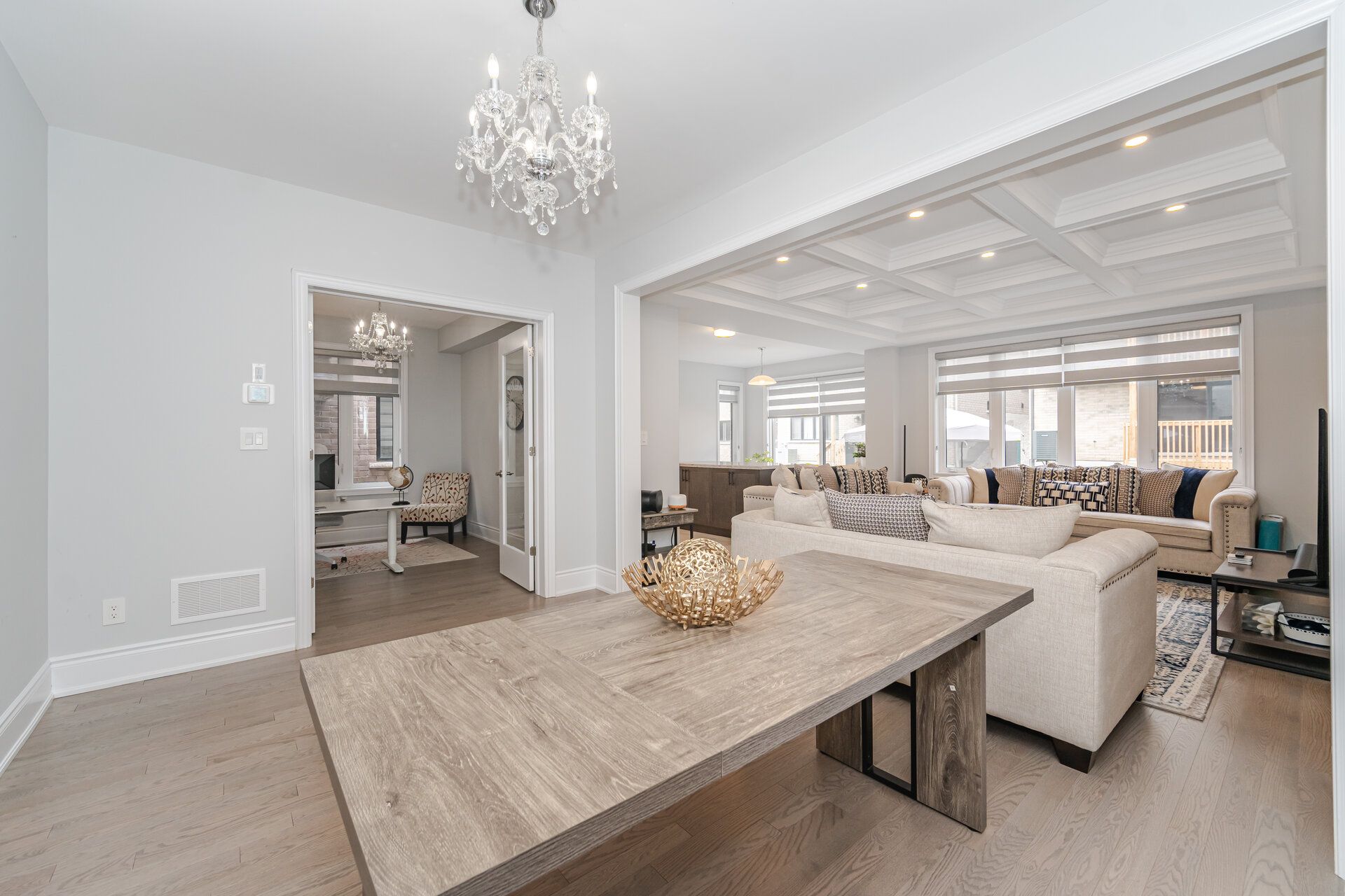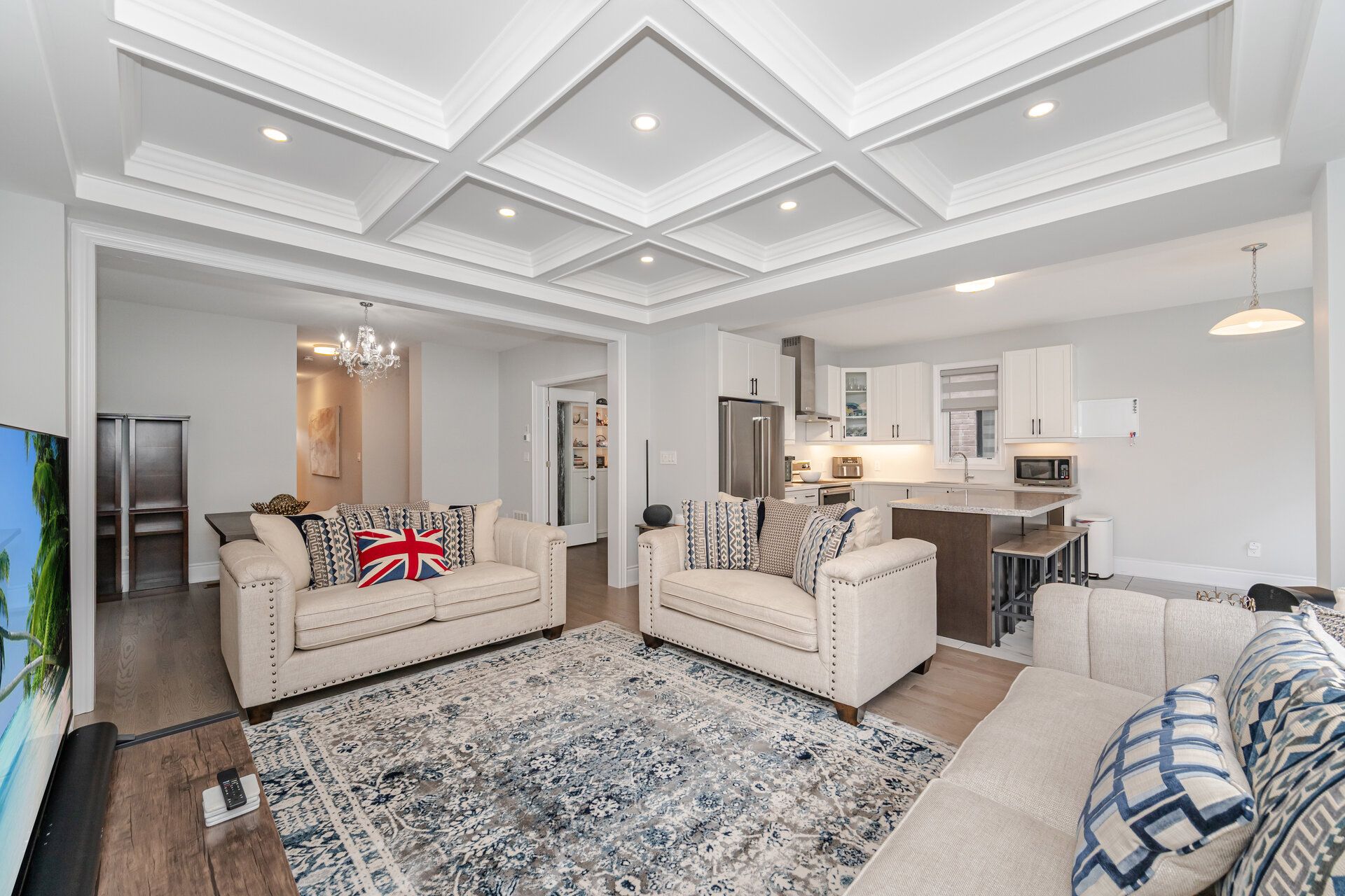 • Stunning family room with coffered ceiling and fireplace for cozy gatherings.
