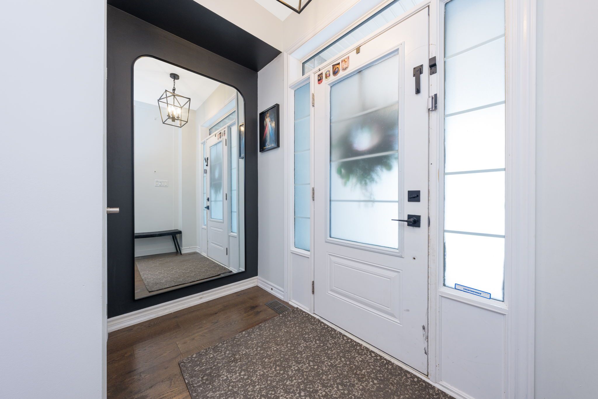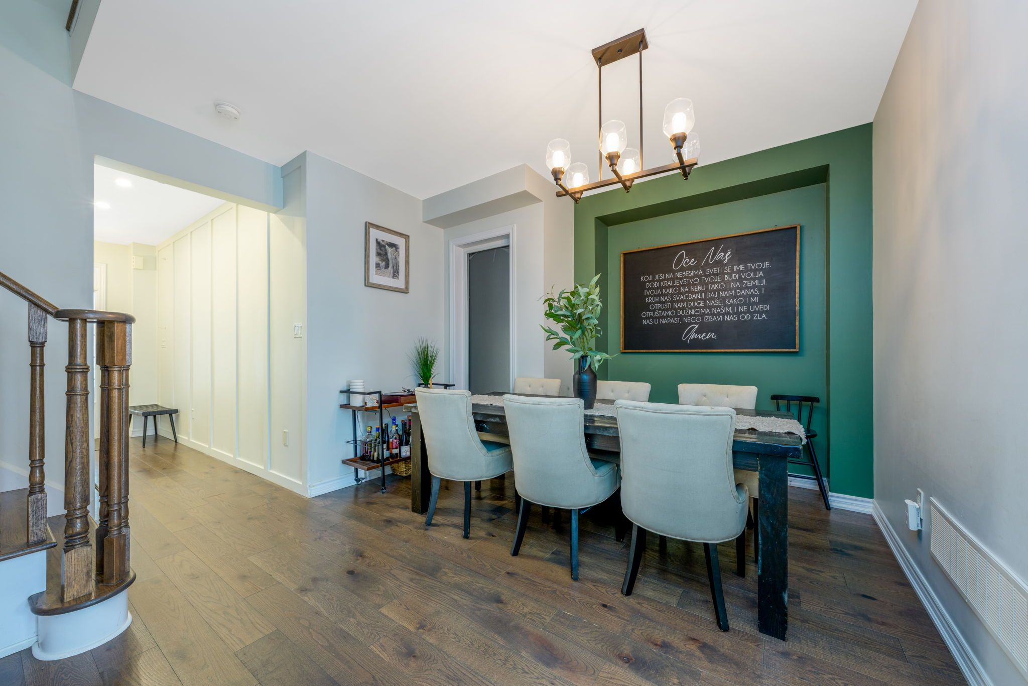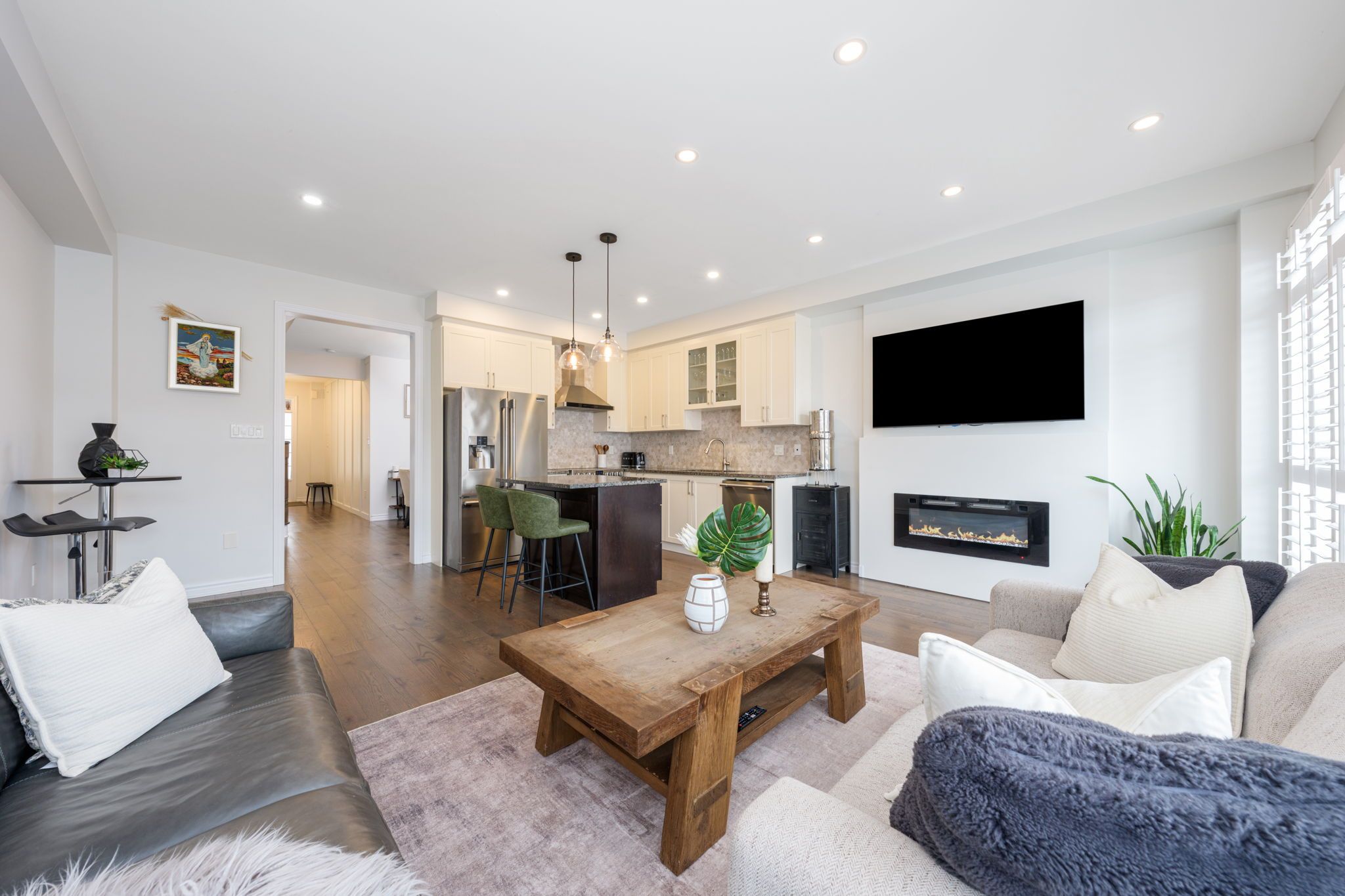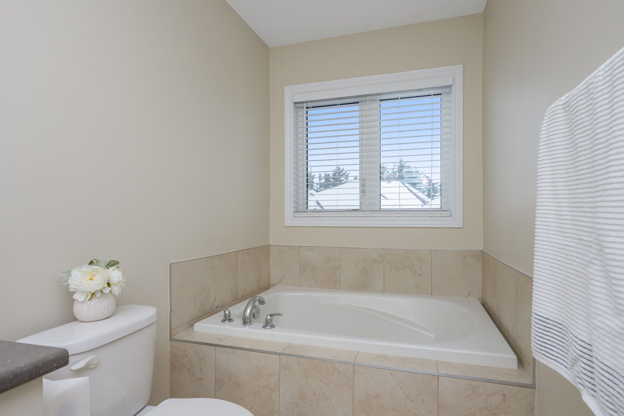 Nestled in a sought-after small enclave, this beautifully appointed townhome offers an exceptional blend of style, comfort, and convenience. Ideally positioned just steps from a park and picturesque trail, the location perfectly balances nature and community living. The striking exterior showcases an elegant stone and stucco façade complemented by a welcoming covered portico that creates a warm and inviting first impression. Inside, the open-concept main level features 9 ft. Ceilings and quality, tasteful finishes, including hardwood flooring and pot lights, creating a bright and inviting feel. The well-designed kitchen features two-tone cabinetry, centre island with breakfast bar, granite countertops, stylish mosaic backsplash, stainless steel appliances and seamlessly open to the living room - perfect both entertaining and family time. The living room offers a walkout to the deck, extending the living space outdoors. A sun-filled dining area flows beautifully into the foyer and is enhanced by an attractive wood staircase. Upstairs, the home offers three generously sized bedrooms, all finished with tasteful laminate flooring. The primary suite serves as a relaxing retreat complete with a walk-in closet and an elegant 4-piece ensuite. A nicely appointed 4-piece bathroom and convenient upper-level laundry complete this level. The finished lower level adds valuable living space, featuring a bright recreation room with large above-grade windows, office and 2-piece bathroom all enhanced by vinyl plank flooring and pot lights. Ample storage/utility space completes the package. Outside, enjoy a nicely landscaped fully fenced yard with a large deck along with covered and enclosed storage conveniently located beneath. The attached garage with house access and parking for 3 cars (1 in garage and 2 in driveway) are a bonus. Ideally situated close to schools, shops, restaurants, and the breathtaking hungry hollow trail system with easy access to main roads for commuters.