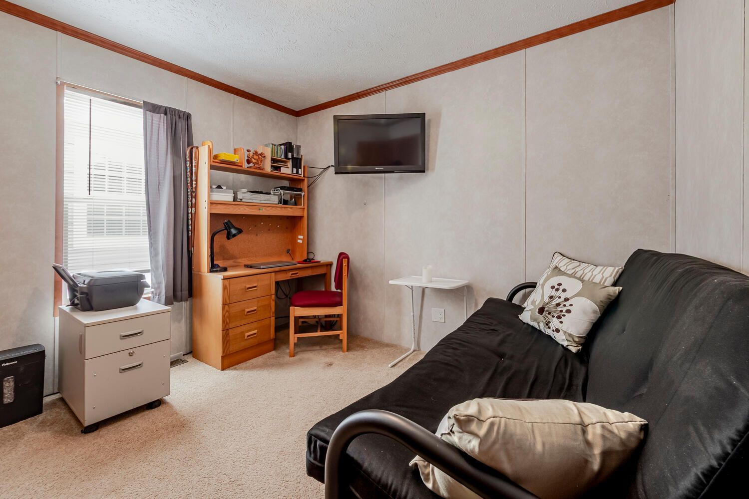 • Practical guest bedroom that can be used as an office or den.