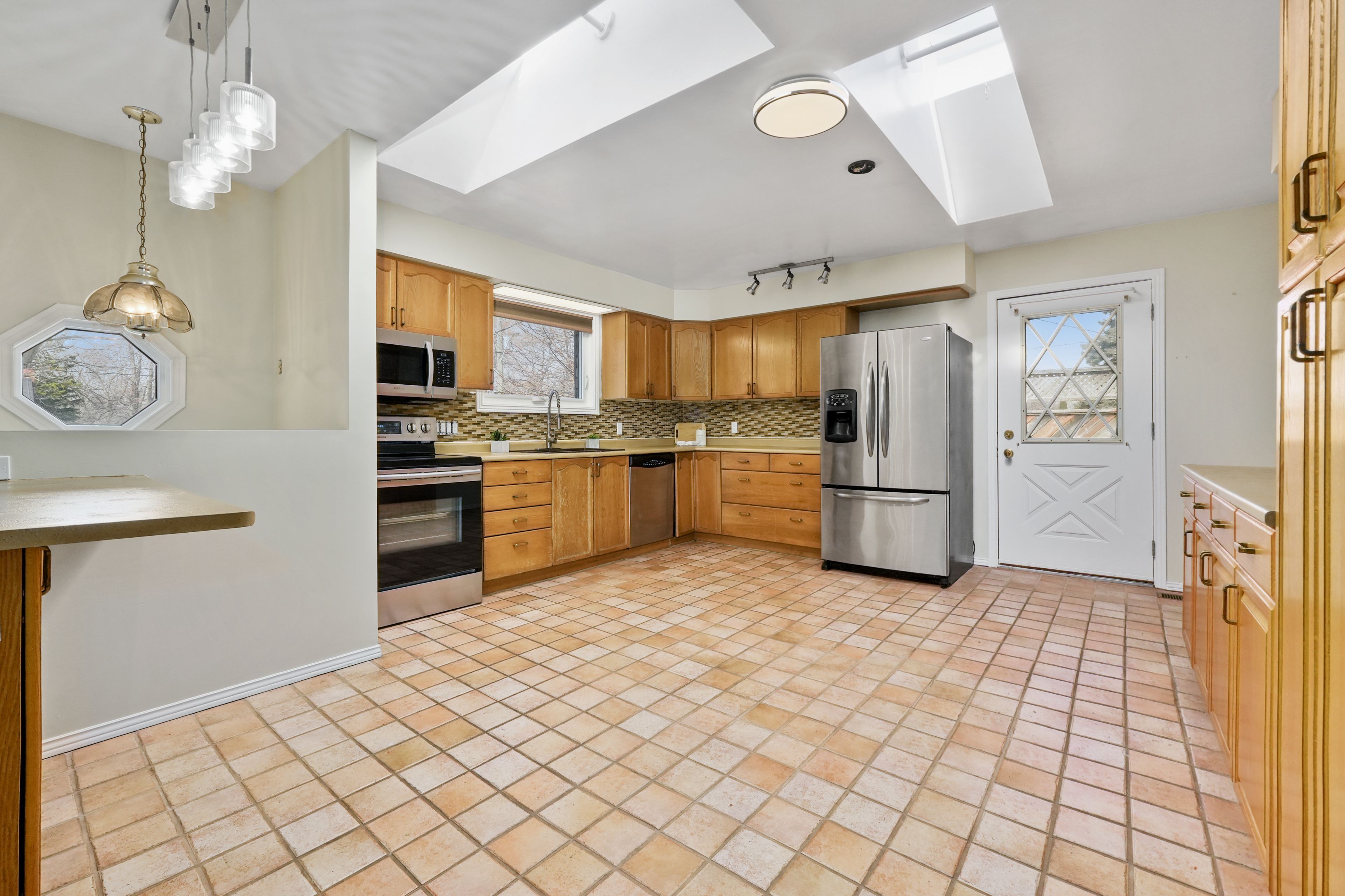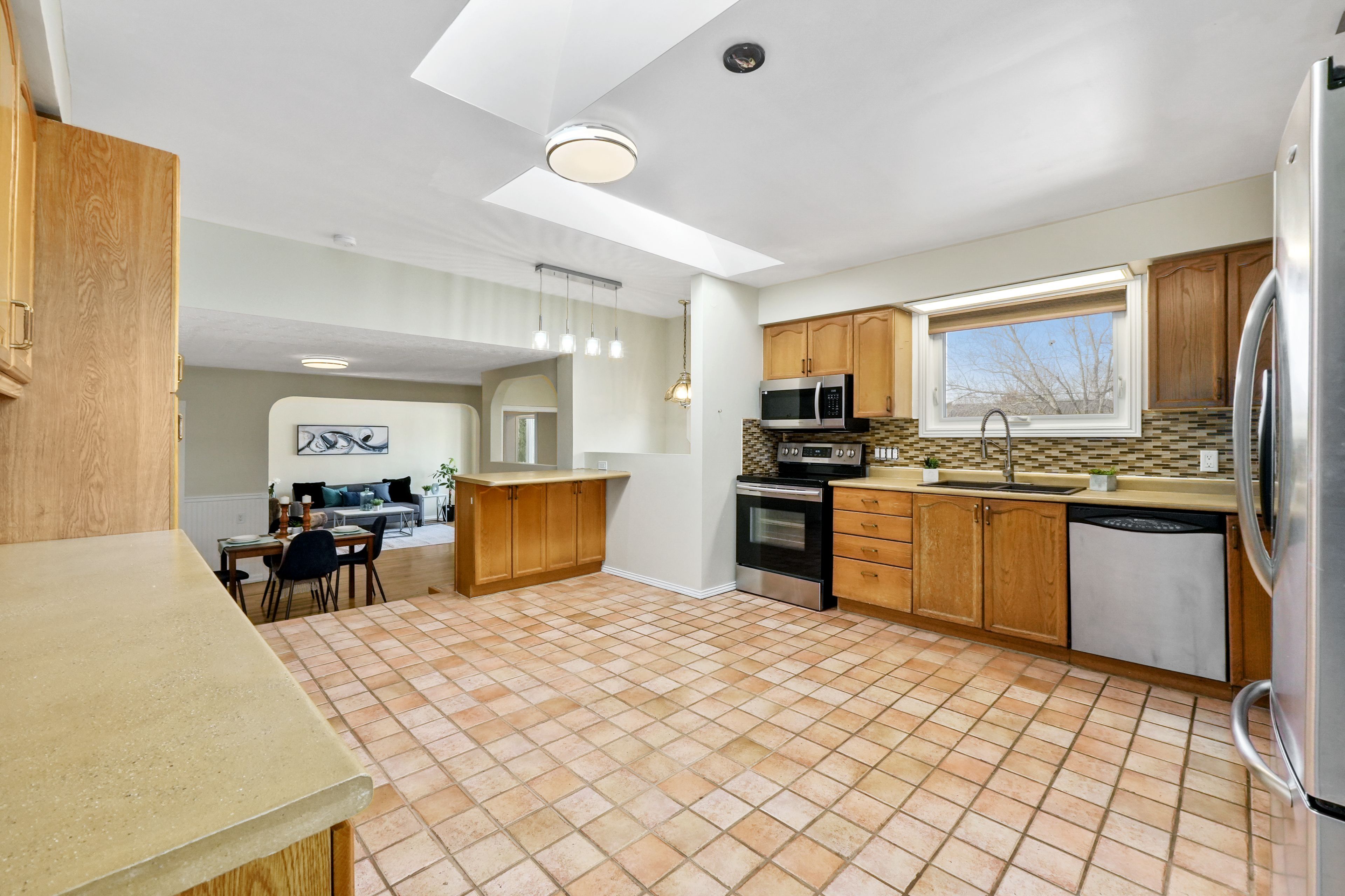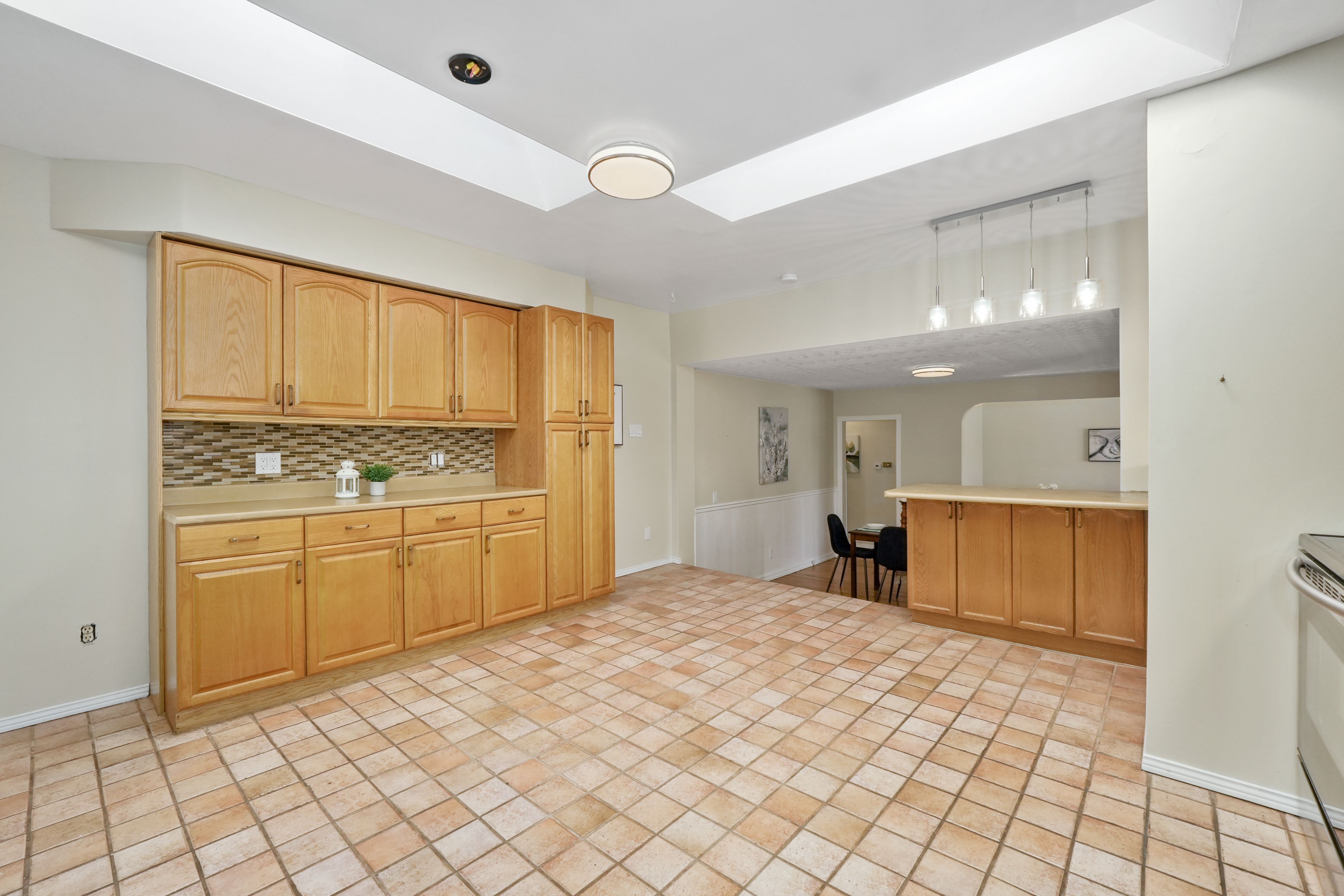• Spacious kitchen filled with natural light, skylights, and a breakfast bar.