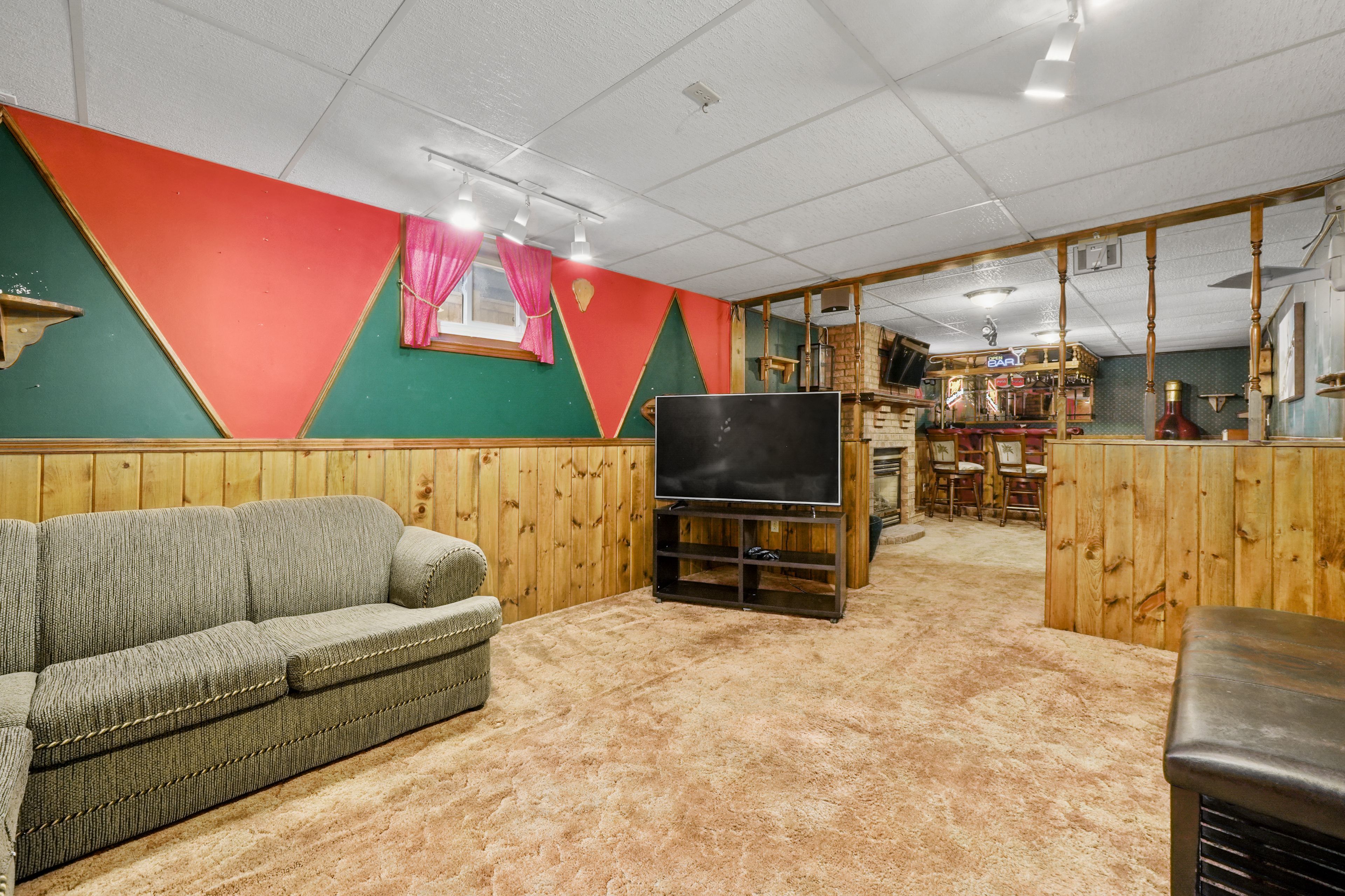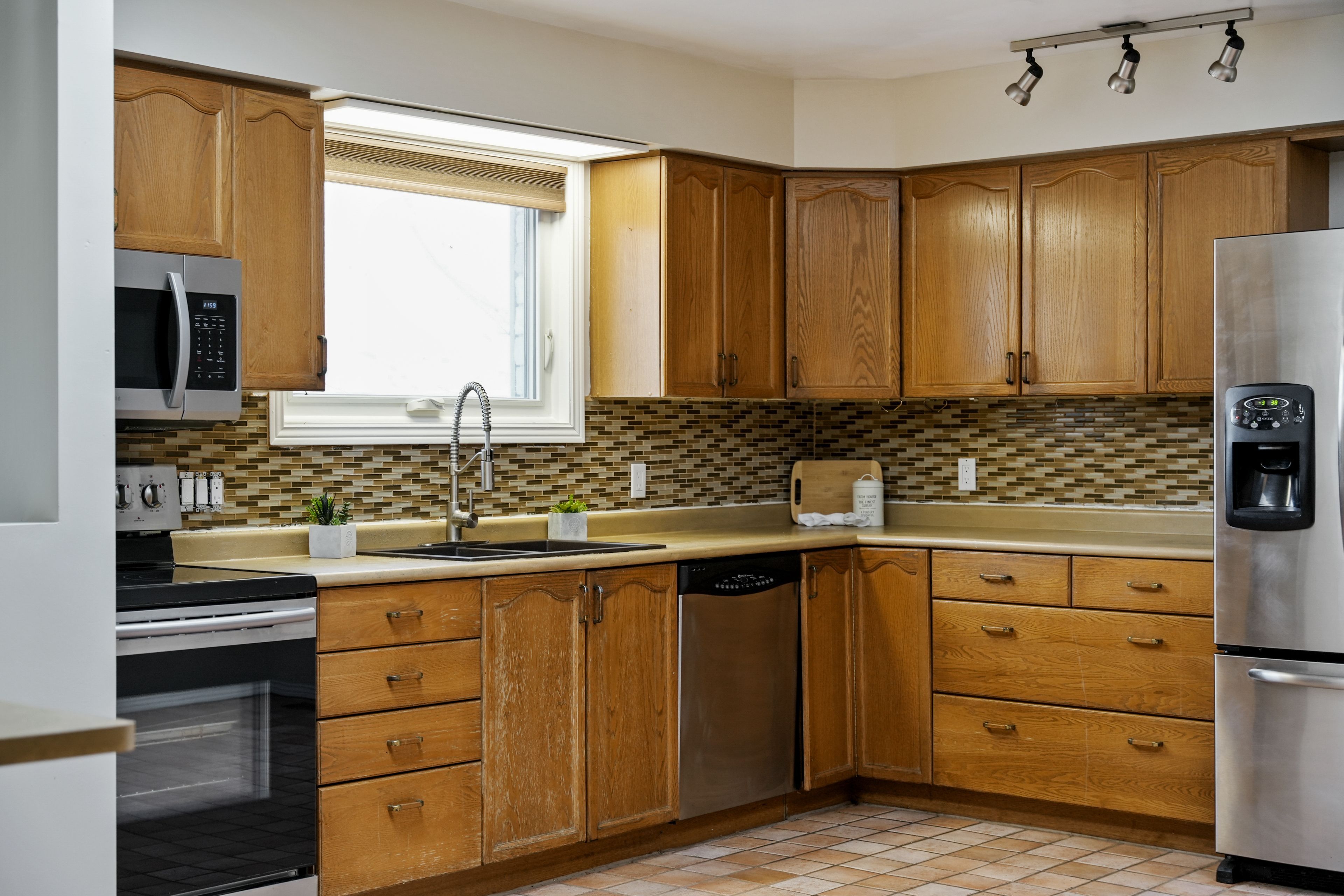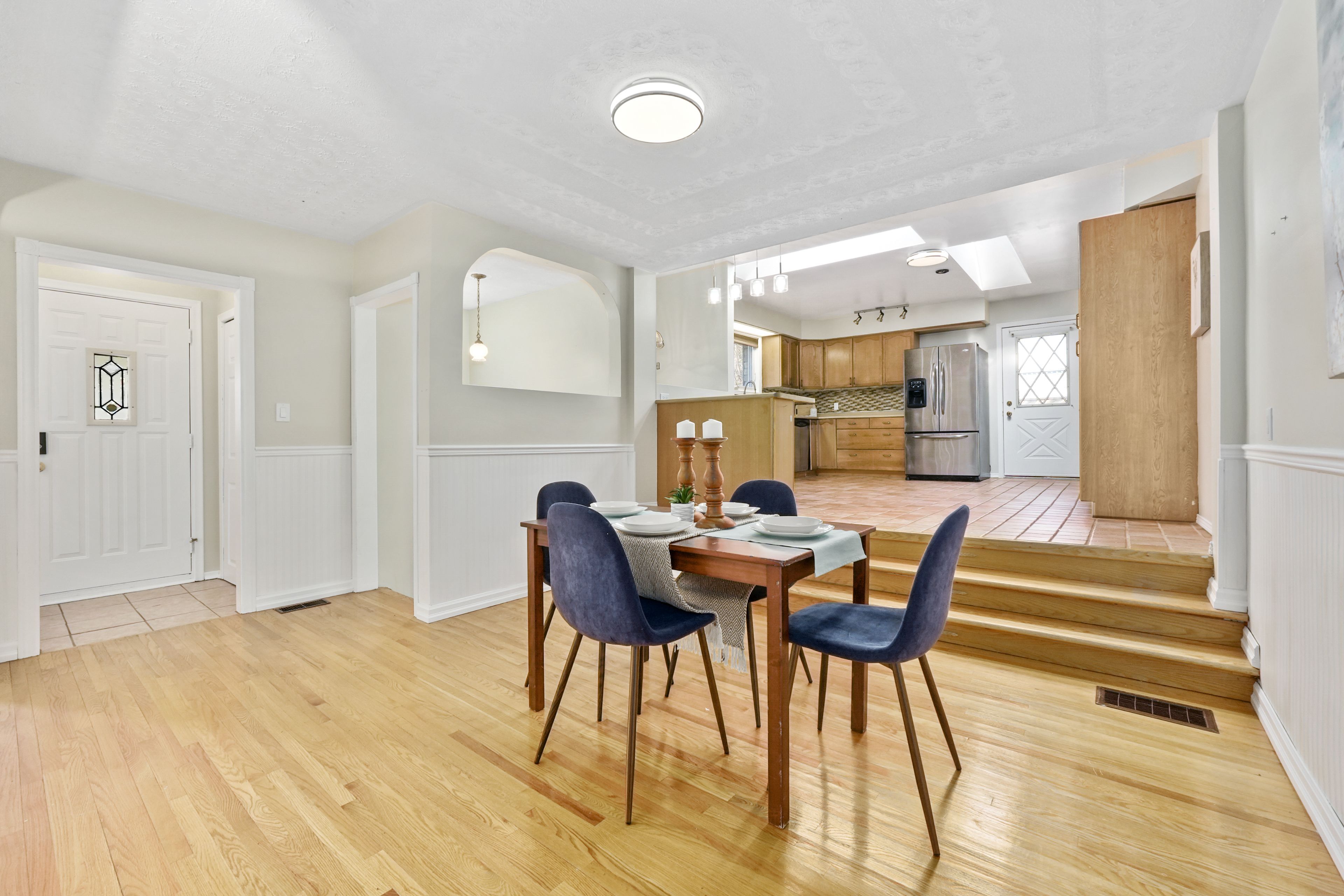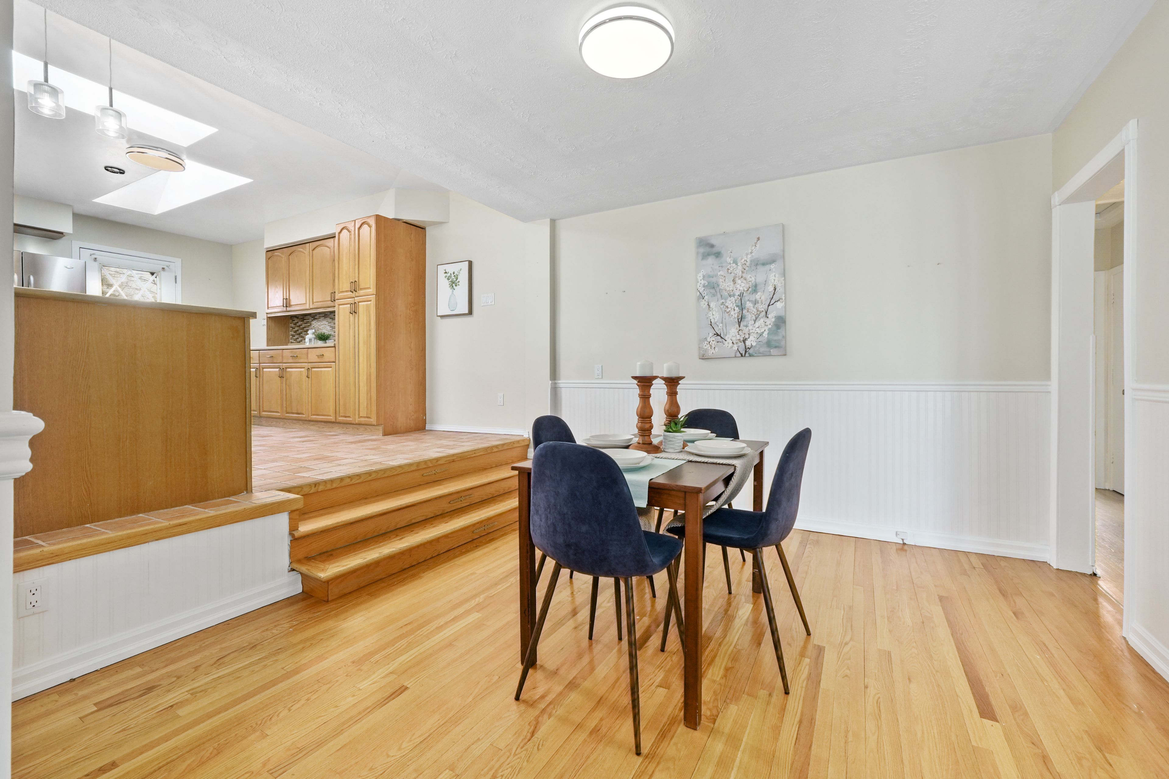 • Spacious kitchen filled with natural light, skylights, and a breakfast bar.