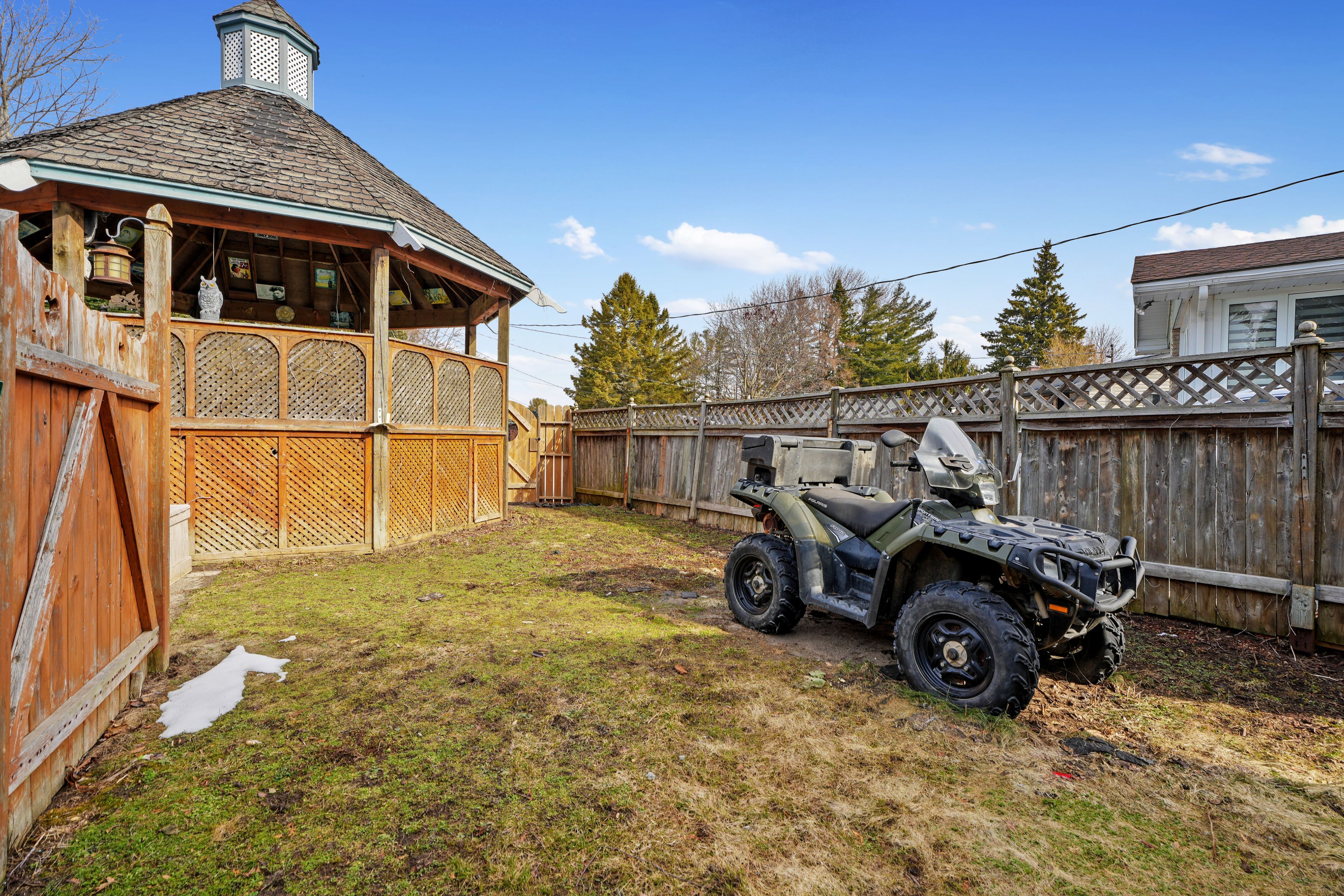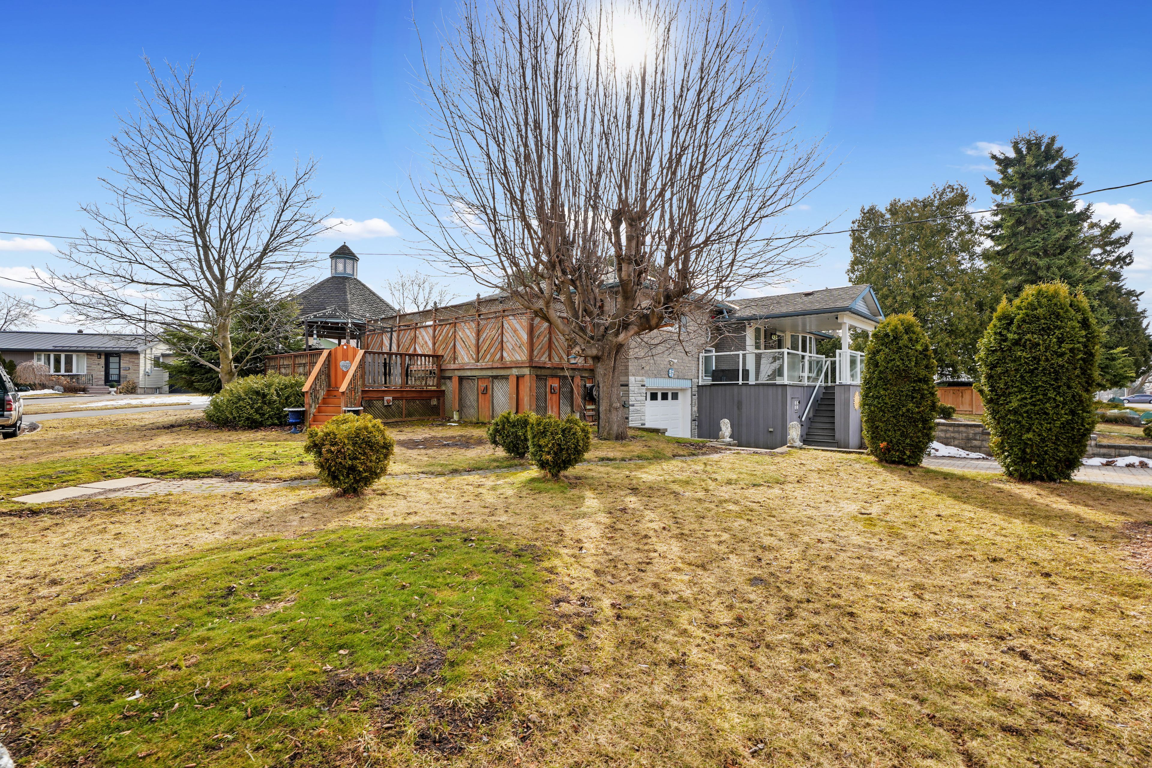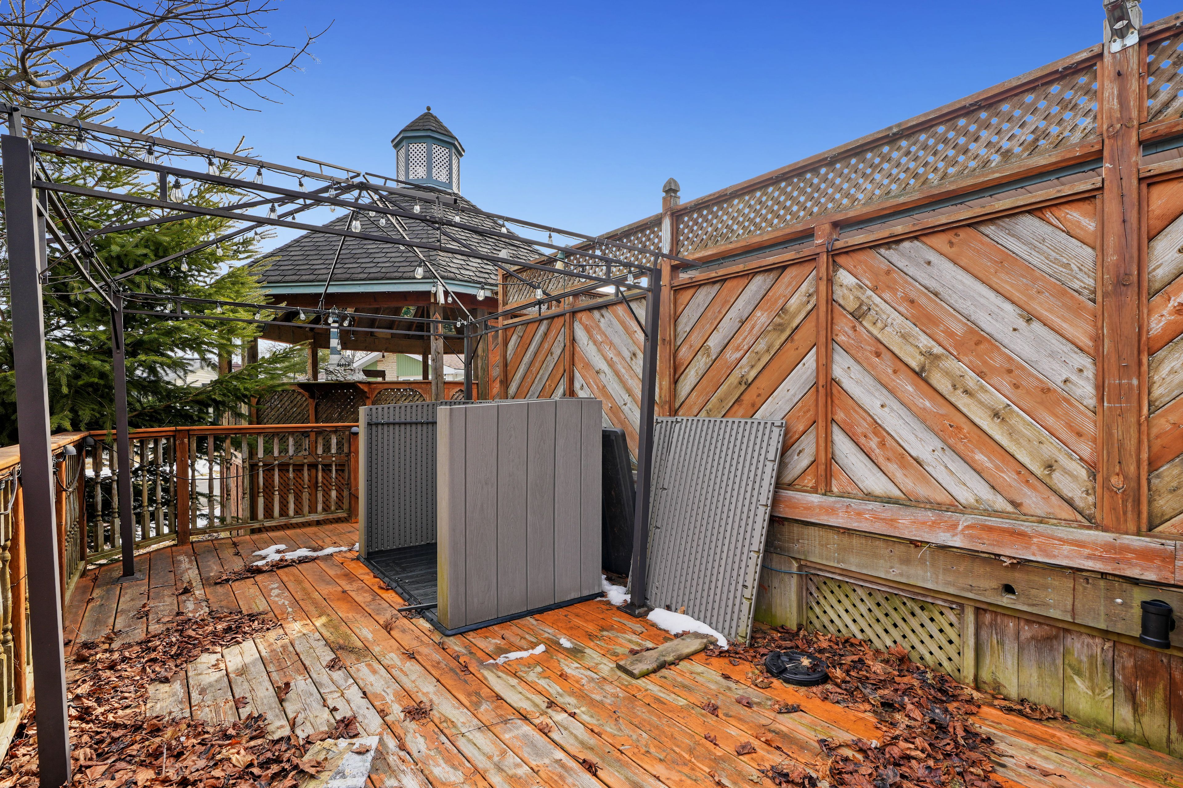 • Fenced backyard with a deck, gazebo, and patio for outdoor enjoyment.