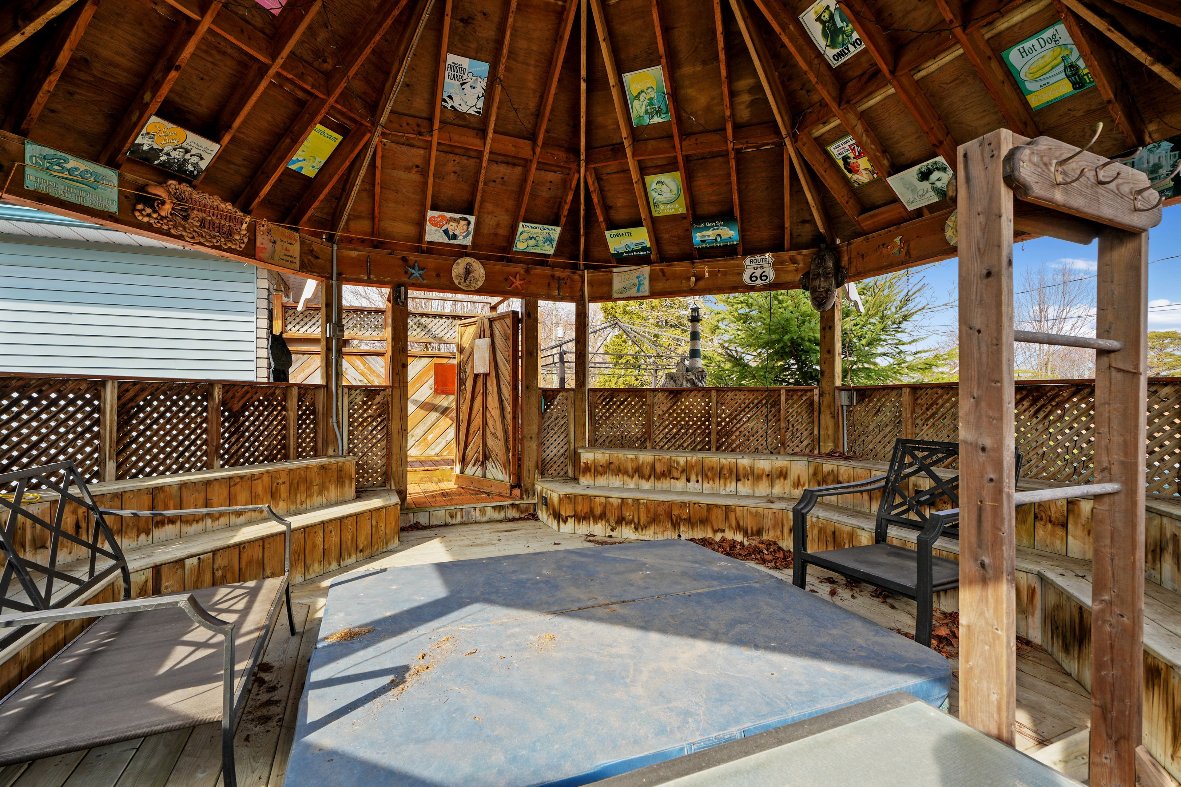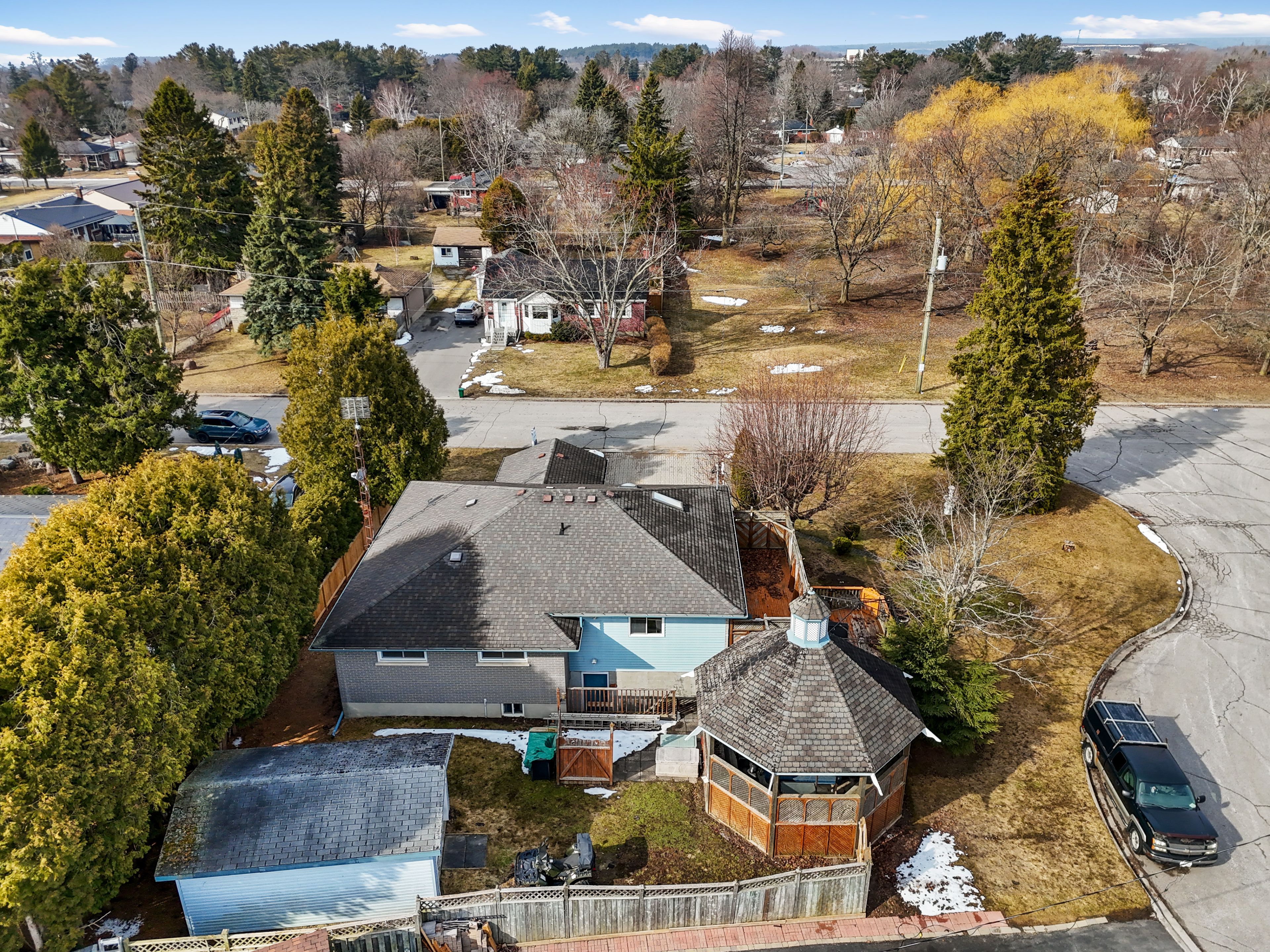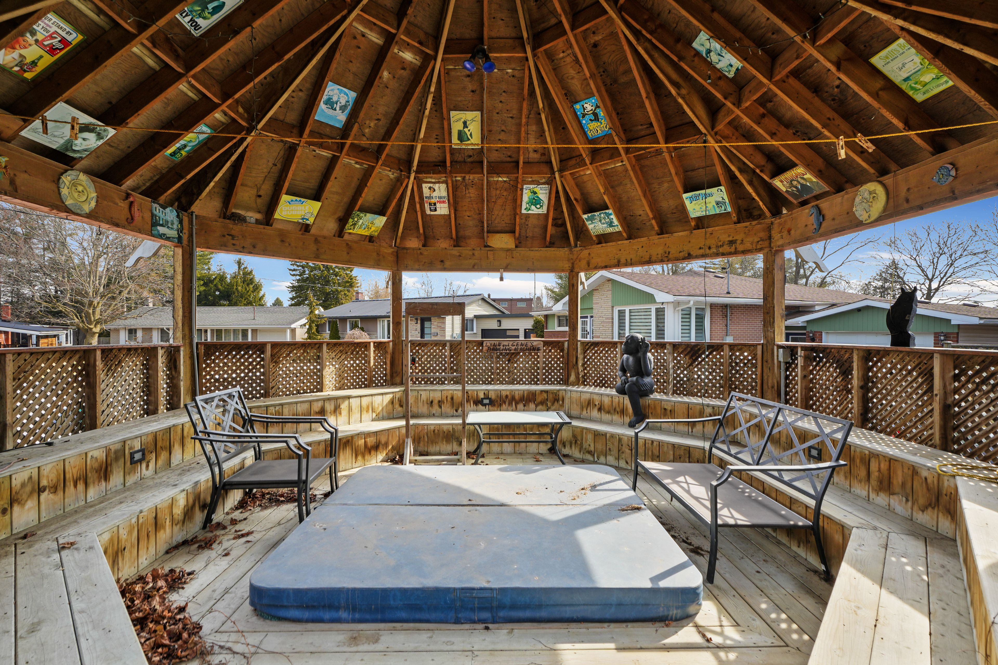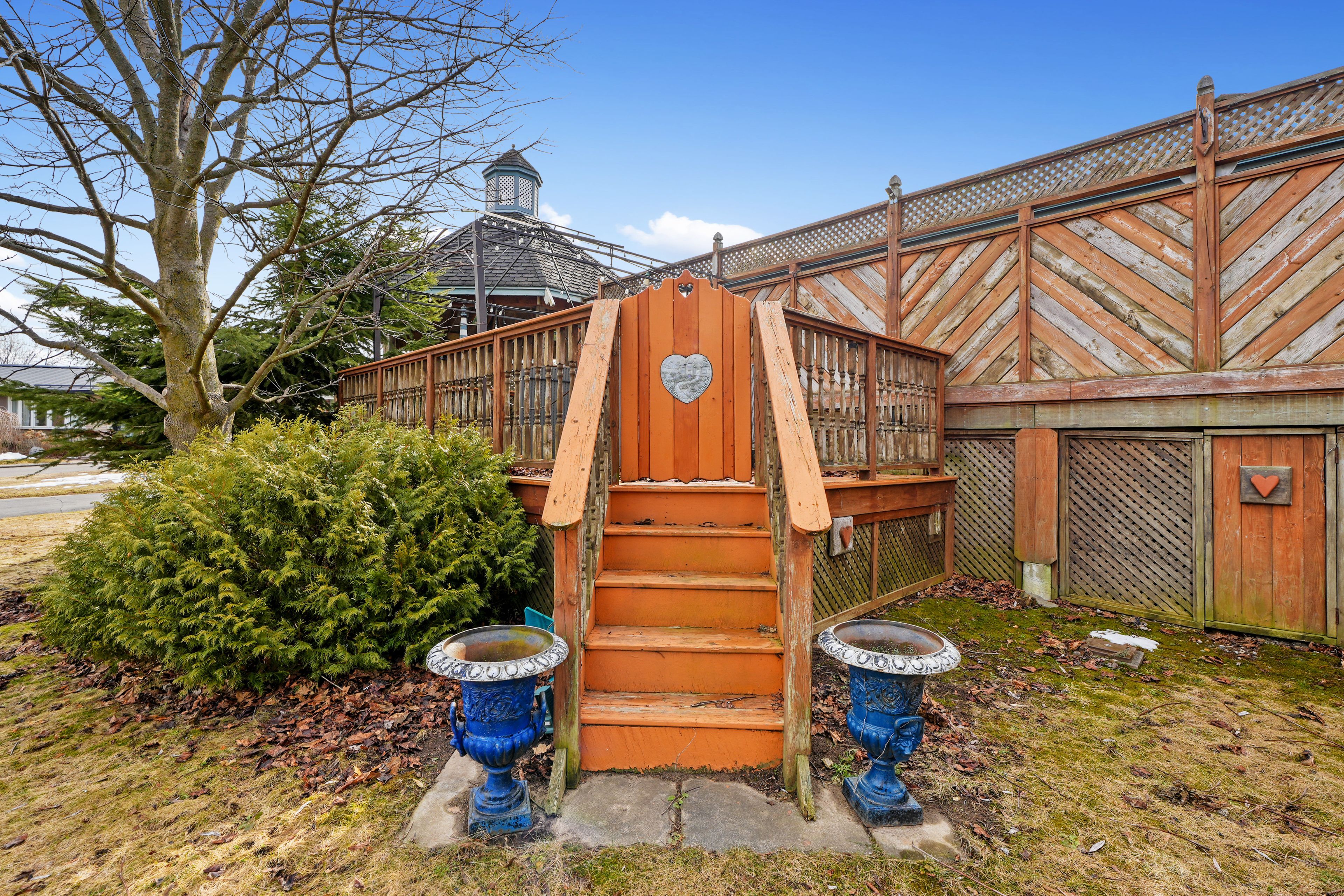 • Fenced backyard with a deck, gazebo, and patio for outdoor enjoyment.