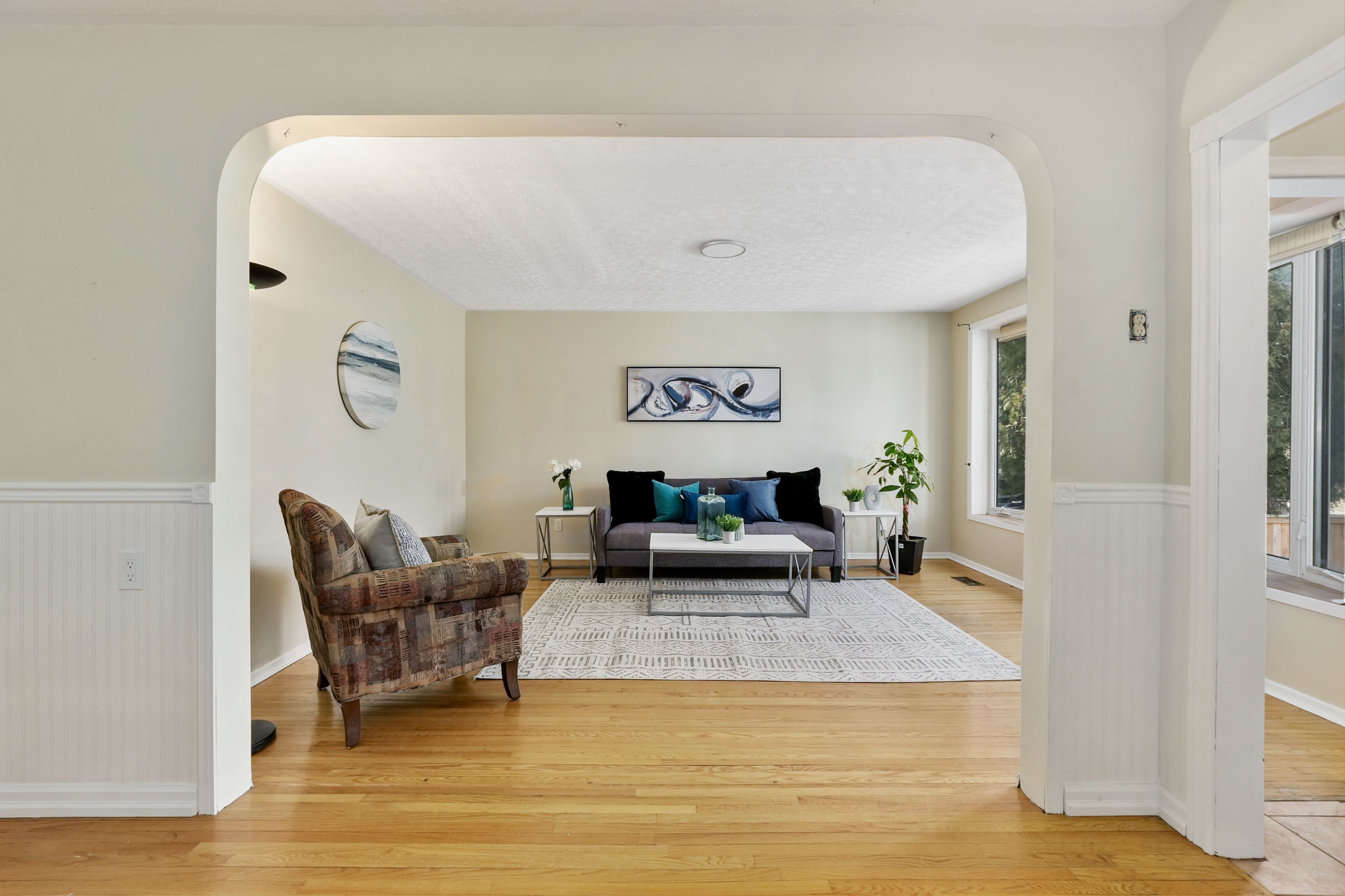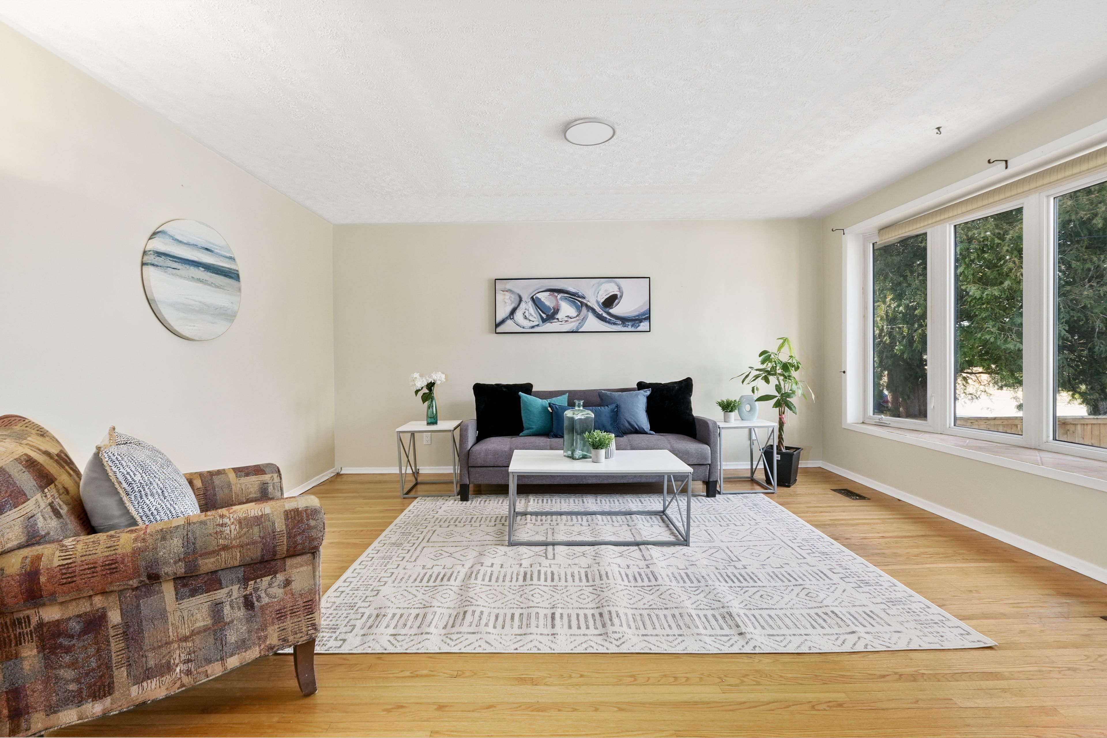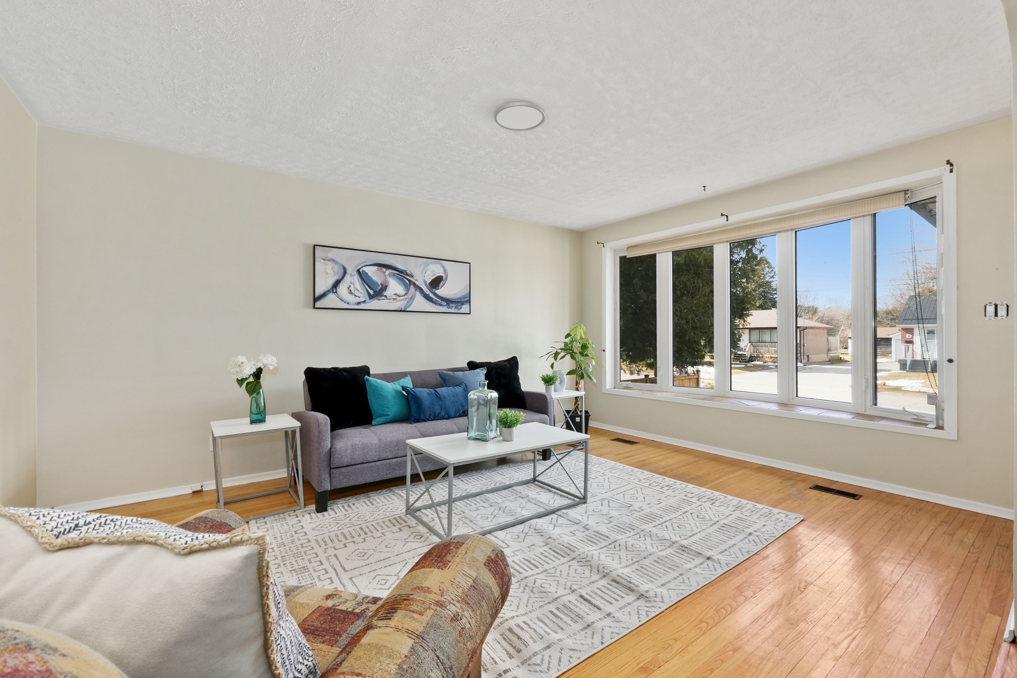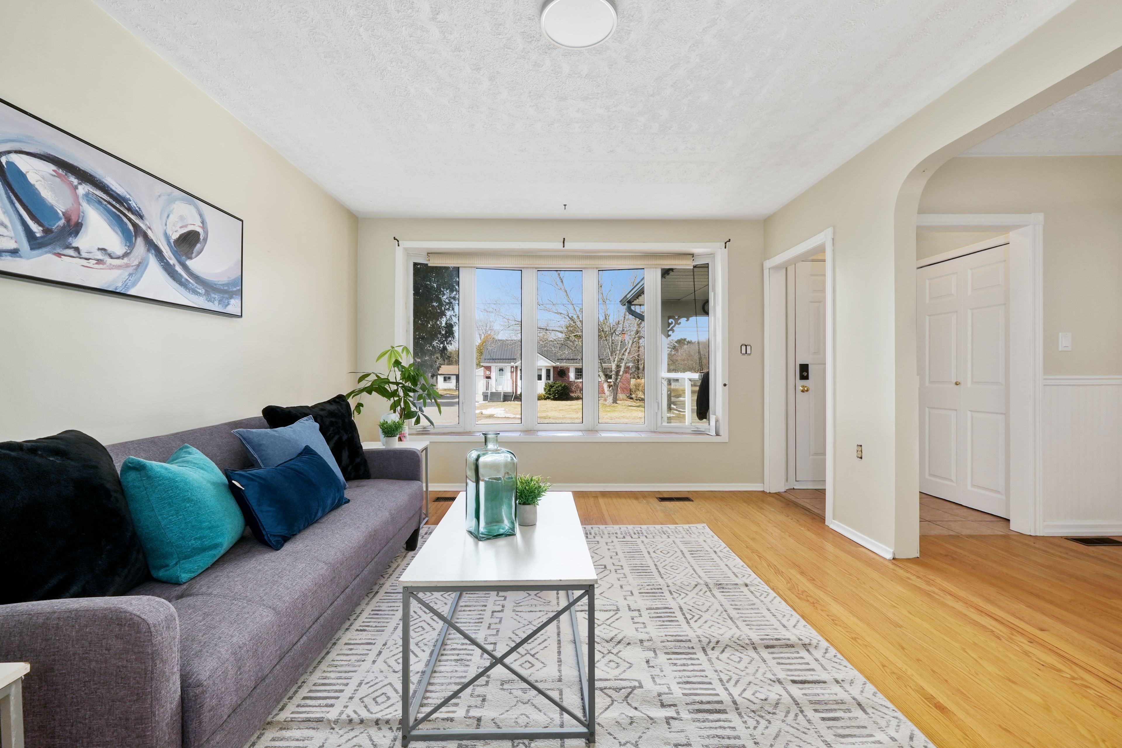 • Bright living room with a charming bay window and carpet-free flooring.