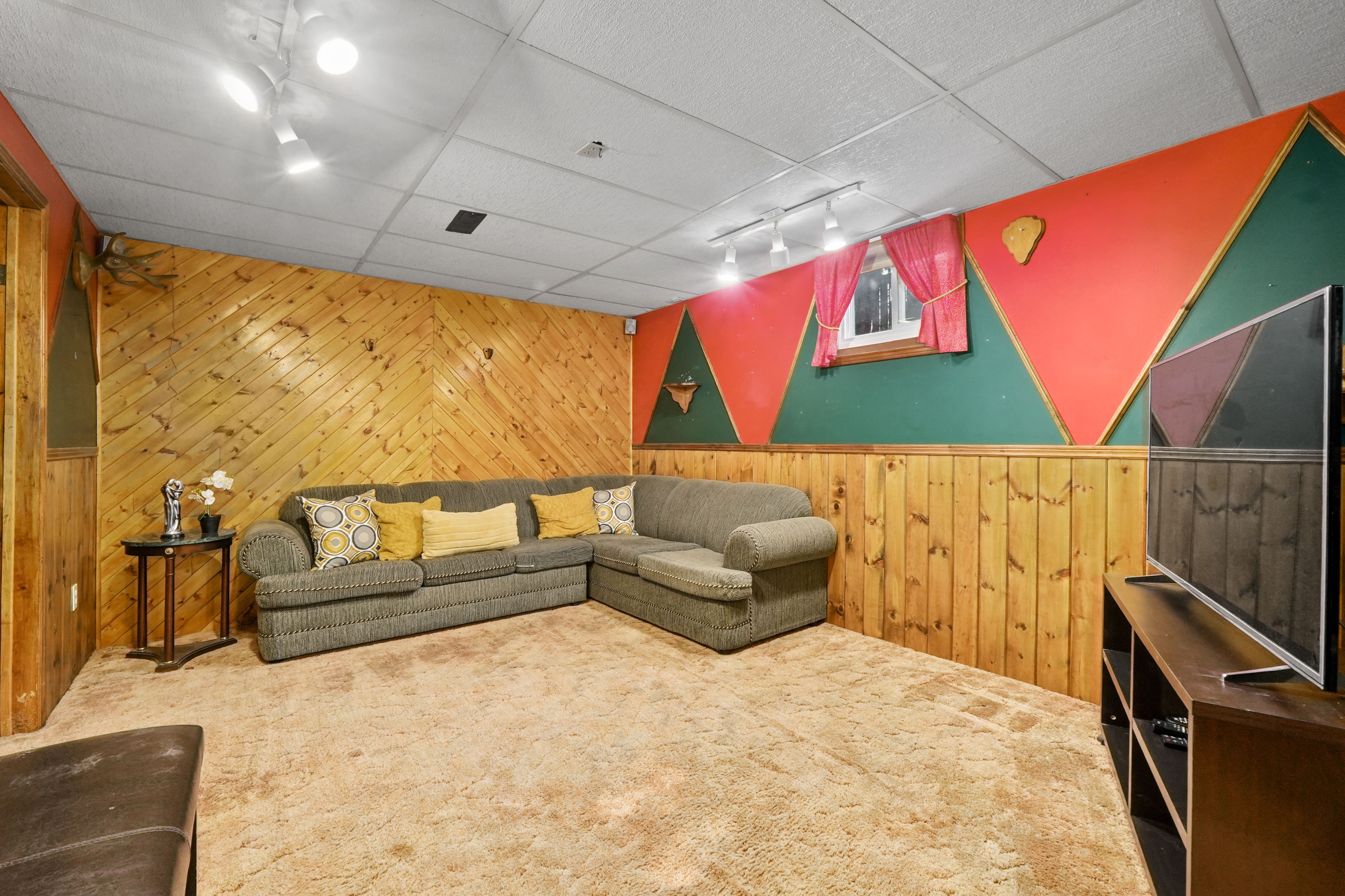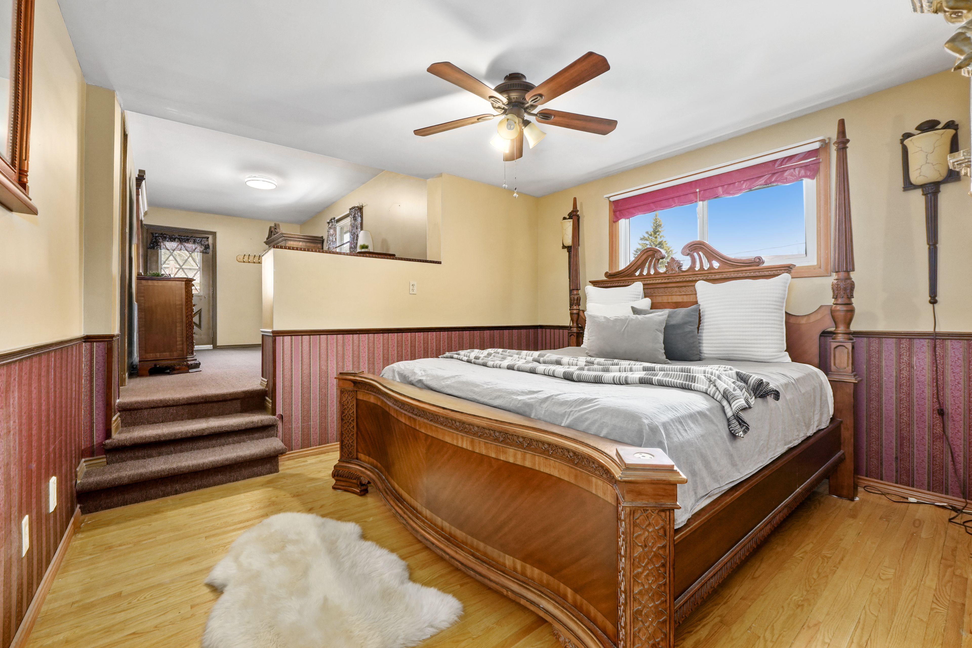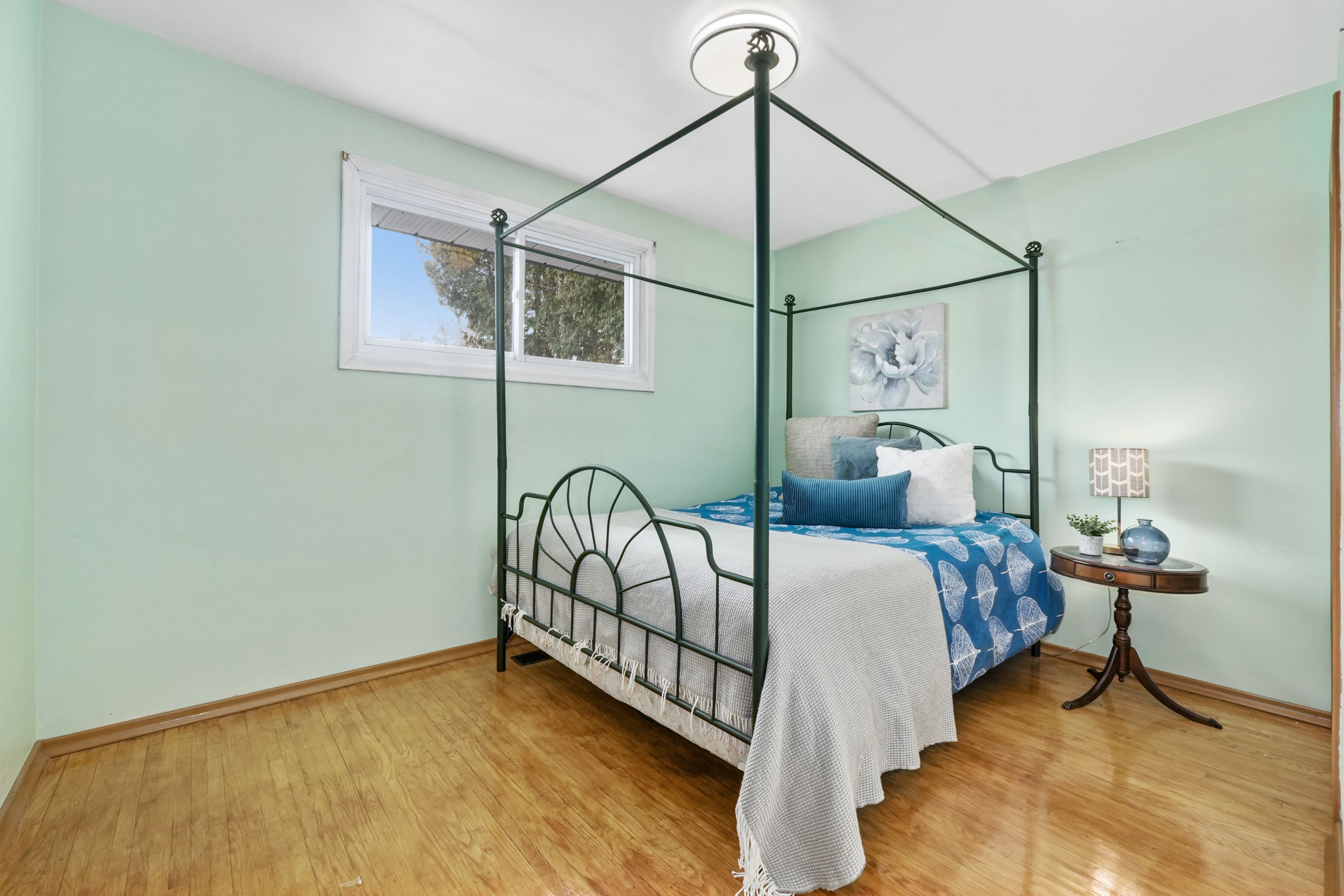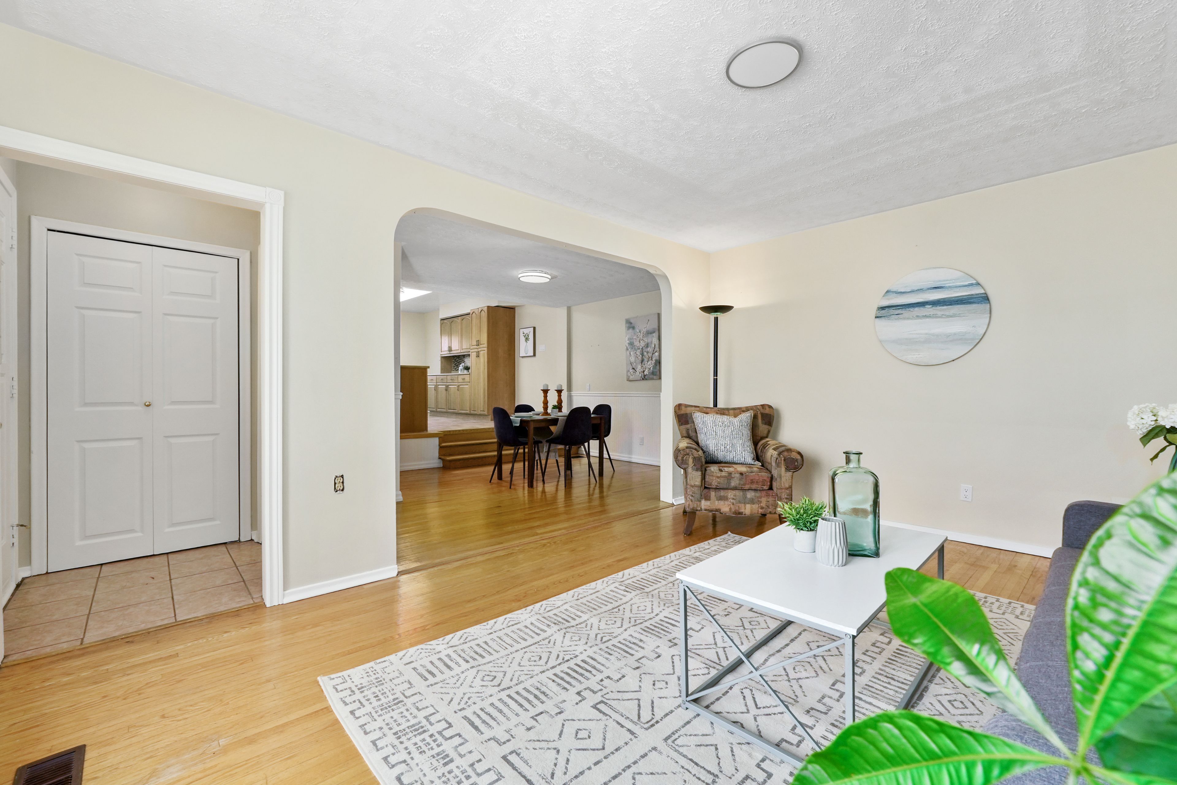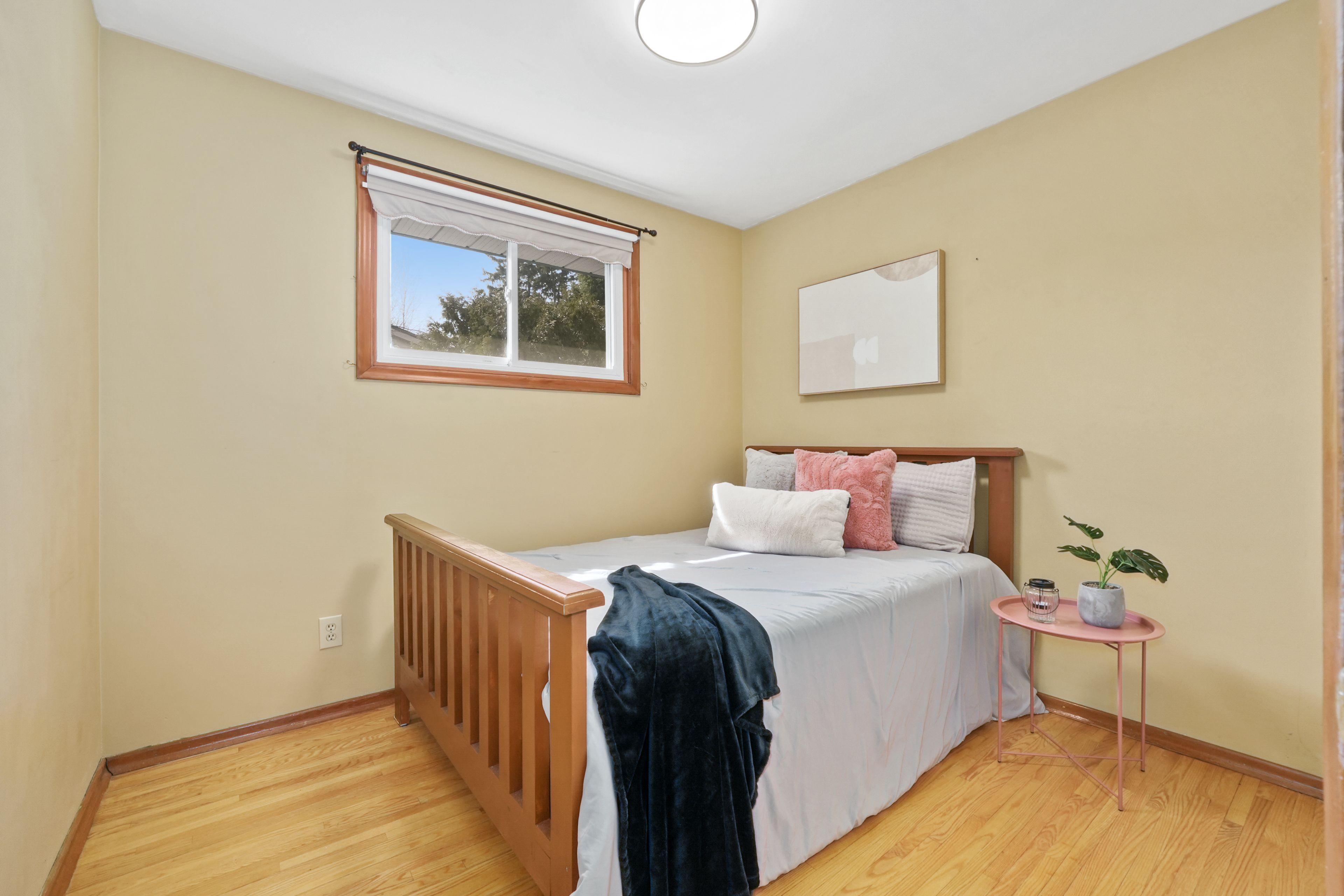 • Bright living room with a charming bay window and carpet-free flooring.