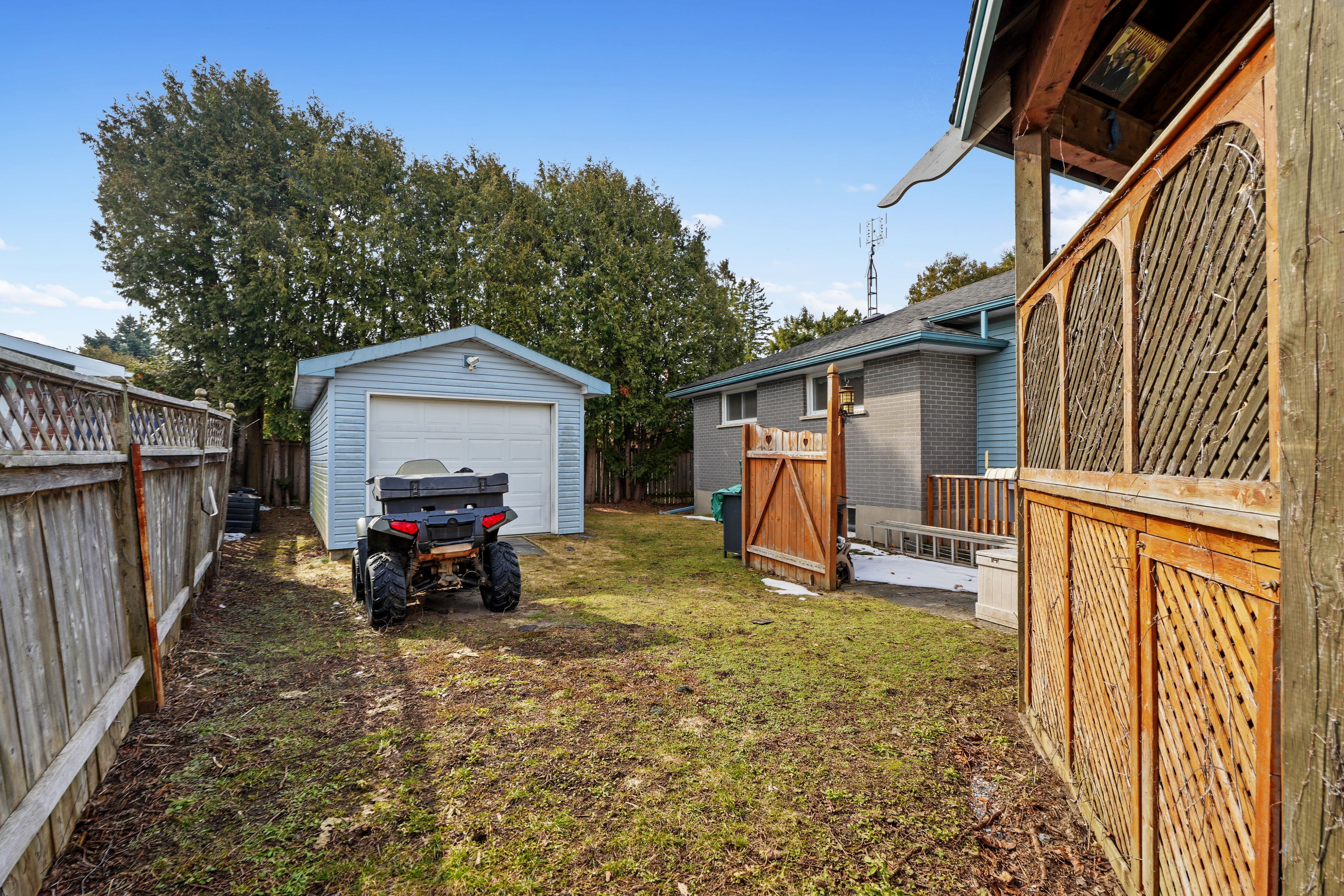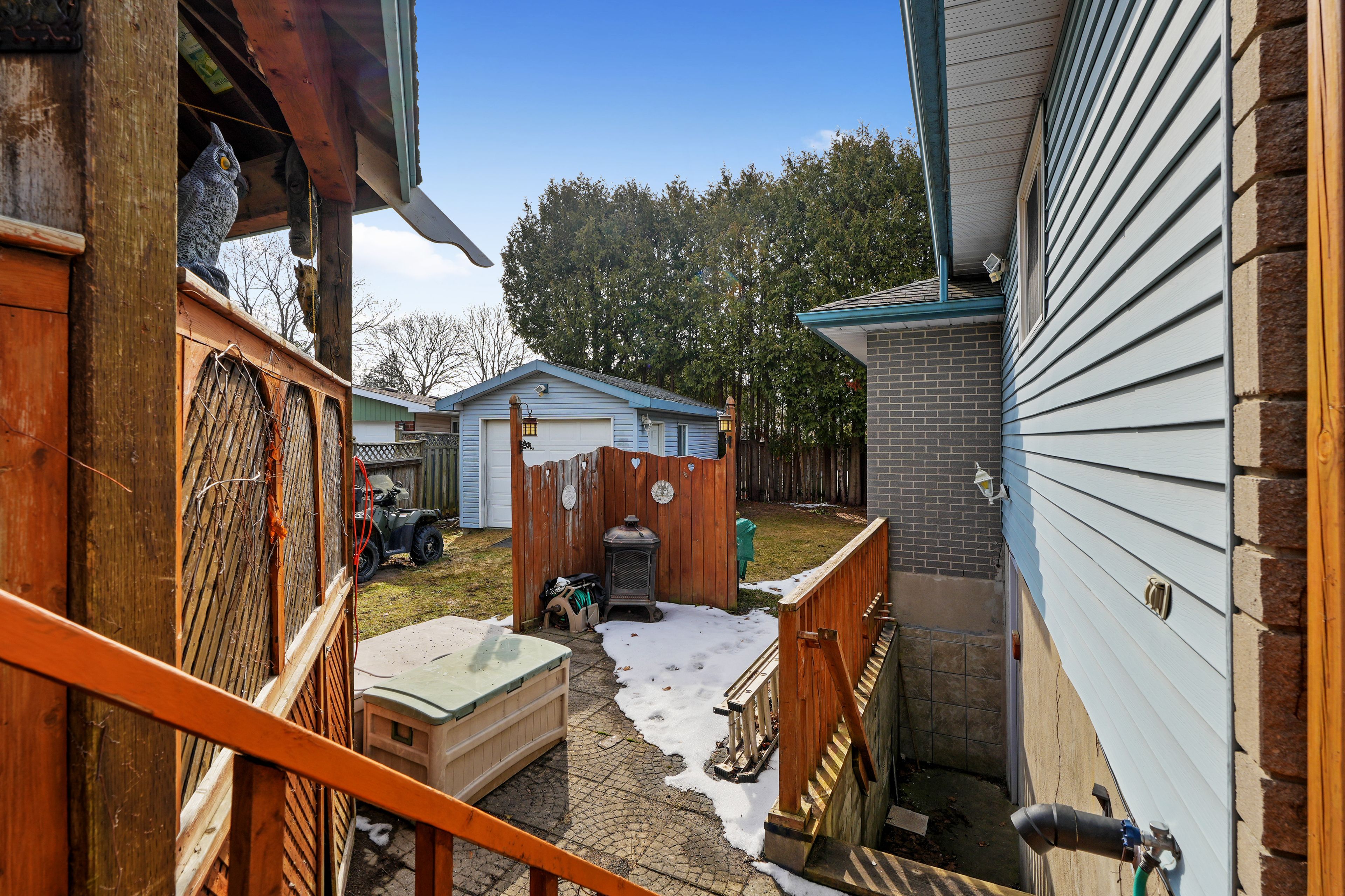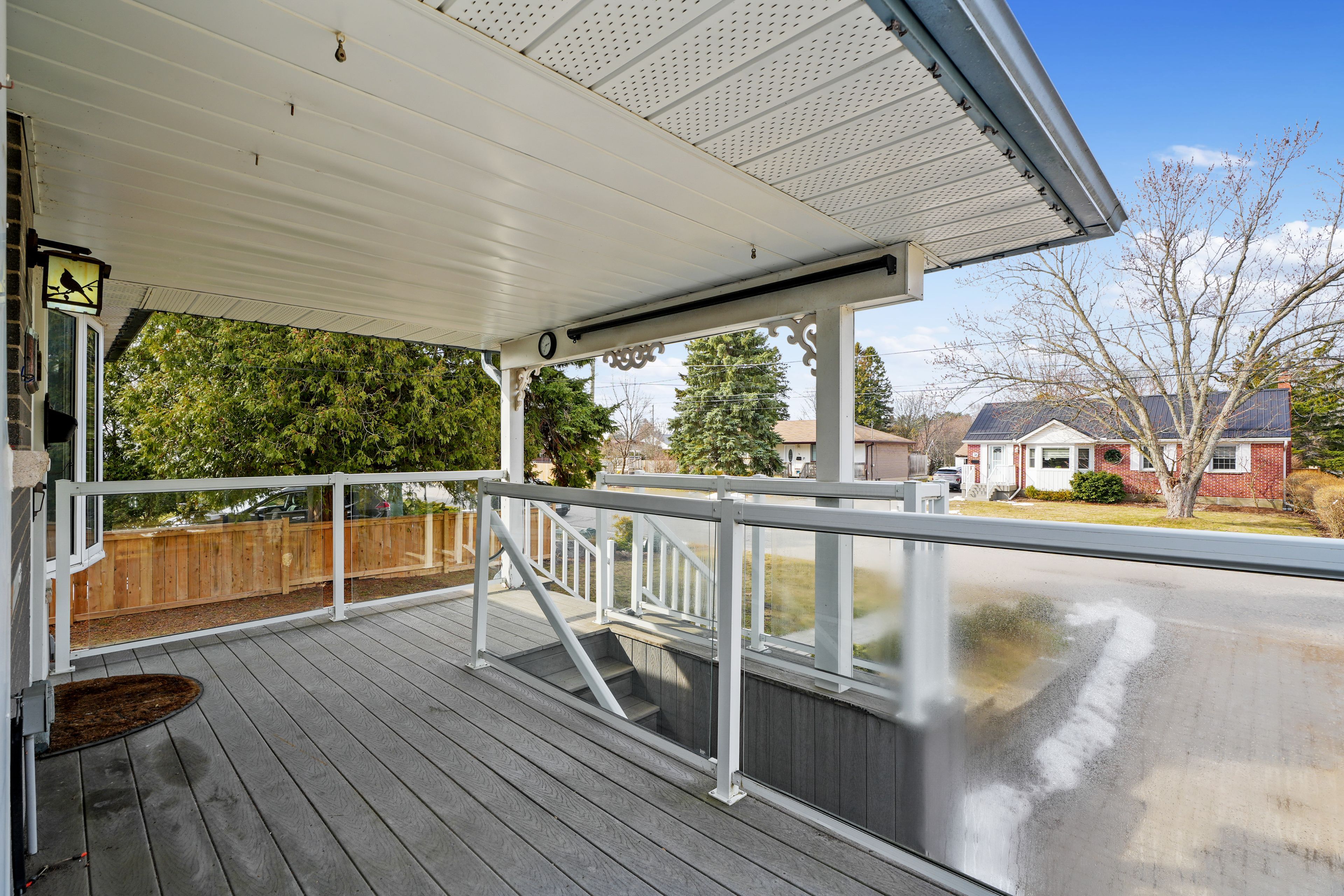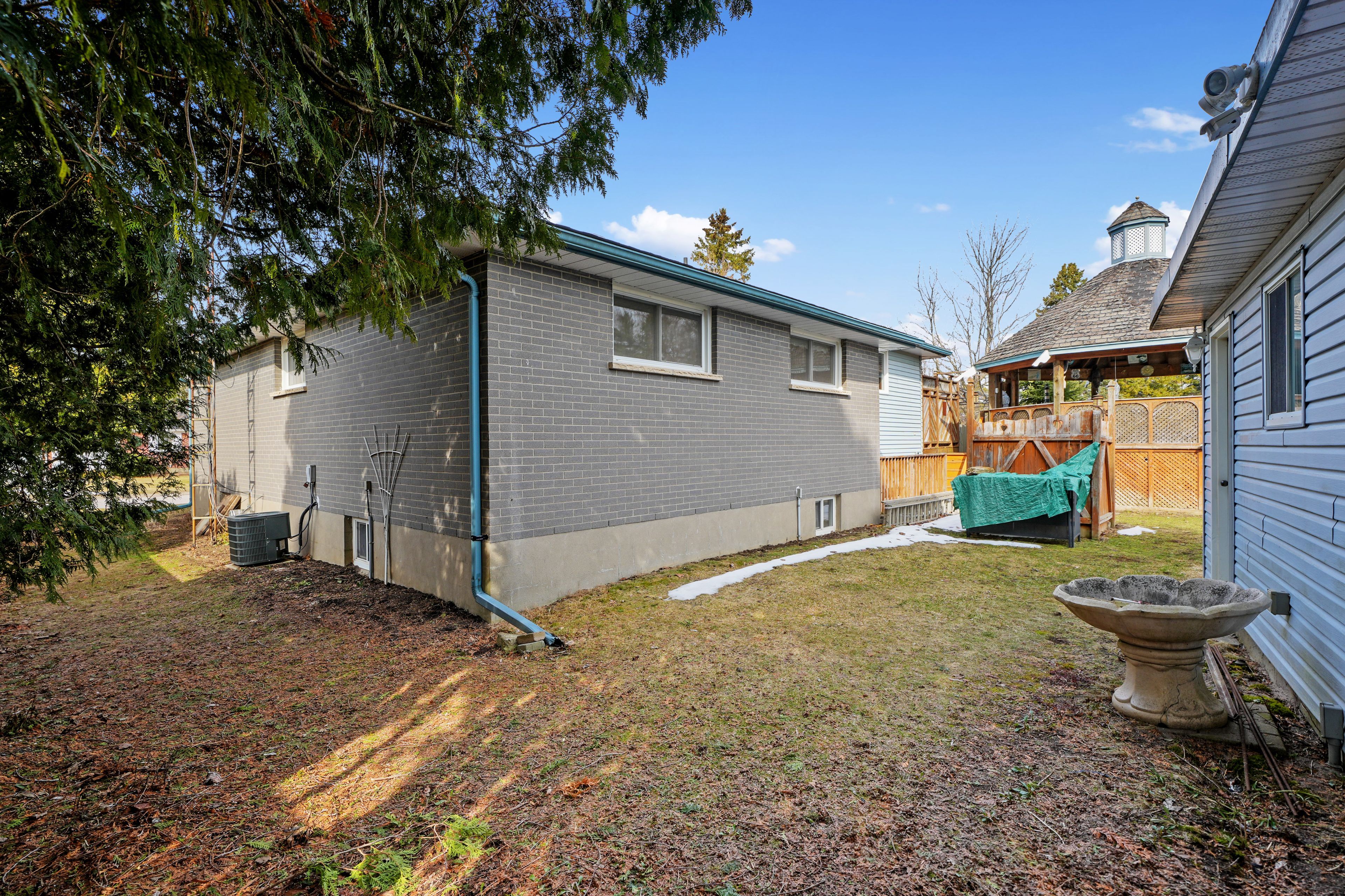 Set in a quiet, family-friendly community, this well-appointed home offers thoughtful living space on both levels, along with a separate entrance to the finished lower level. A large covered front porch creates the perfect setting for slow mornings with coffee and relaxed evenings. Inside, the living room is bright and inviting with a charming bay window, carpet-free flooring, and a gently arched entrance that adds architectural character. The dining room features classic wainscotting and flows seamlessly into the elevated kitchen. The kitchen is both spacious and full of natural light, highlighted by multiple skylights and a walkout that connects effortlessly to the outdoor living space. Stainless steel appliances, ample counter and cupboard space, and a breakfast bar with pendant lighting make it as functional as it is welcoming. The main floor includes a primary suite complete with a dressing area or office space, its own walkout, and a private ensuite bathroom. Two additional bedrooms and a full bathroom complete this level. Downstairs, the finished lower level is designed for entertaining and everyday living, featuring a rec room with warm wood trim, a full built-in bar, fireplace, and a separate media area. The laundry room offers extra storage. A guest bathroom with a shower enclosure completes the space. Outside, the fenced backyard provides privacy and room to enjoy, with a wide deck that wraps around to a covered wooden gazebo, a patio area, and a detached garage ideal for recreational gear and lawn equipment. Conveniently located near amenities and with easy access to the 401, this home offers comfort, space, and versatility for modern family living.