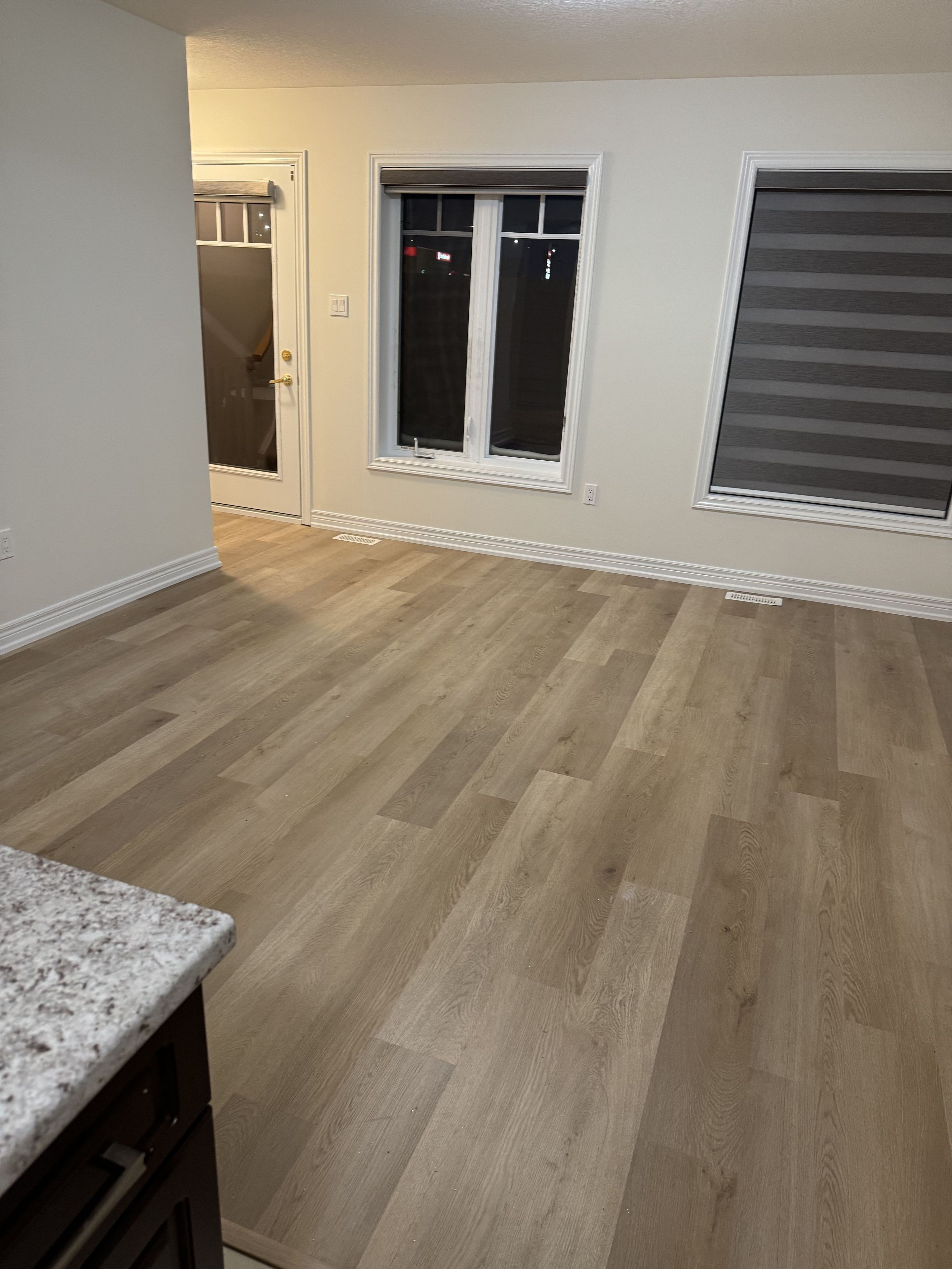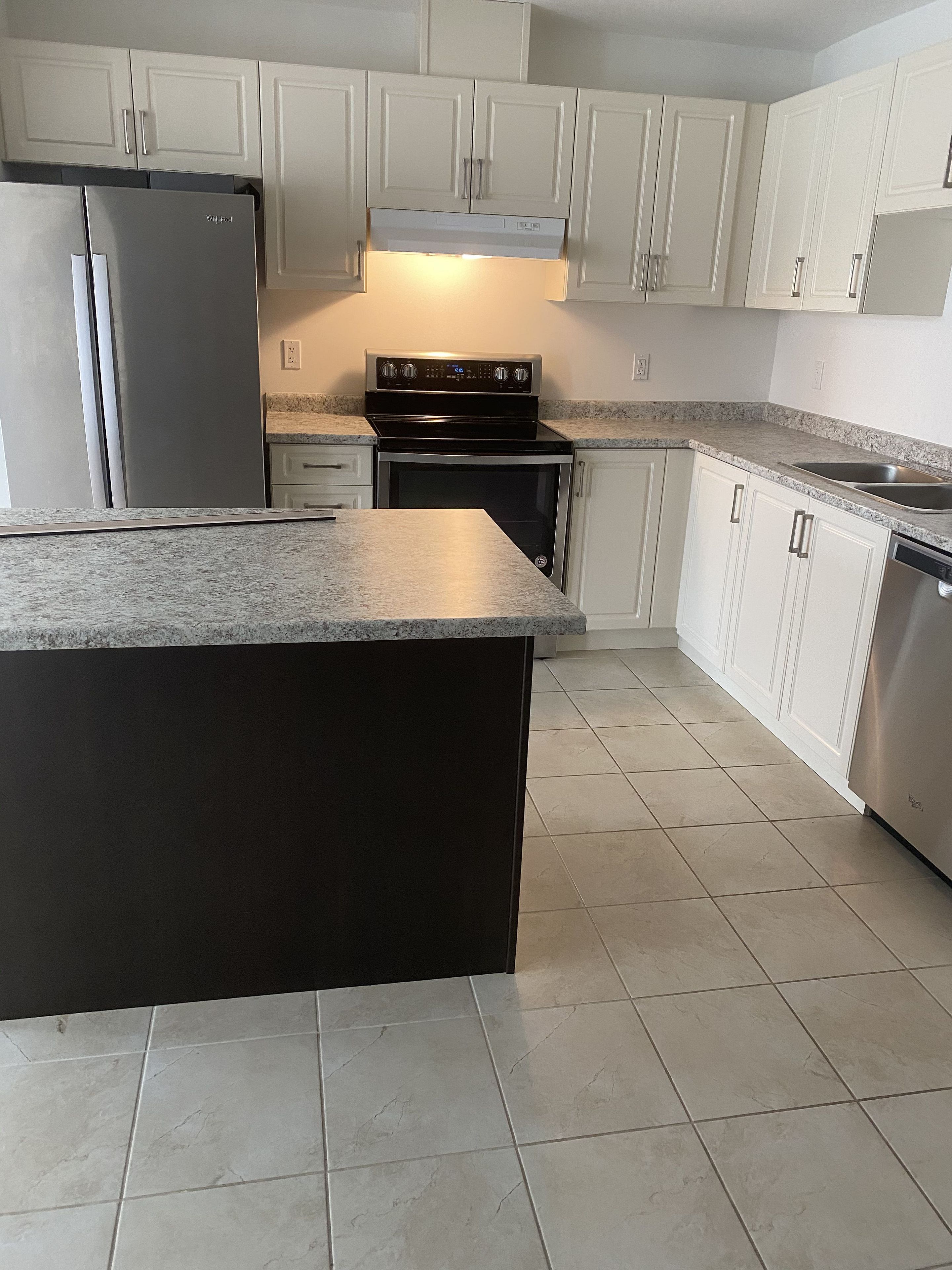 • Open-concept layout with a large eat-in kitchen and stainless steel appliances.