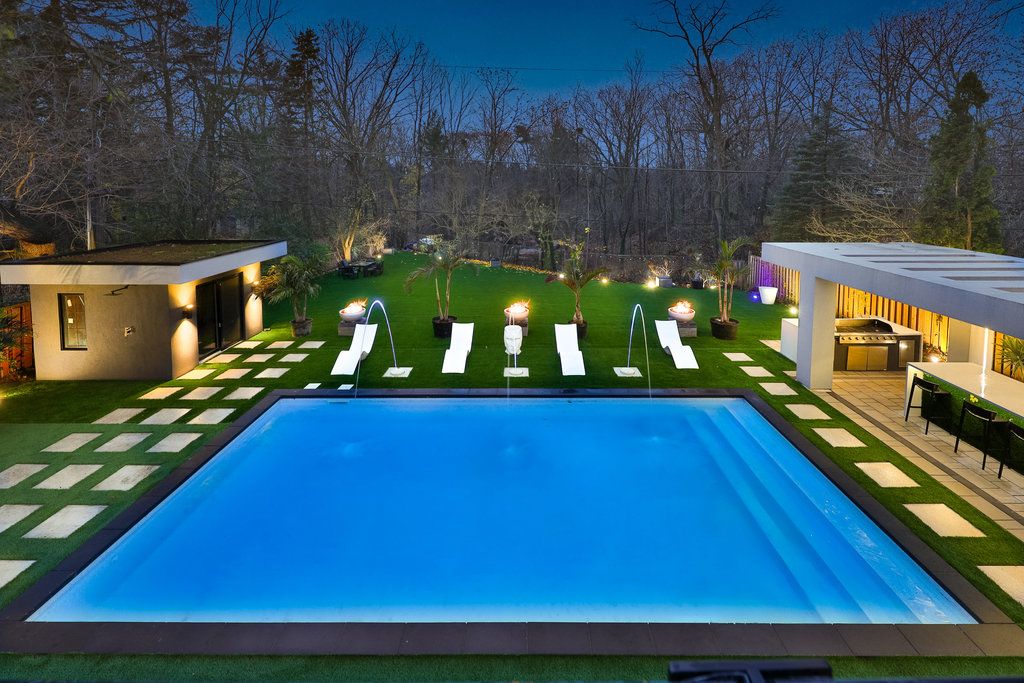 • Outdoor space includes a pool, cabana, and smart home features for convenience.