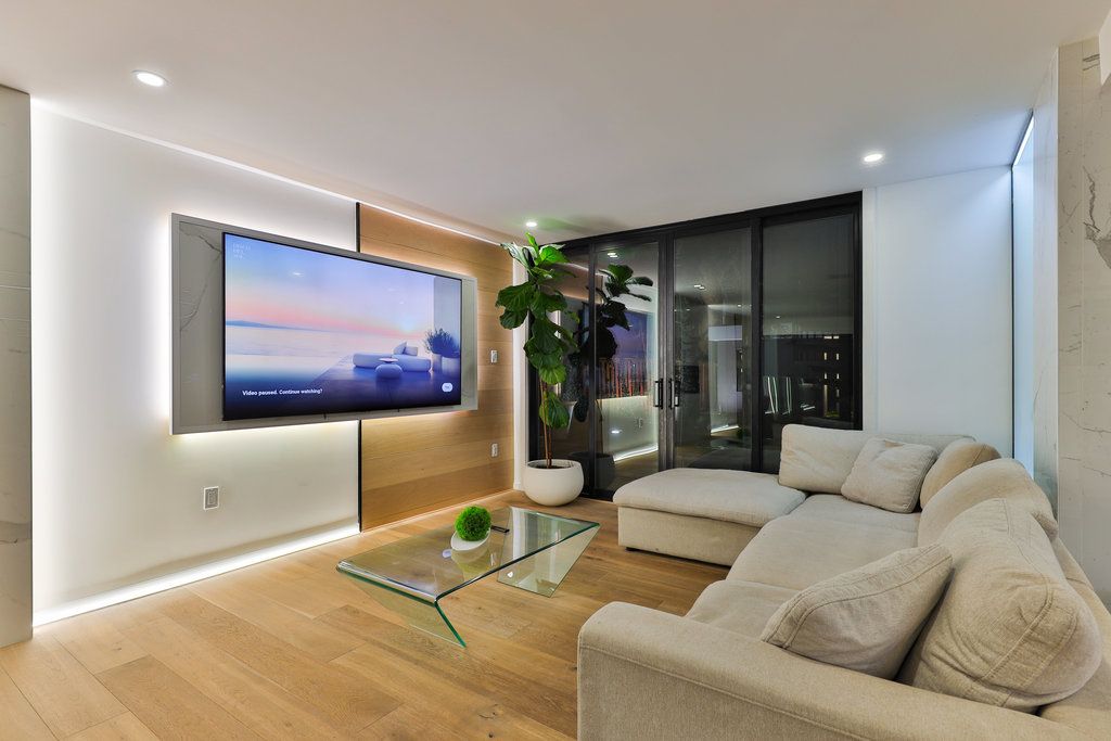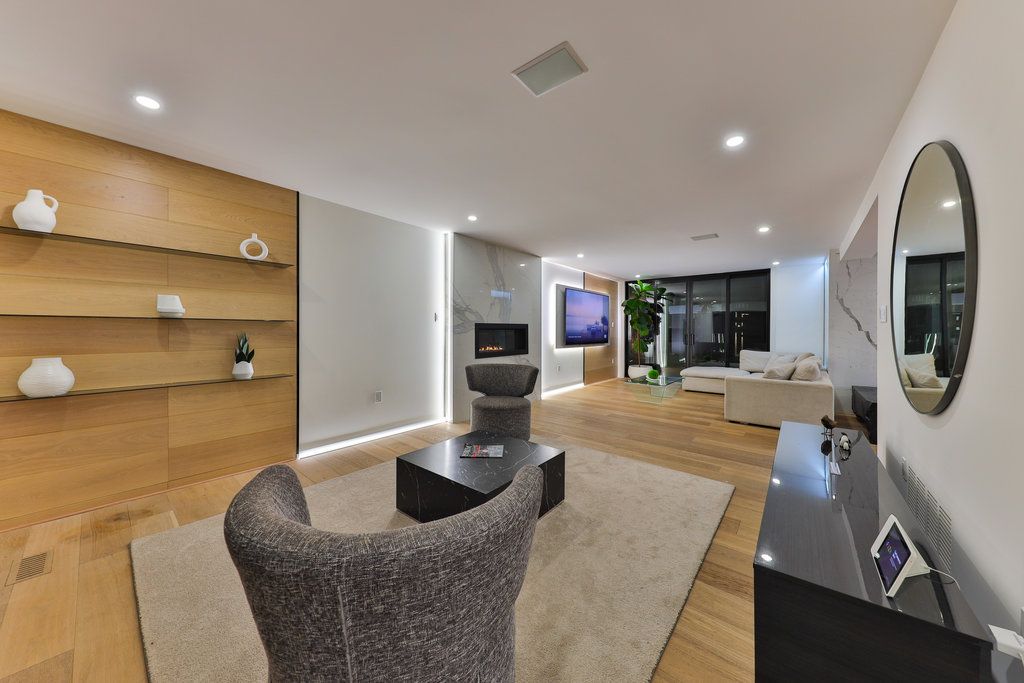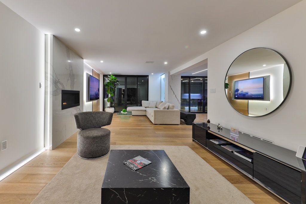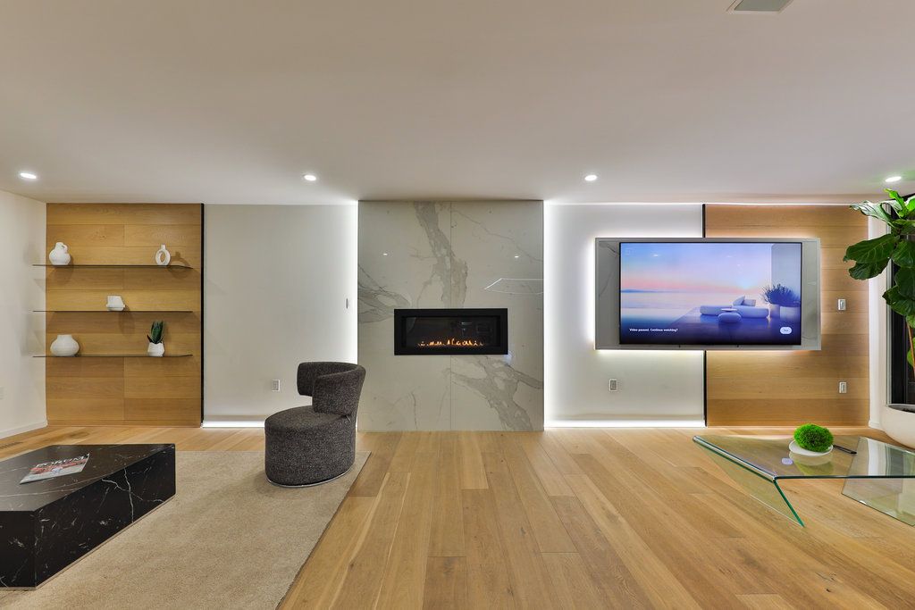 • Spacious living area featuring a dynamic gas fireplace and integrated audio.