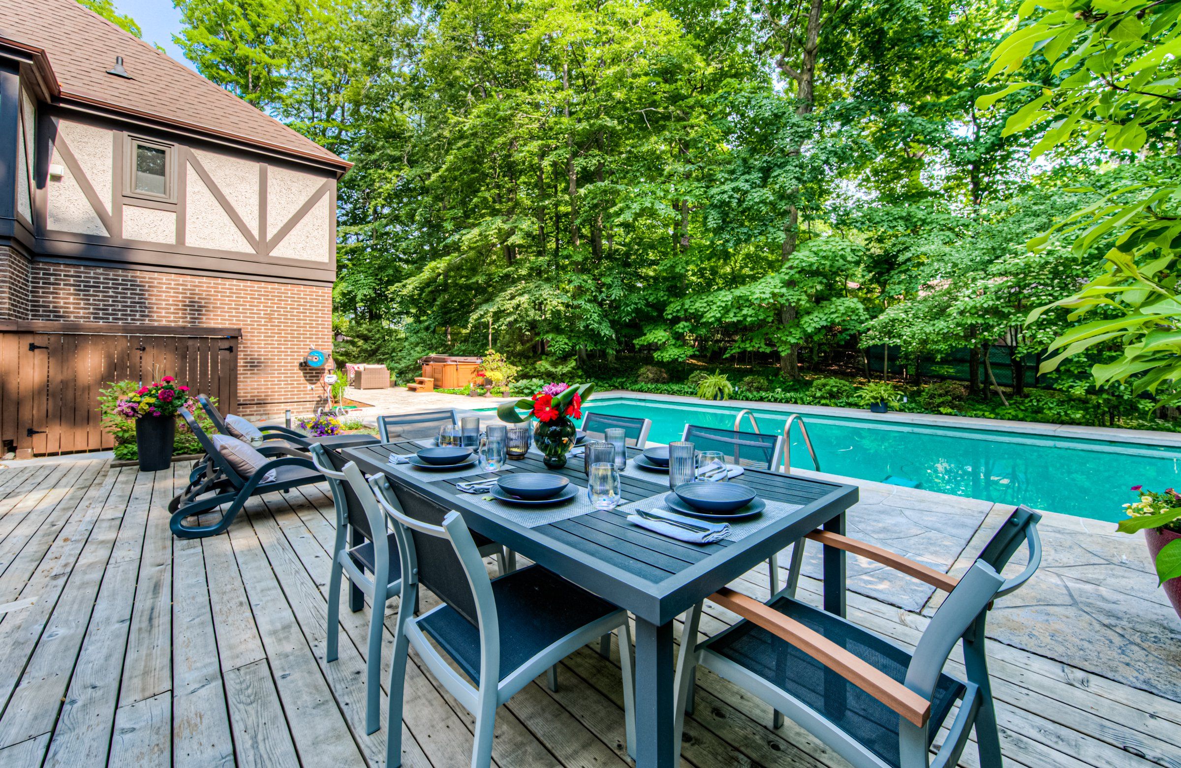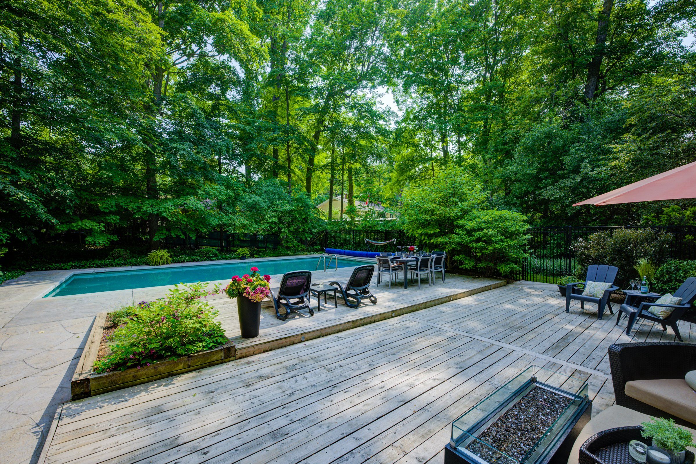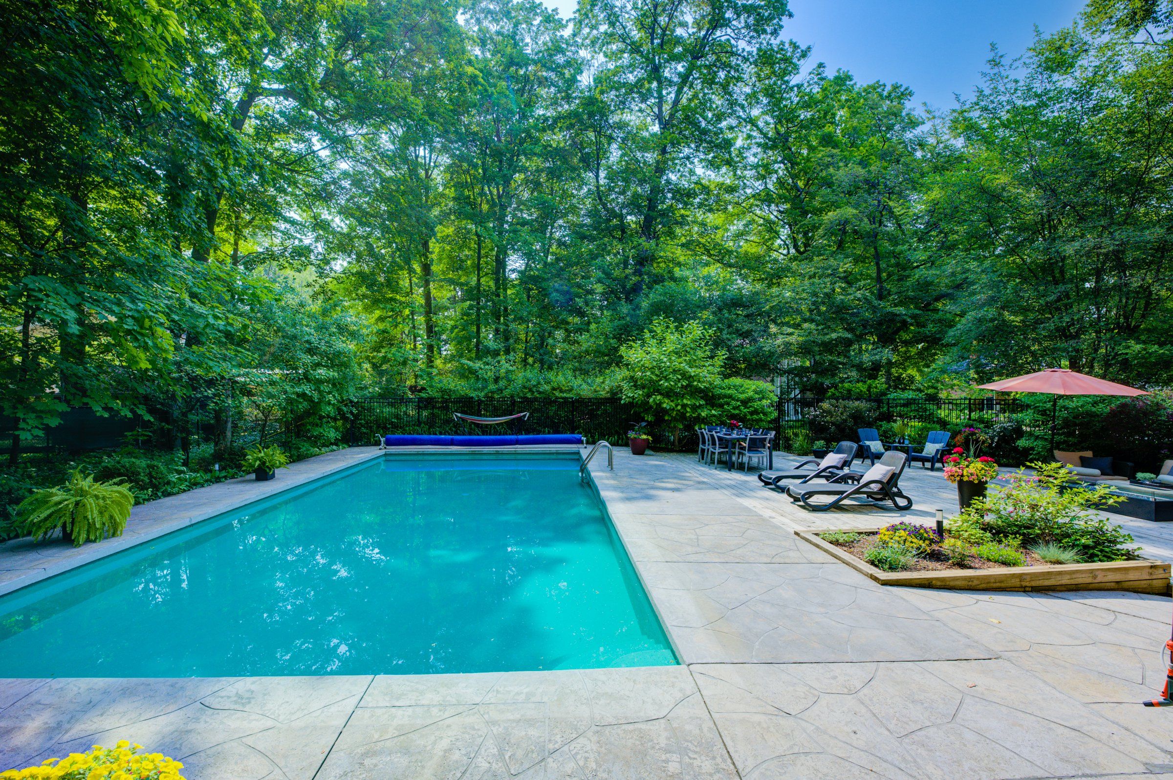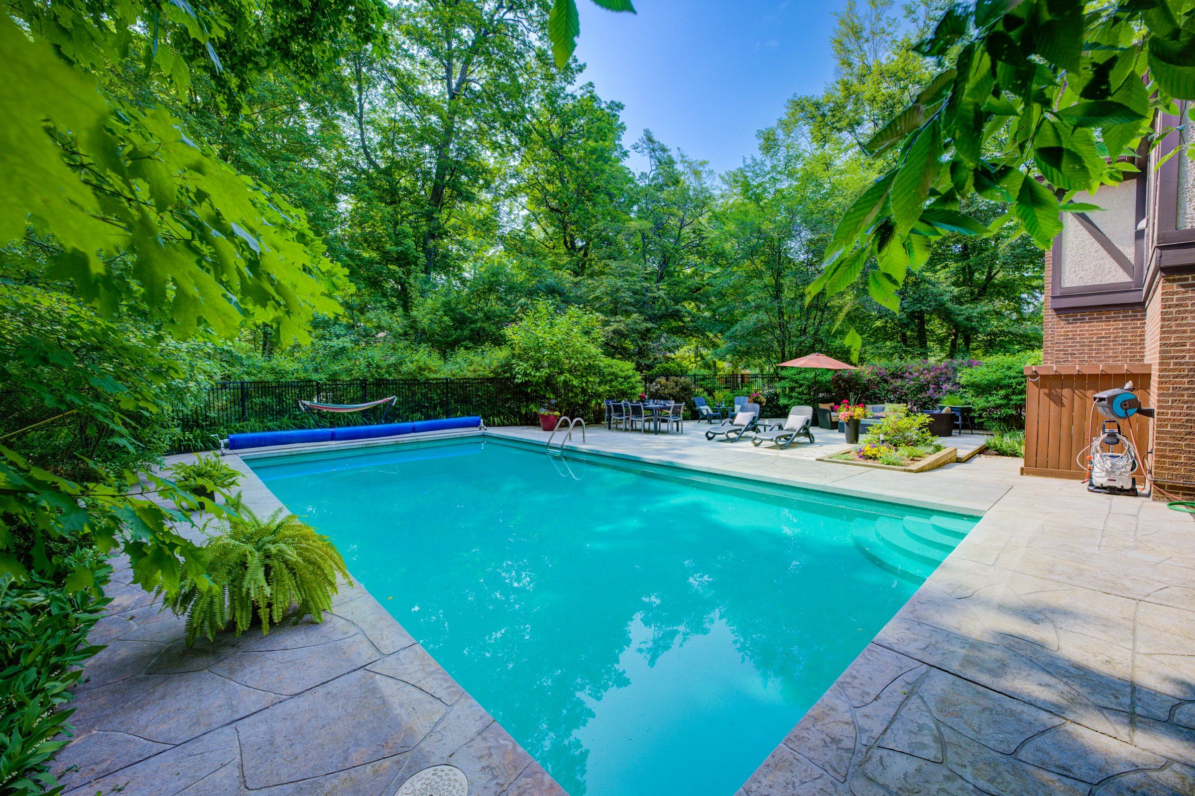 • Private backyard oasis featuring an inground pool and covered seating.