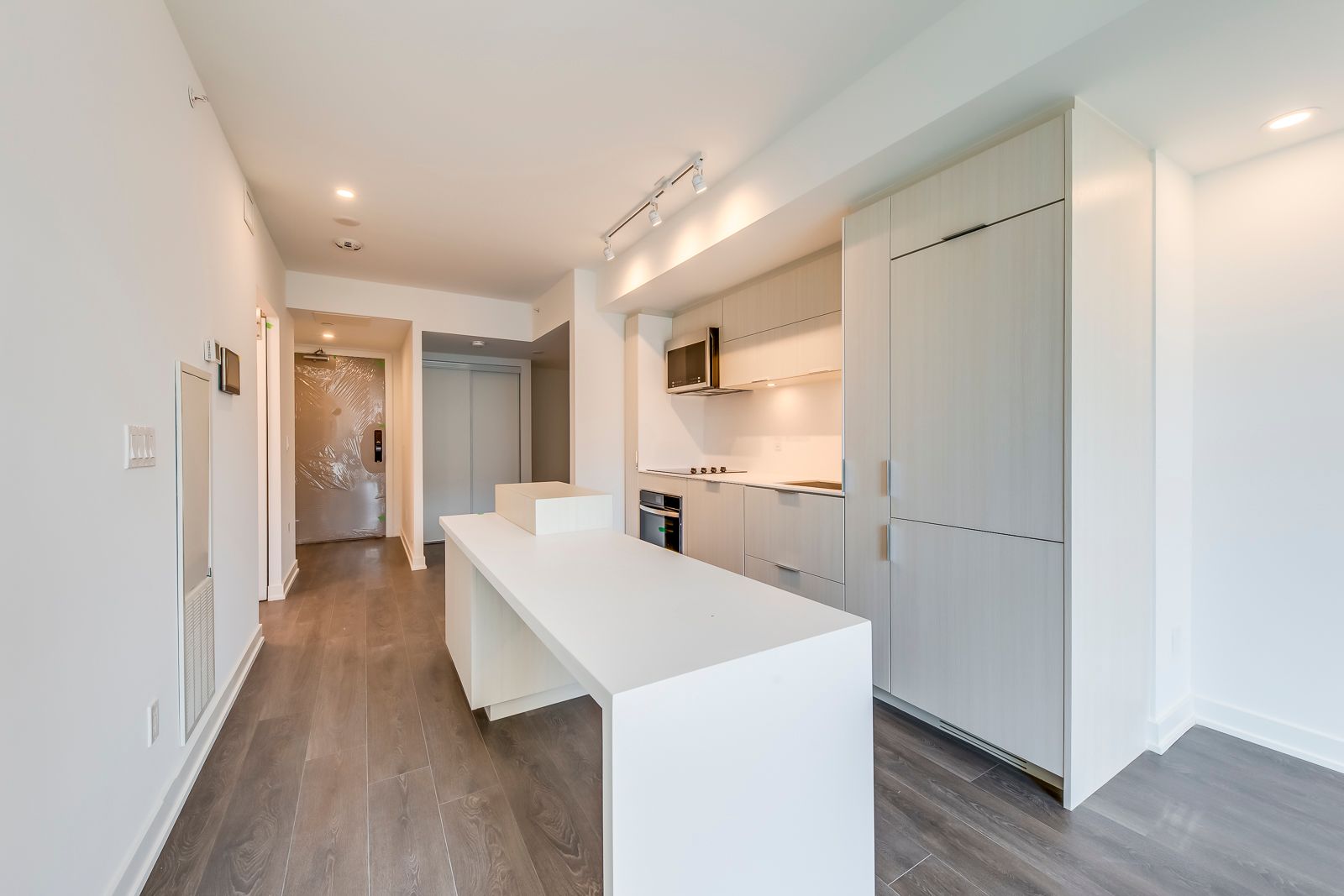 • Modern kitchen featuring Corian countertops and built-in appliances.
