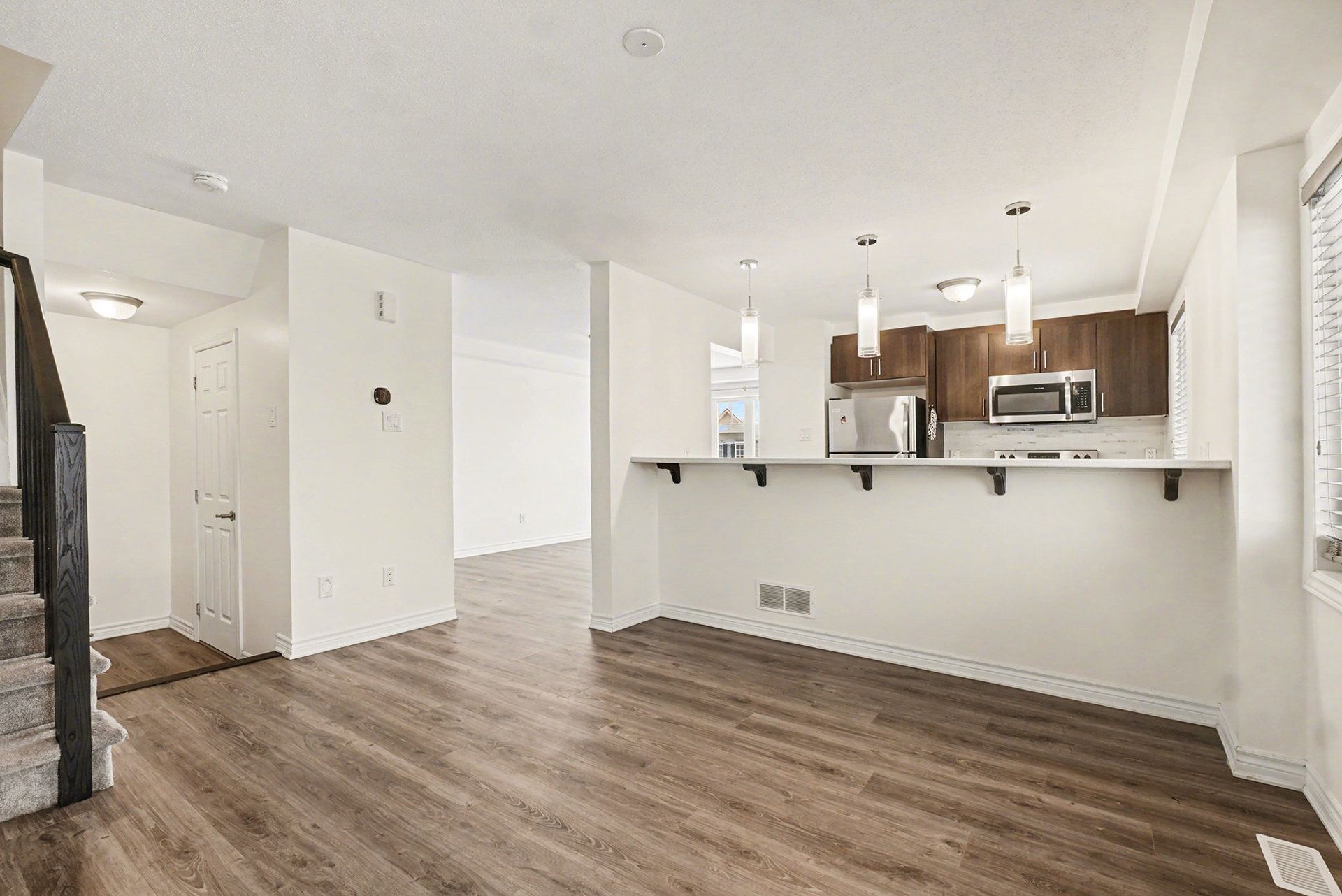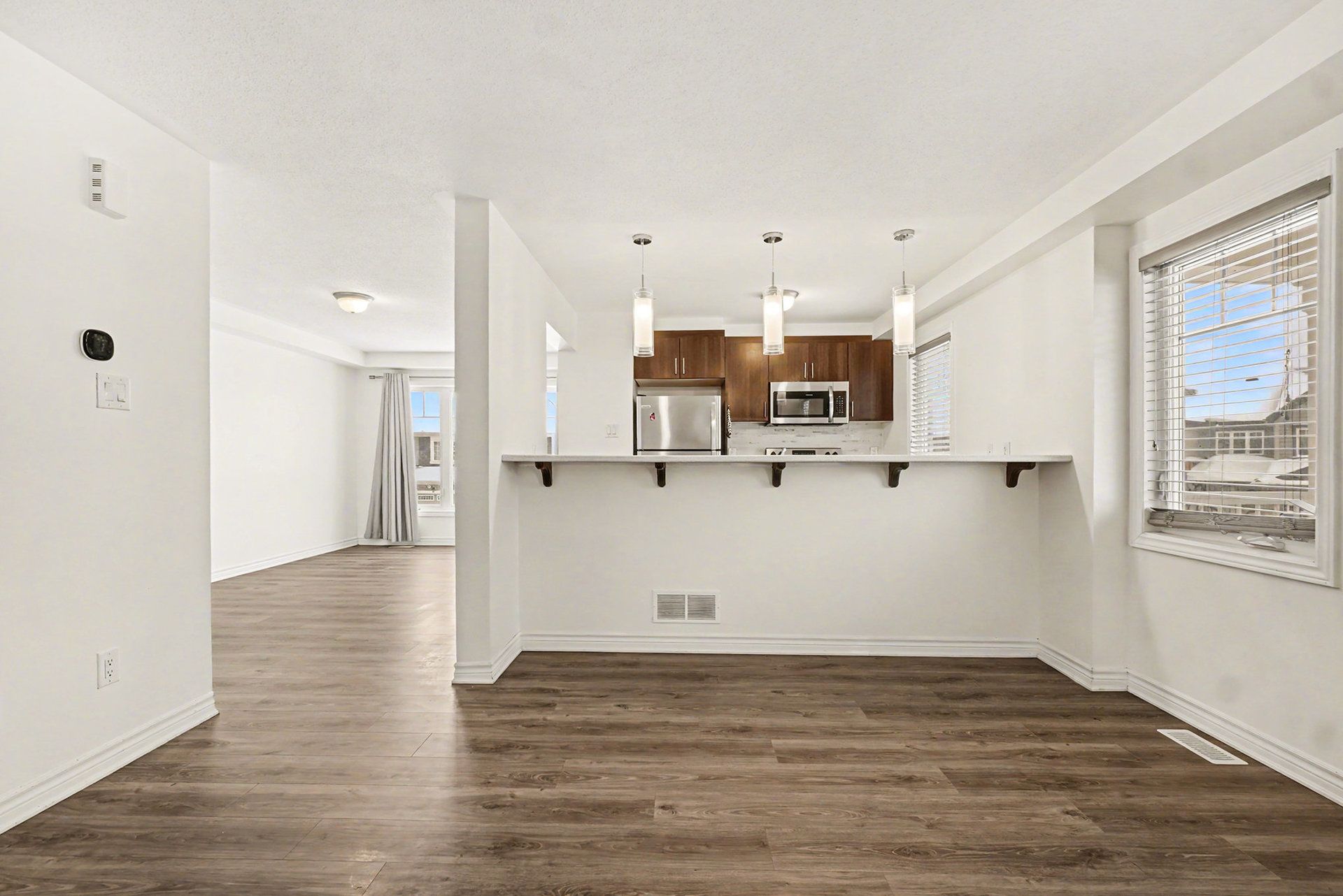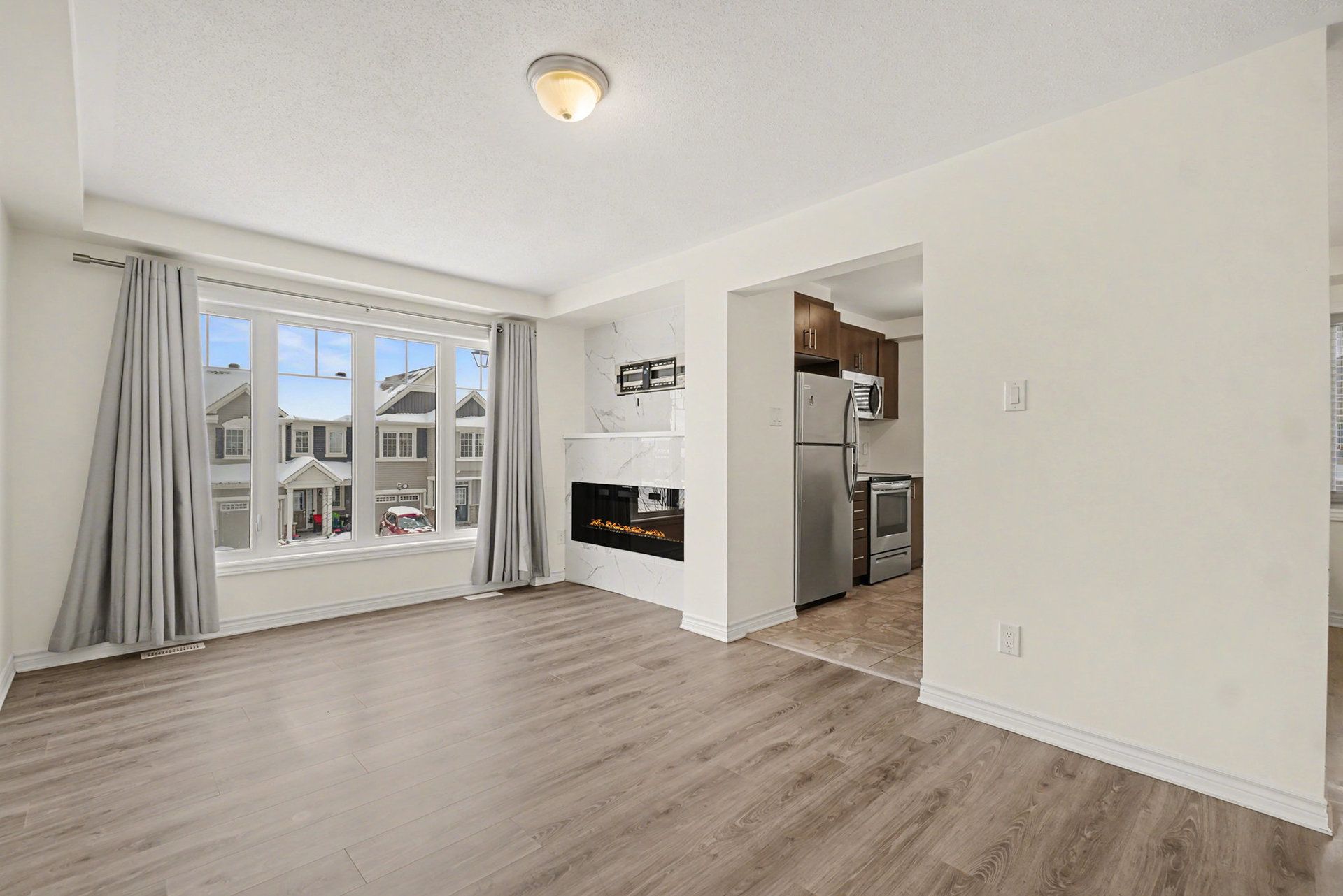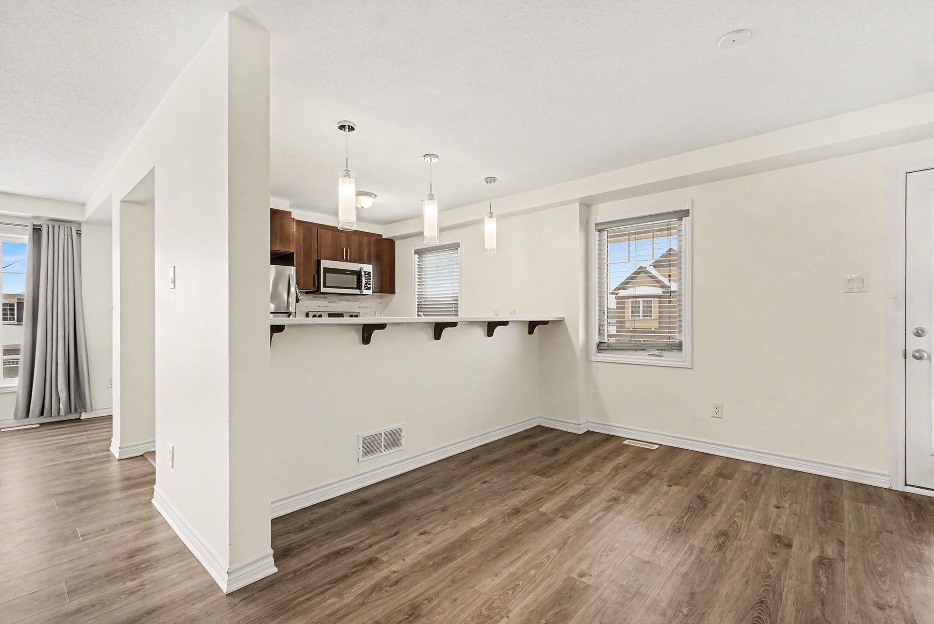 • Bright and open second level with living room, dining area, and modern kitchen.