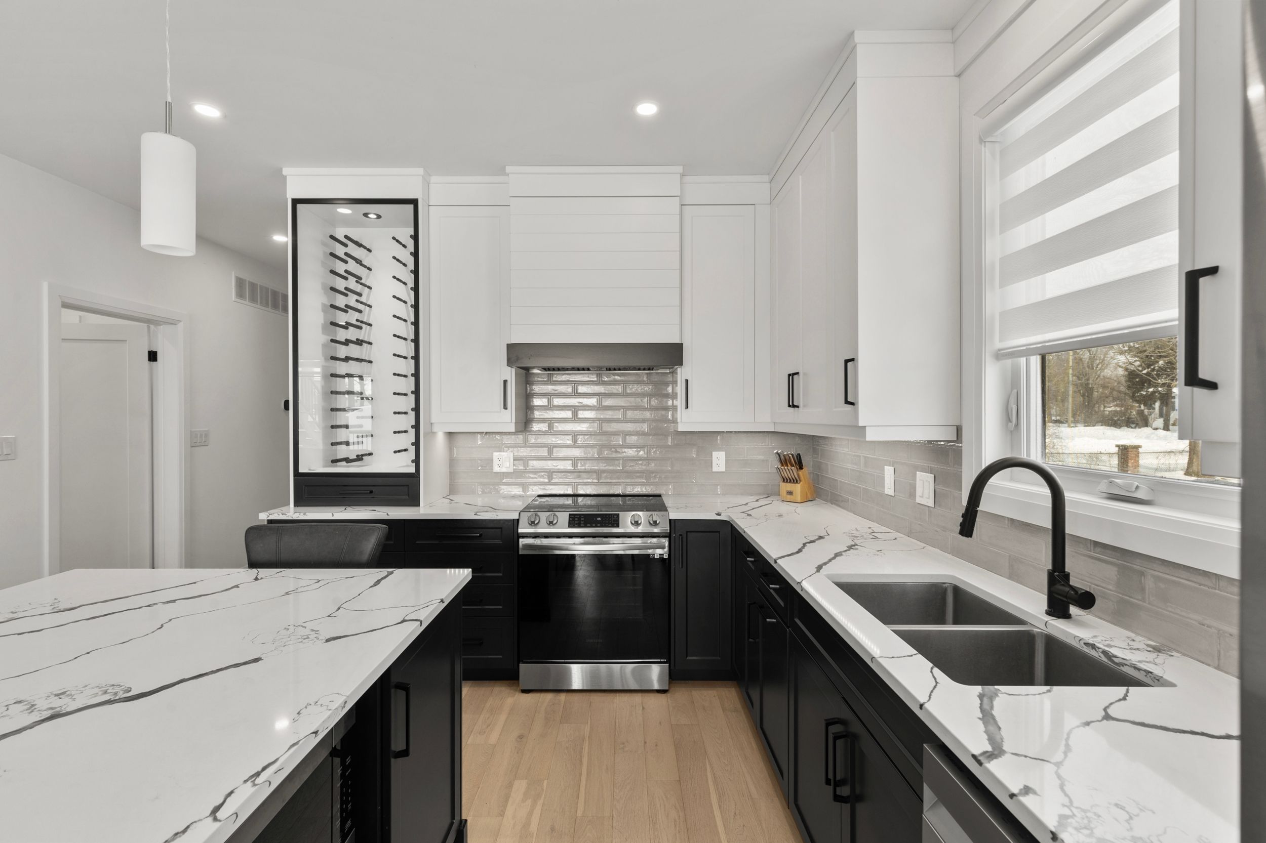 • Designer kitchen with floor-to-ceiling cabinetry and a wine fridge.