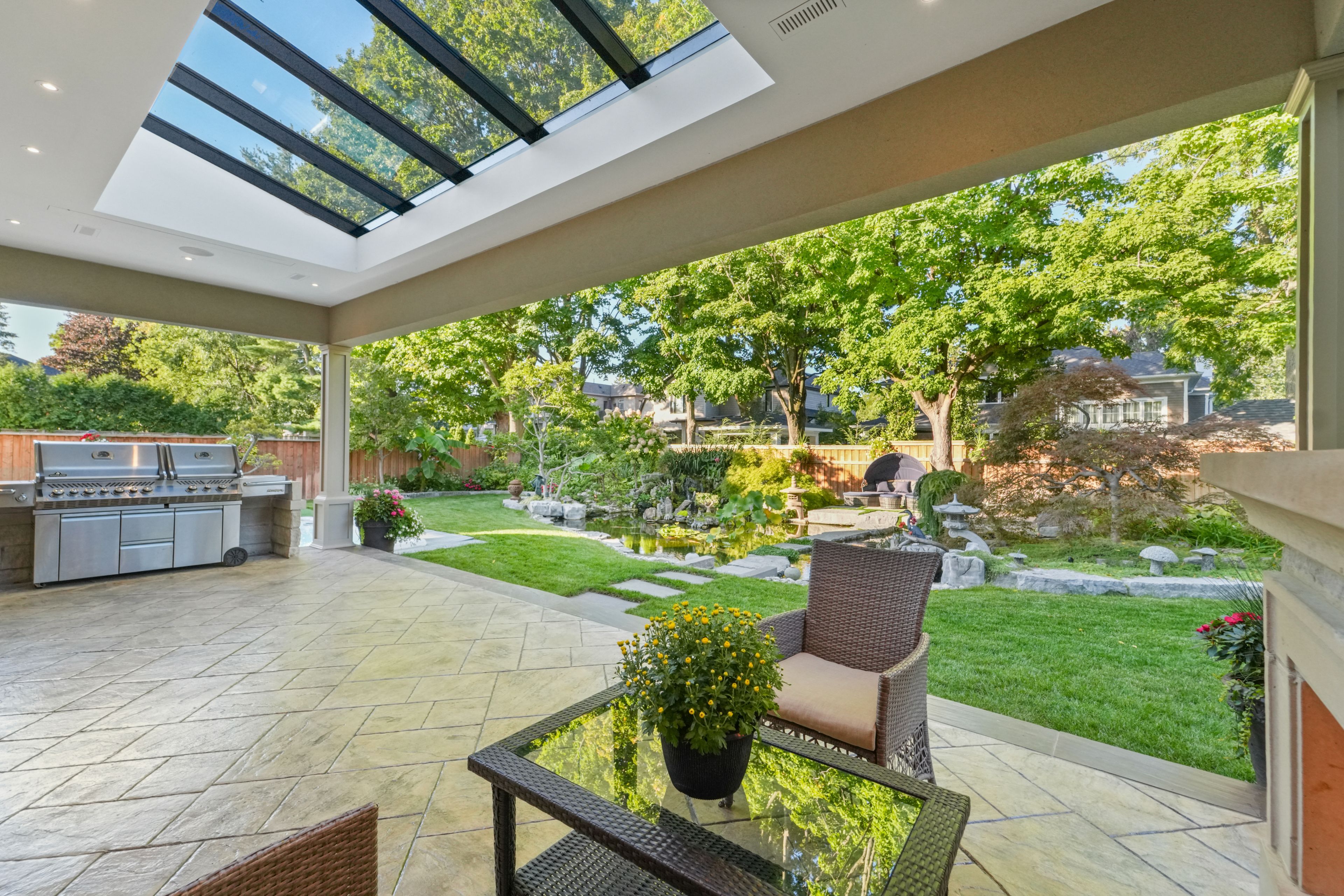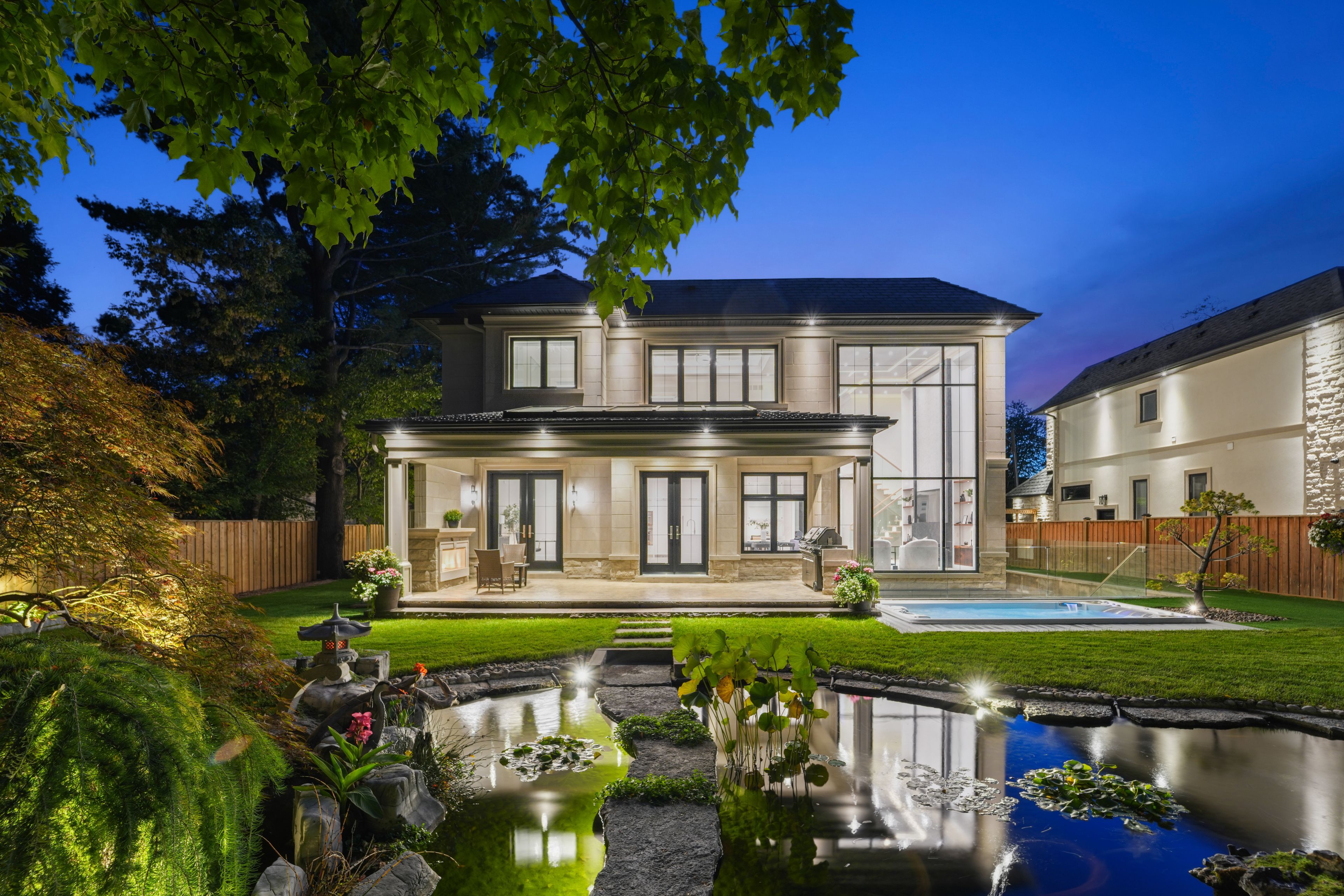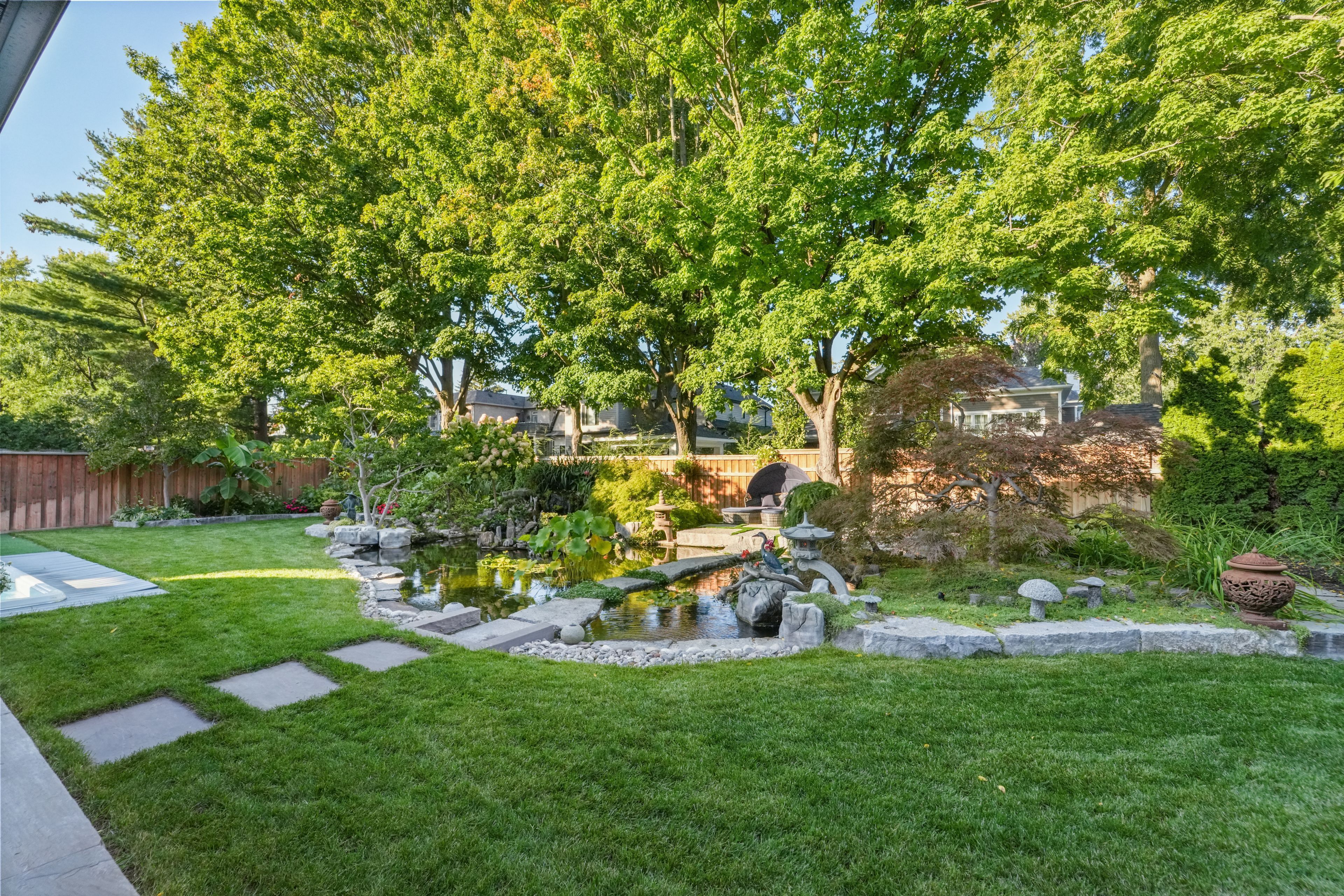 • Private backyard with covered patio, koi pond, and swim spa.