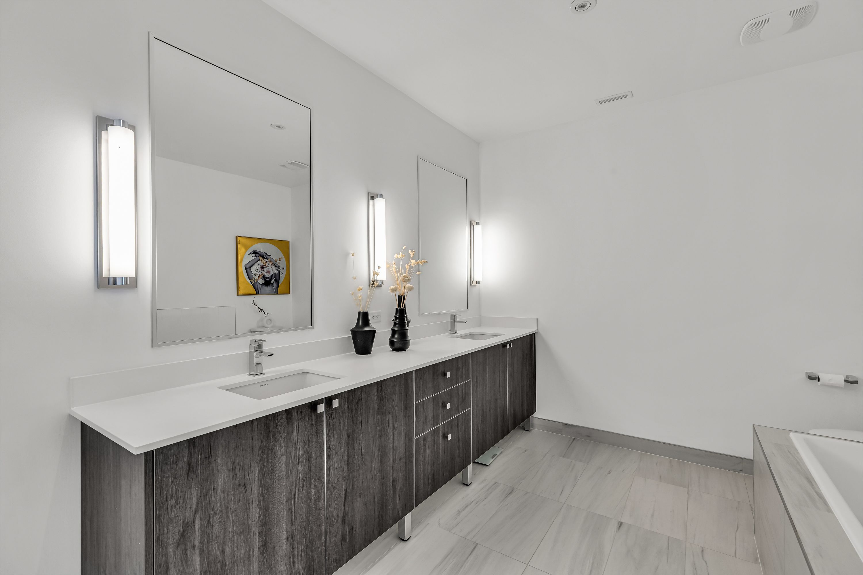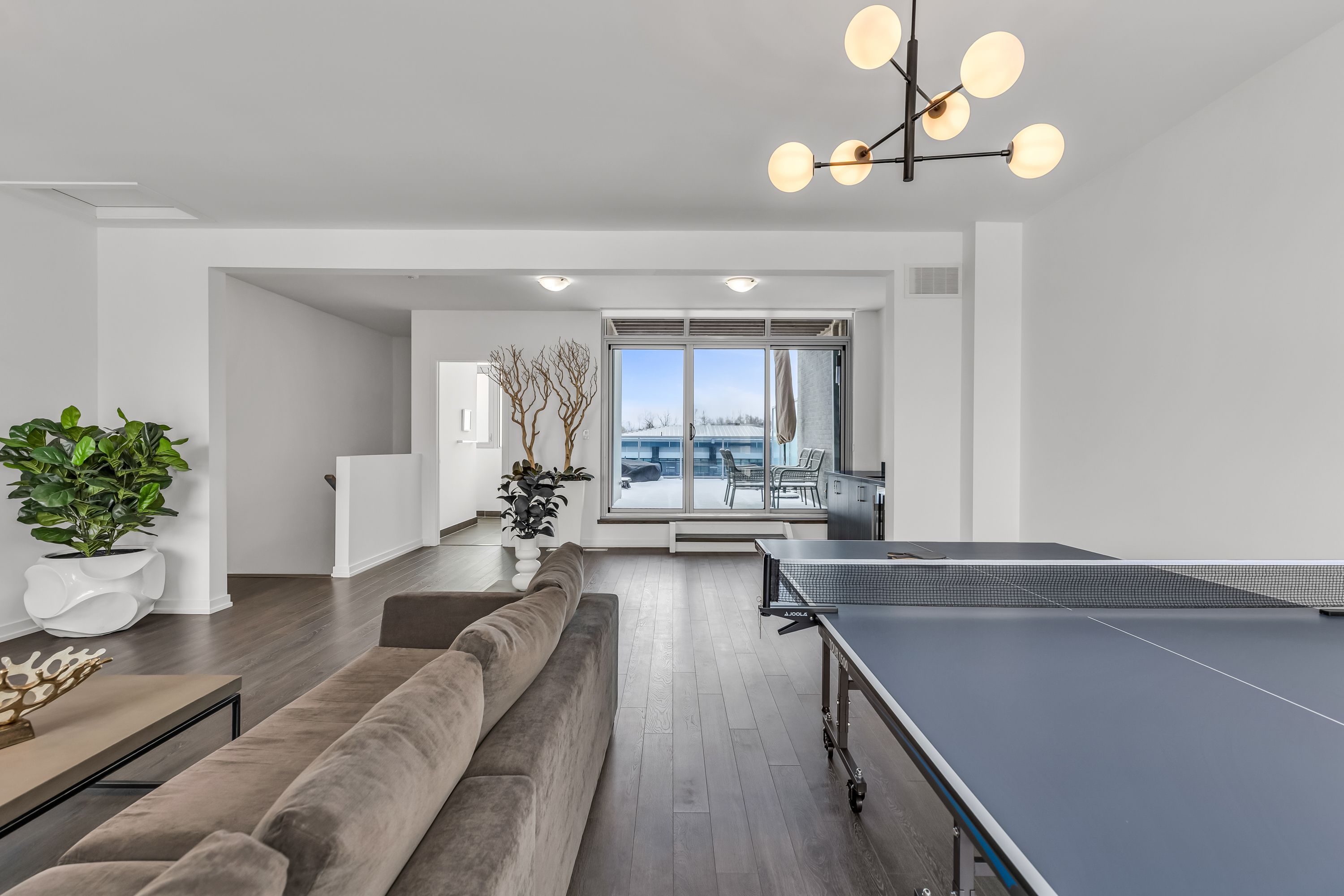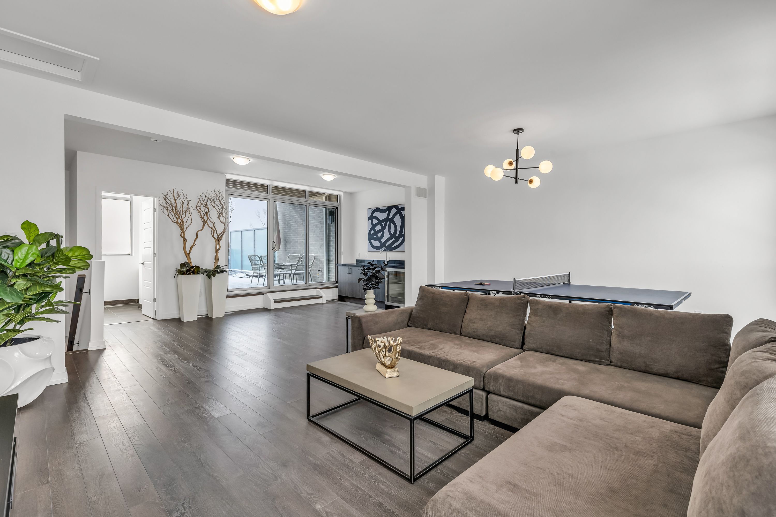• Upper level includes open-concept entertainment space with large deck and hot tub.