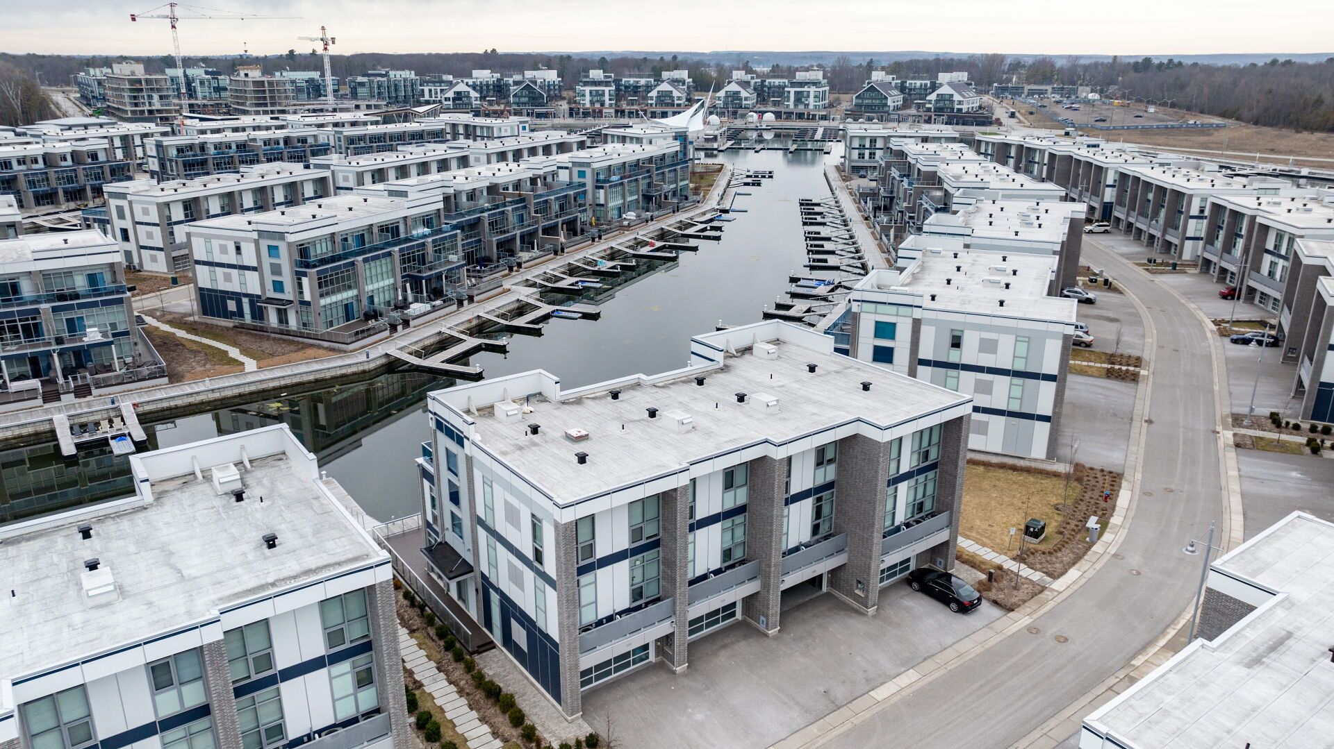 Four-seasons waterfront living at friday harbour, lake simcoe's most exclusive lakeside community. 3718 mangusta court is a 3-storey, 3-bedroom, 5-bathroom contemporary townhouse - 2,200 sq ft of interior space, three levels of designed outdoor living, and a private boat slip steps from the door. Soaring ceilings, oversized floor-to-ceiling windows, and a premium west exposure carry the light, the sunsets, and the water through every level. The ground level opens with a built-in 2-car garage, an oversized statuario venato tile foyer, and an entertainment room with a full built-in bar that walks out to the deck and the boat slip. The second level is the heart of the home: open-concept paris kitchens cabinetry, a quartz waterfall island, kitchenaid stainless steel appliances, and a living and dining room that flow out to a glass-railed balcony. The primary suite anchors this floor with a walk-in closet and a five-piece ensuite featuring a soaker tub and oversized glass shower. The third level holds two further bedrooms, each with a private ensuite, opening to a generous terrace. Mangusta residents enjoy exclusive use of a private pool and cabana - shared only among the island's 68 owners. Full lake club access includes pool, hot tub, restaurant, fitness centre, and theatre. The nest golf course, the 200-acre nature preserve, and mount st. Louis moonstone are minutes away. Highway 400 keeps toronto close. A fully furnished, turn-key option is available, including the boat and golf cart. Newly priced at $1,499,000 - a deliberate move, made with intent. The right buyer will recognize it on first walk-through.