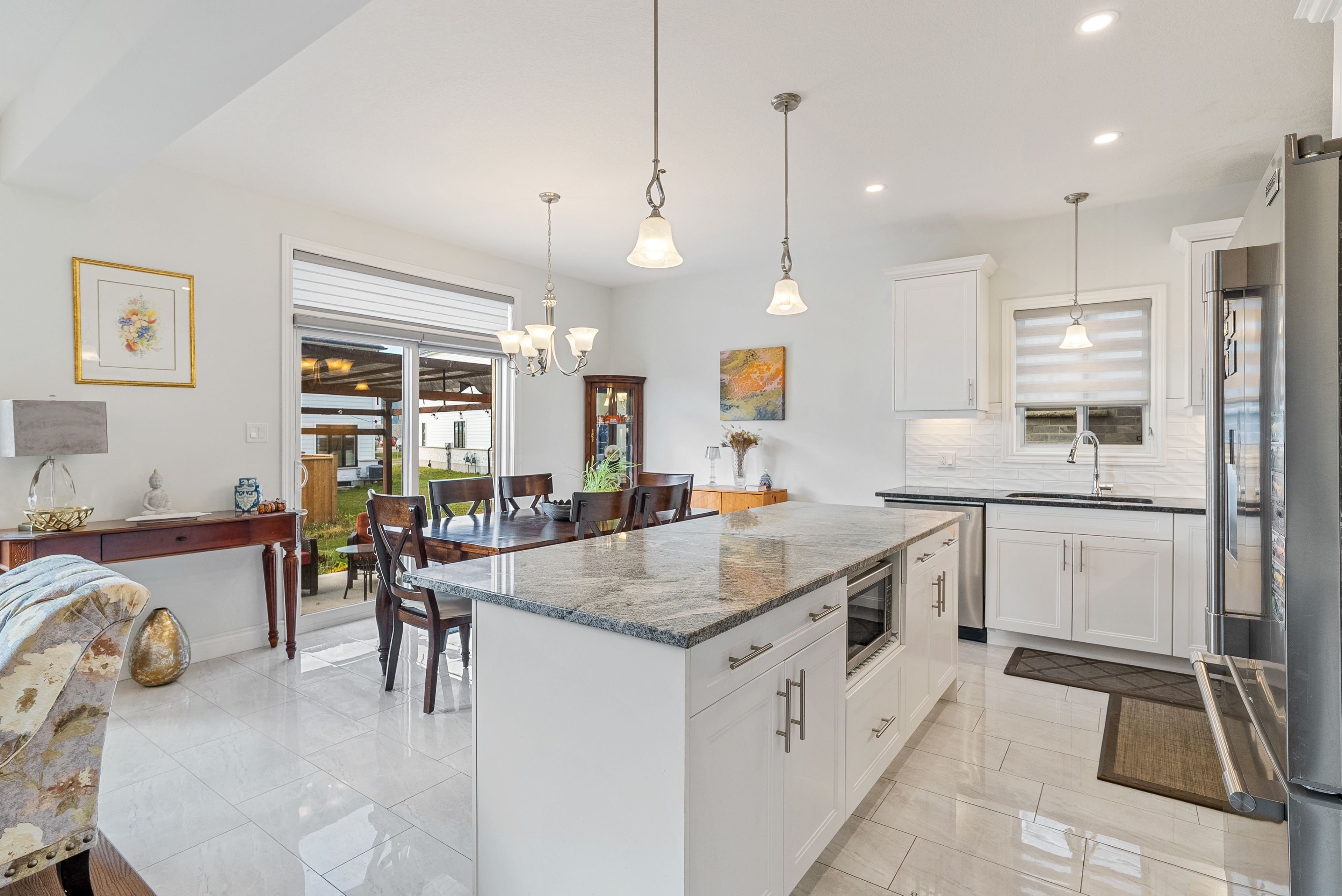 Welcome to this beautifully designed detached home offering an open-concept layout and 9-foot ceilings that create an airy, inviting atmosphere. The main floor showcases a bright living area with gleaming hardwood floors, complemented by a modern kitchen featuring granite countertops, a gas stove, elegant backsplash, under-cabinet lighting, a spacious island, and stylish tile flooring. The adjoining dining area opens directly to the backyard-perfect for family gatherings and entertaining. Upstairs, you'll find four generous bedrooms and two full bathrooms. The primary suite includes a walk-in closet and a luxurious 4-piece ensuite with granite finishes, while the remaining bedrooms share a well-appointed main bath, also with granite counters. The staircase features decorative iron pickets, adding a touch of sophistication. The professionally finished basement offers a legal separate entrance, ideal for an in-law suite, complete with a bedroom, full 3-piece bath with standing shower, and a modern kitchen. Conveniently located near highways 401 & 402, hospitals, top-rated schools, shopping centres, and all essential amenities.