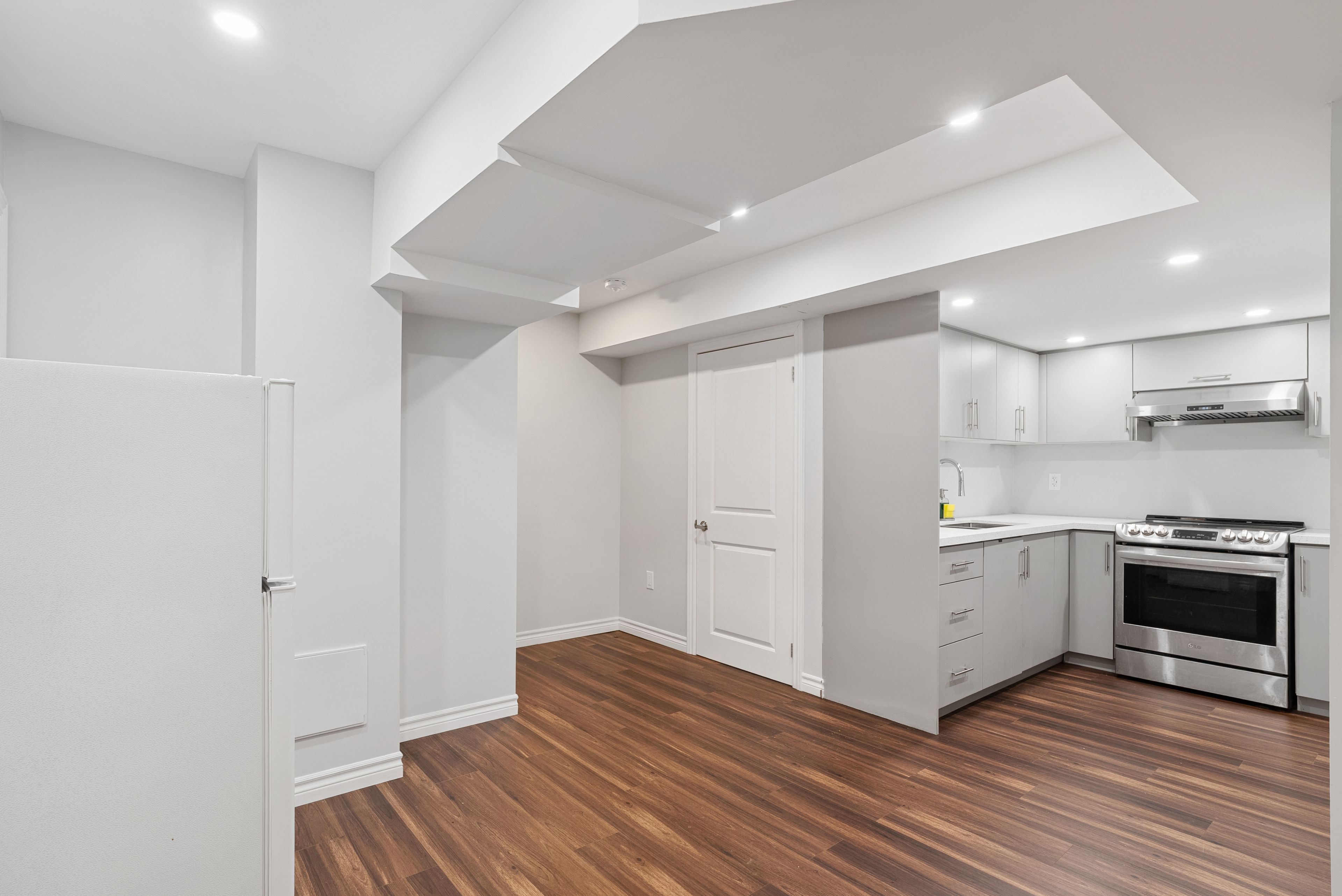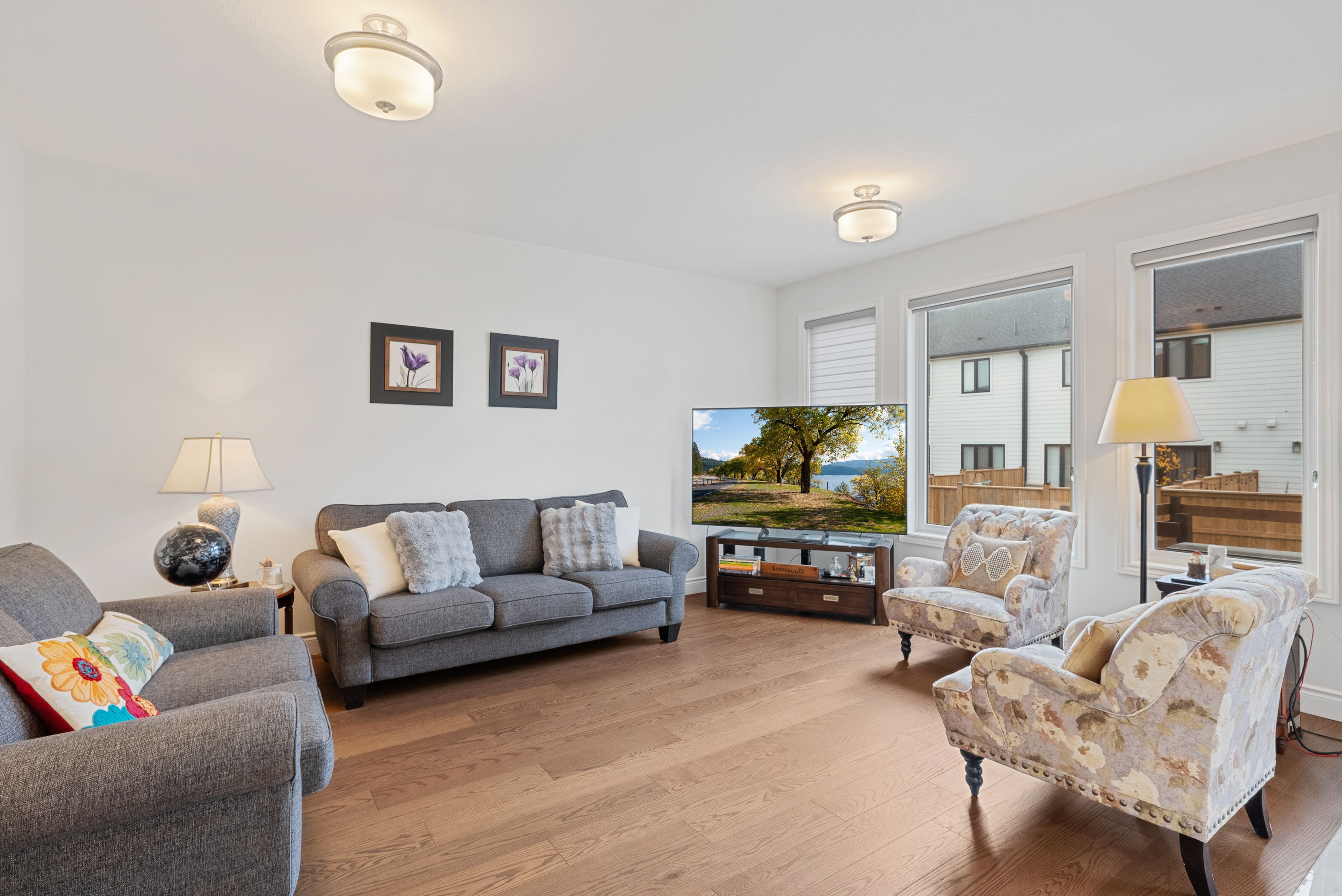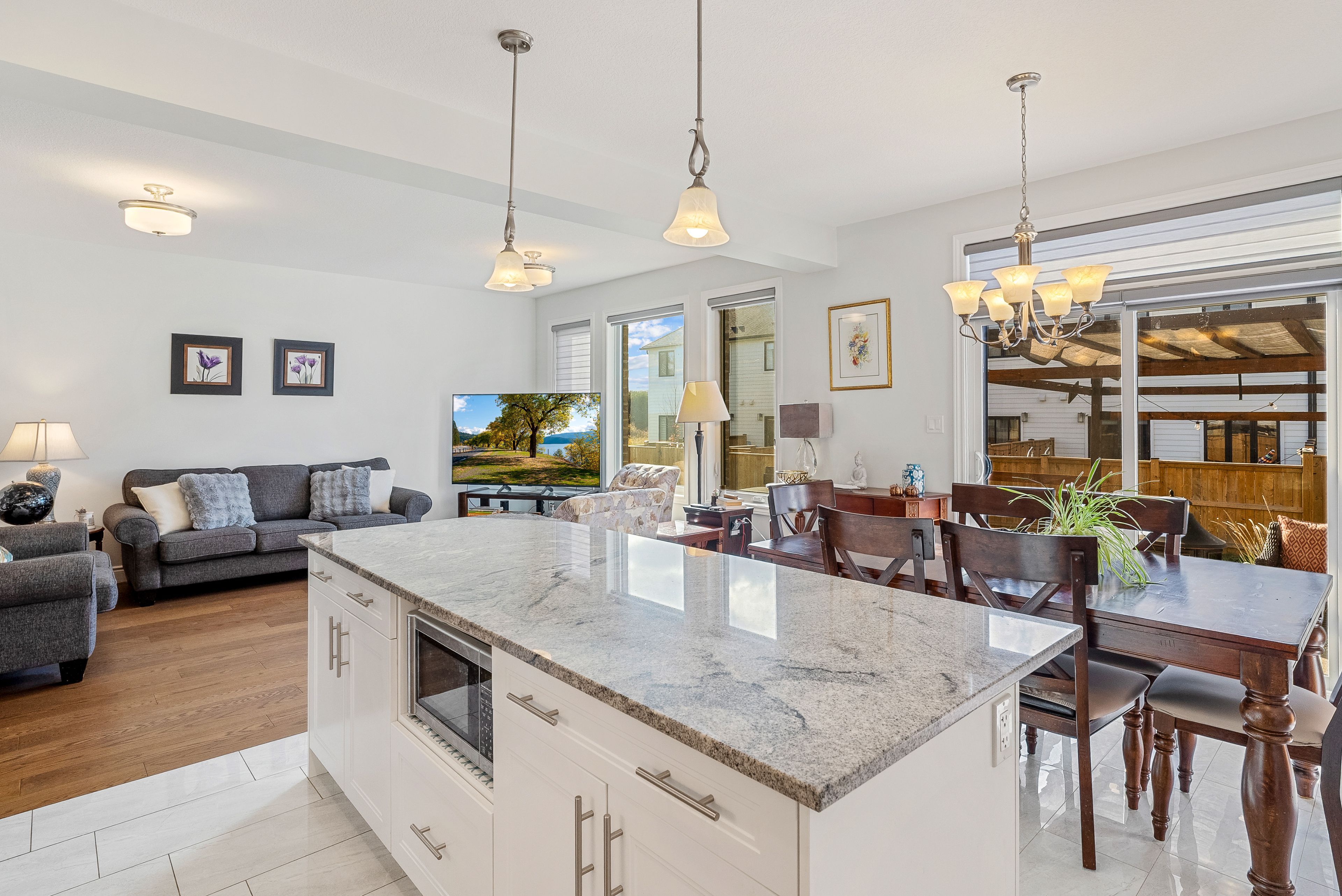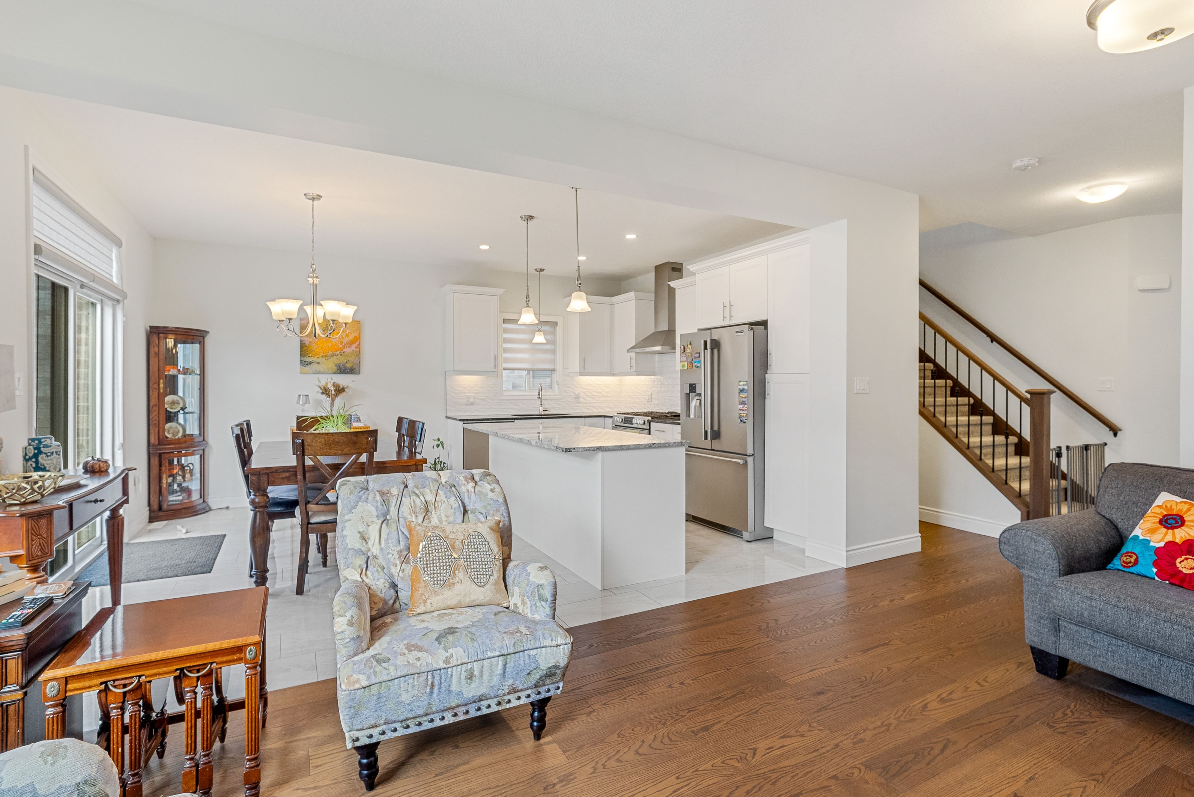 • Bright living area with hardwood floors and modern kitchen featuring granite countertops.