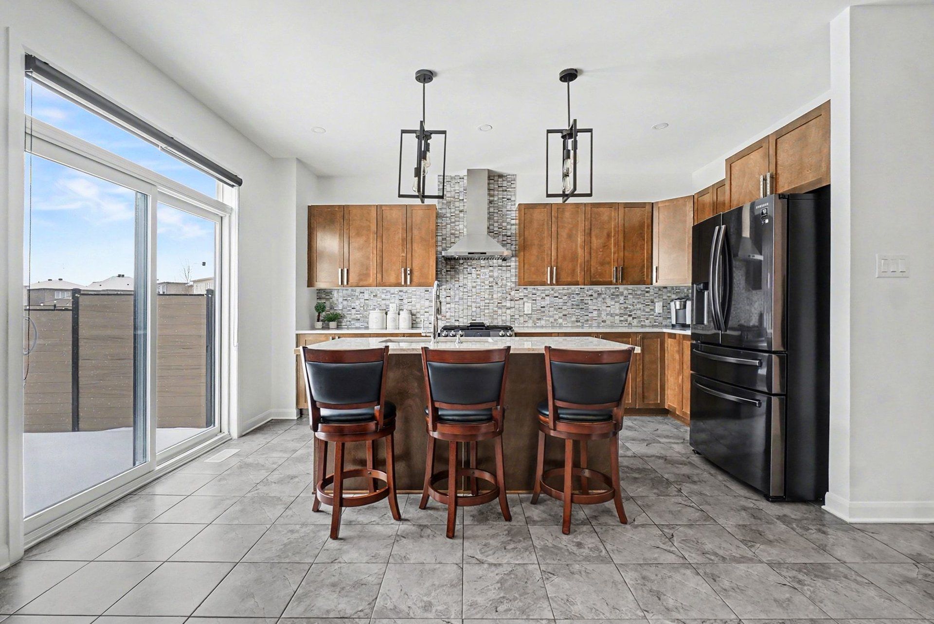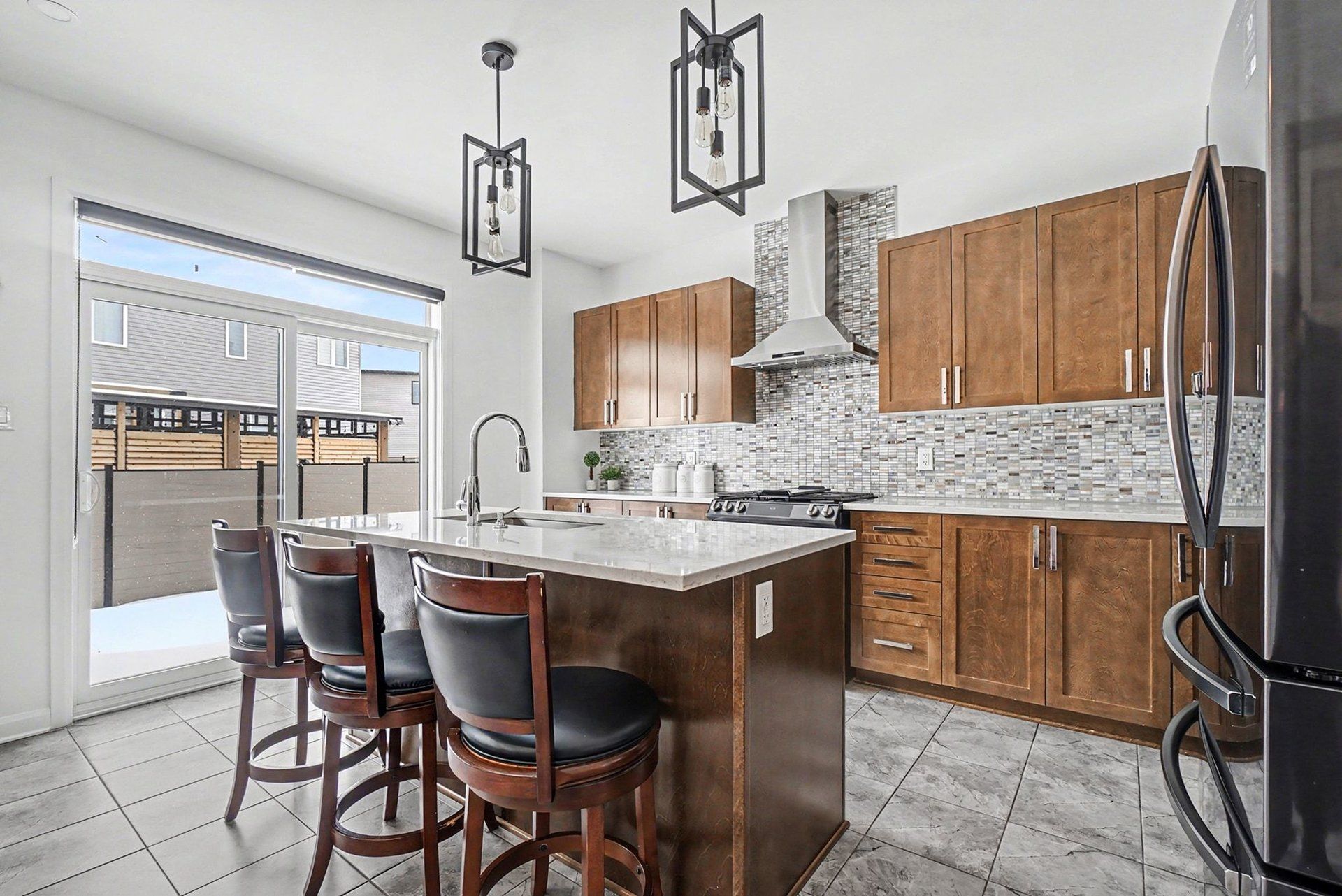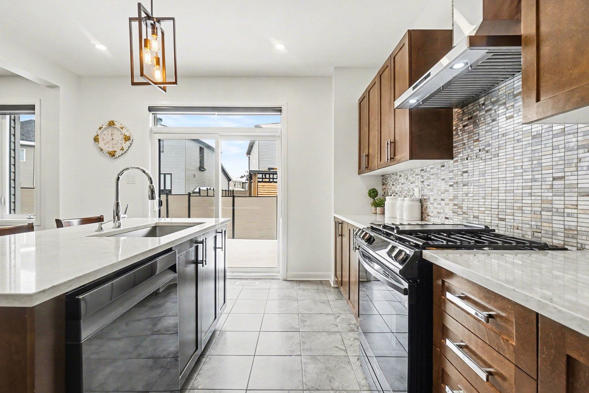 • Gourmet kitchen with modern appliances, quartz countertops, and a central island.