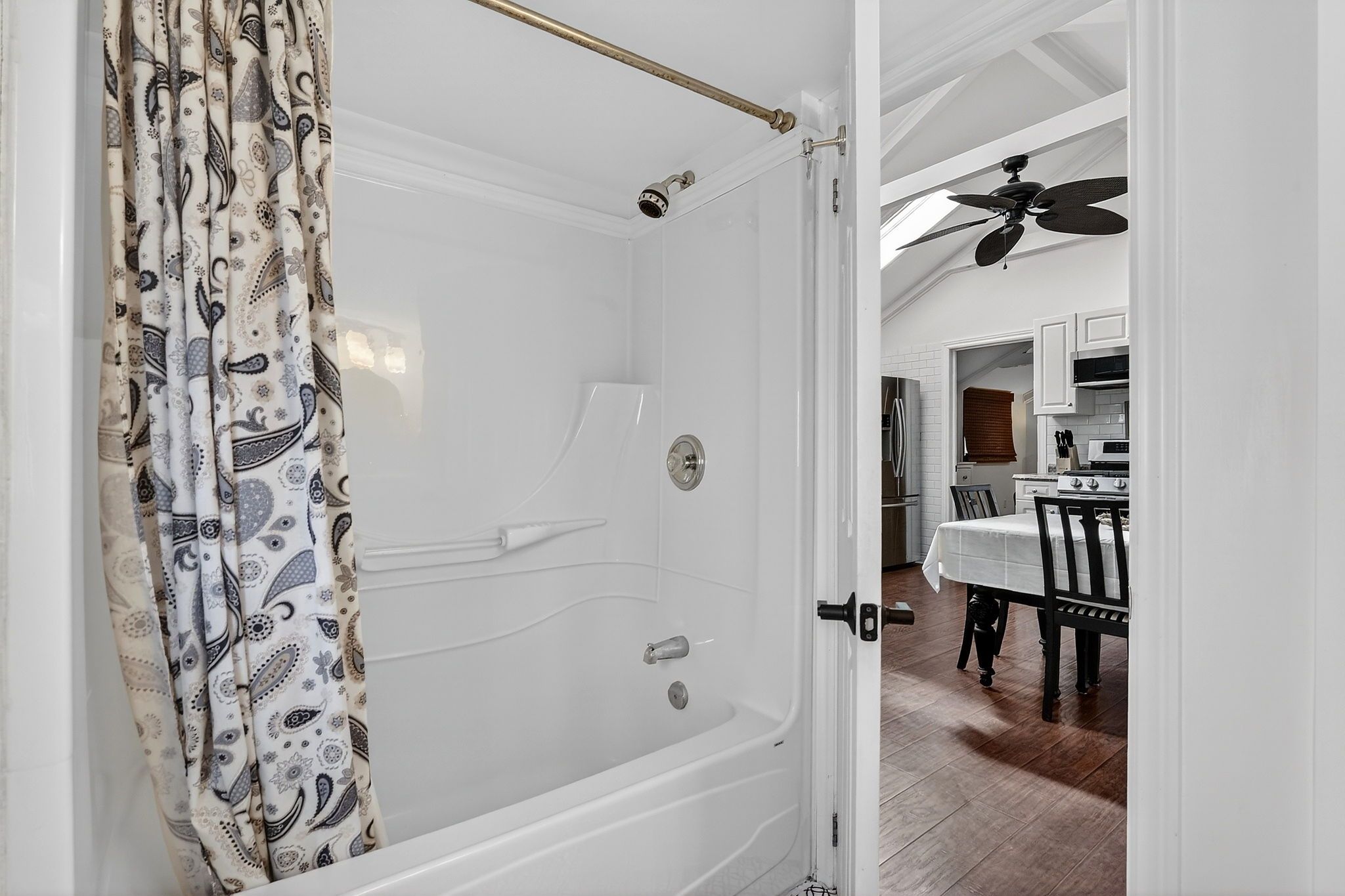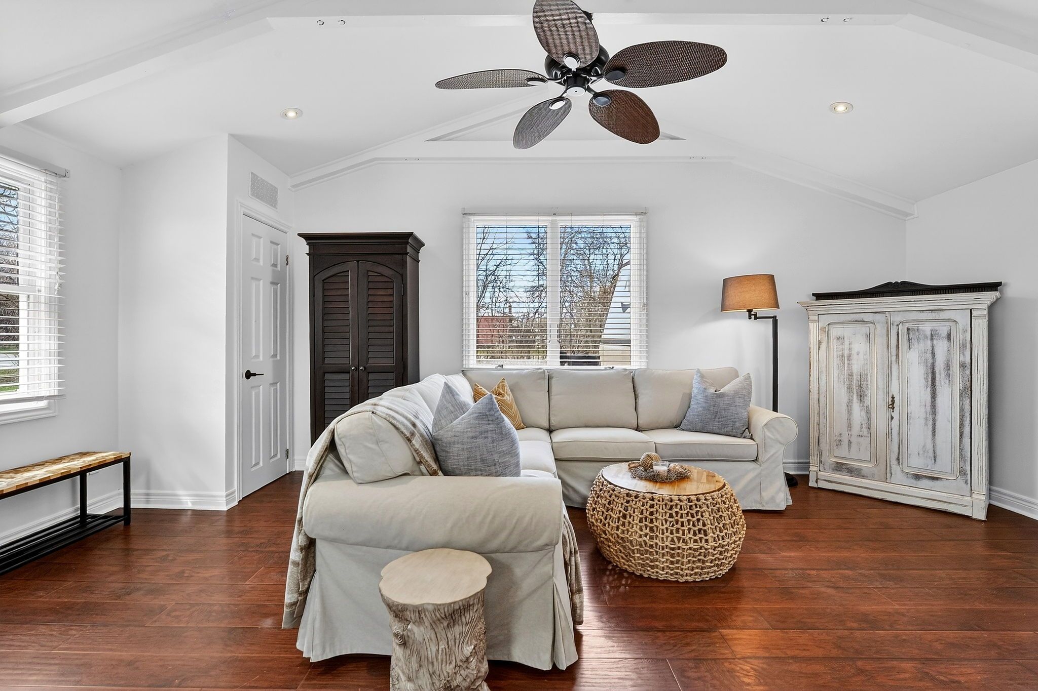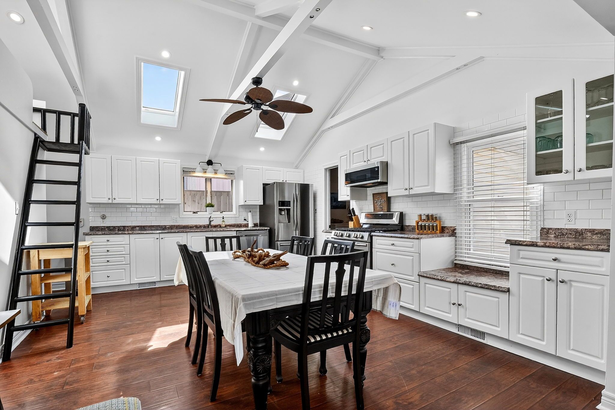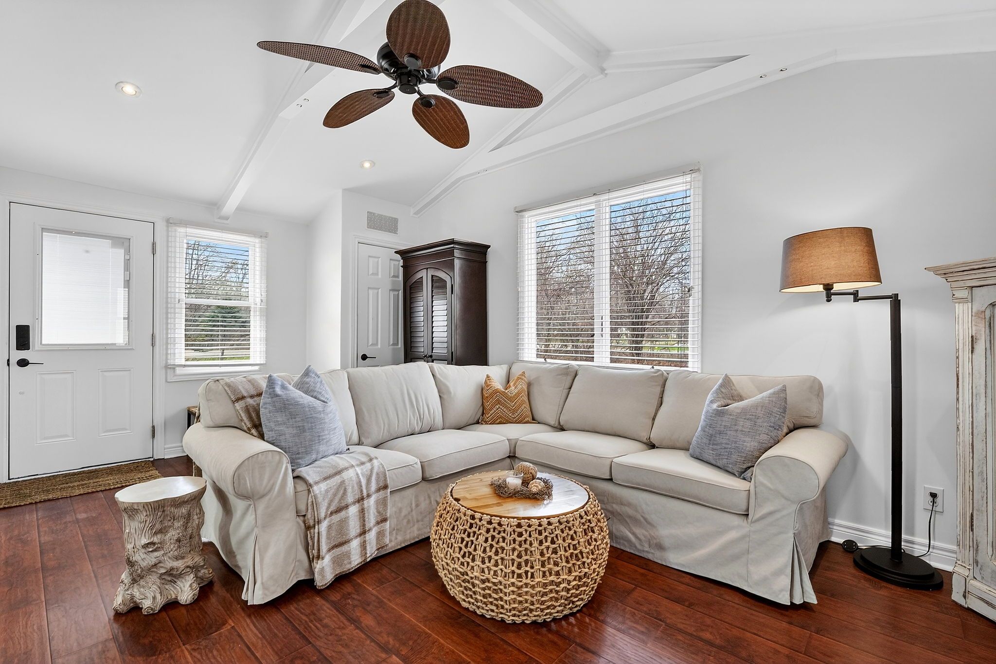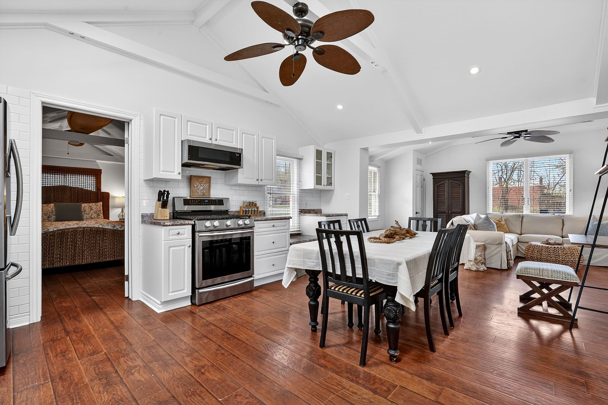 • Bright open-concept living space with vaulted ceilings and exposed beams.