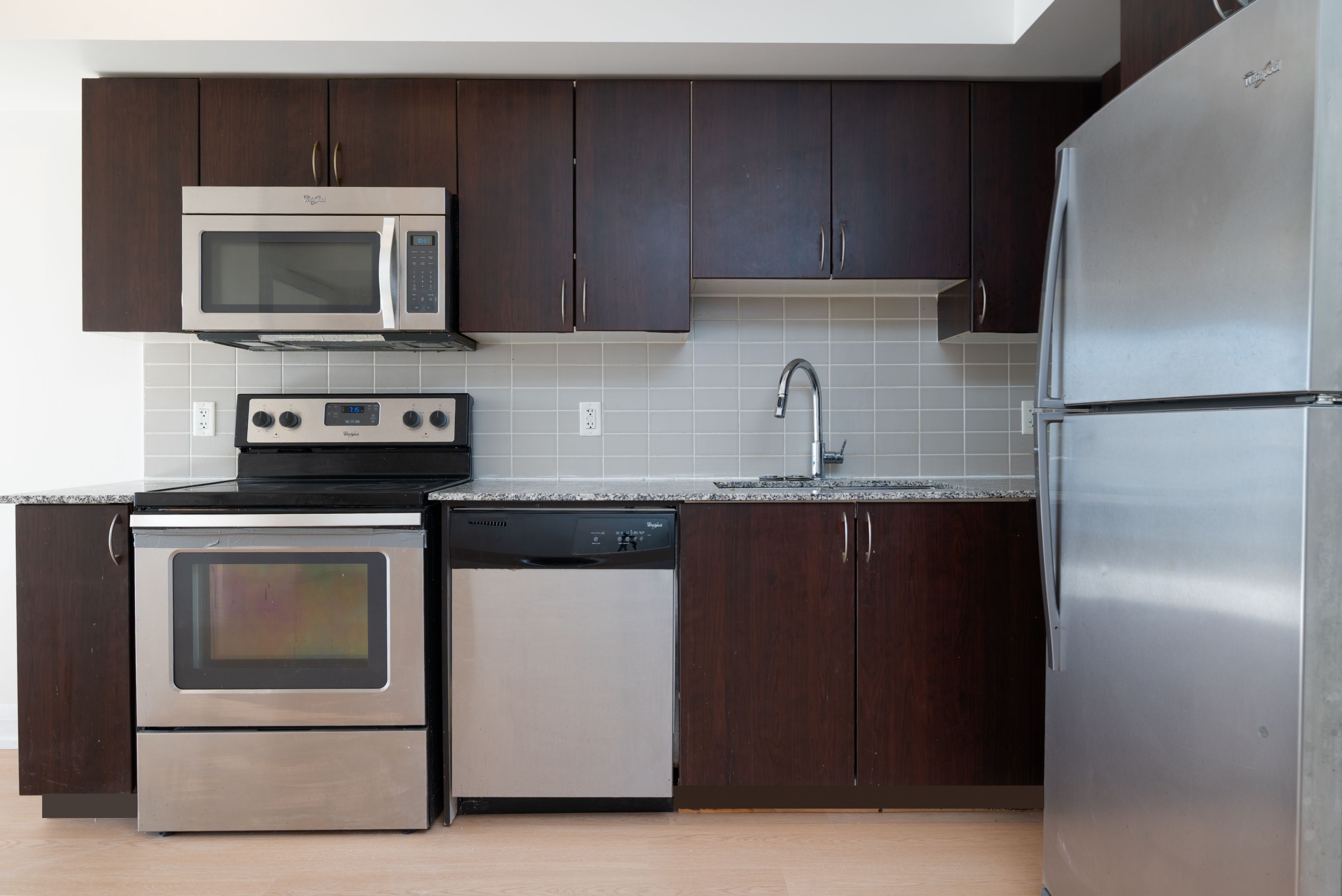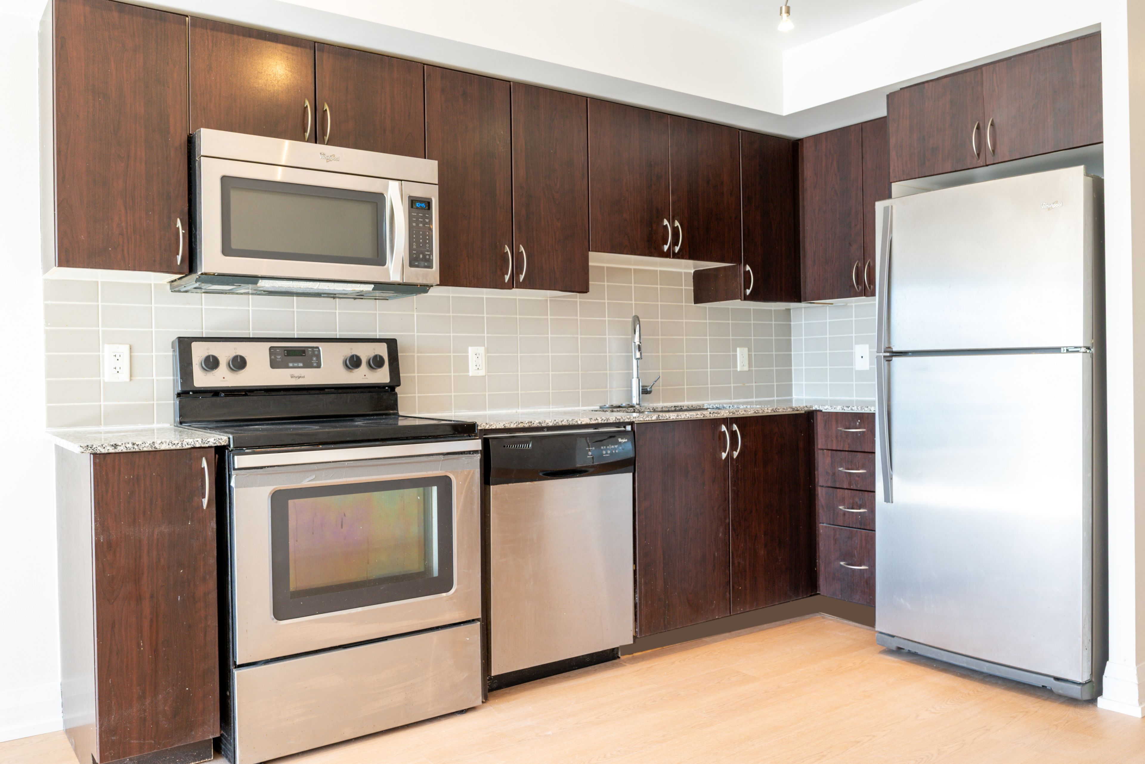 • Modern kitchen featuring granite countertops and stainless steel appliances.