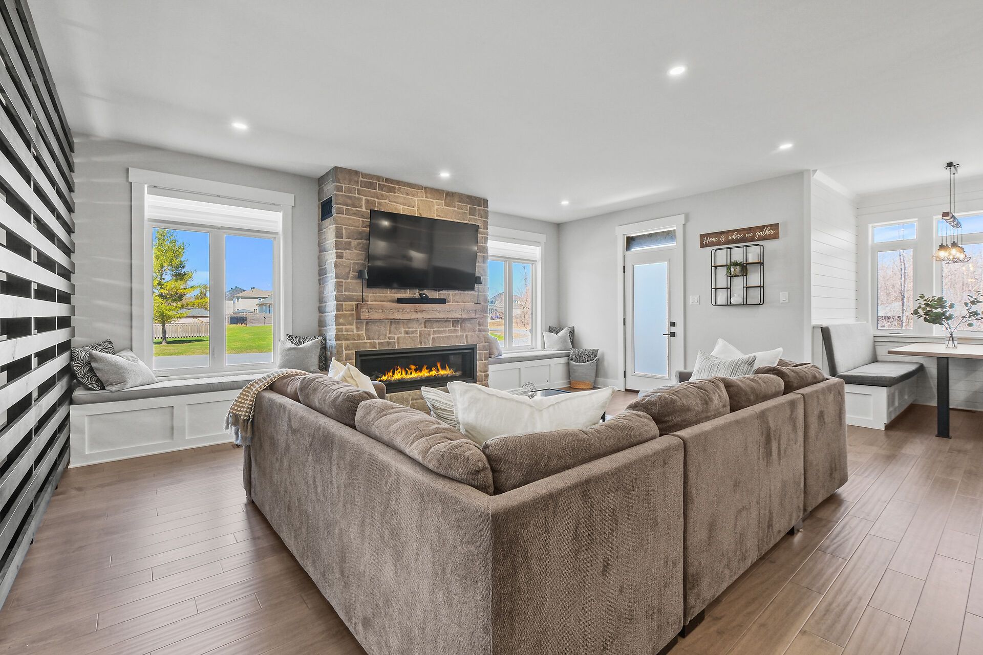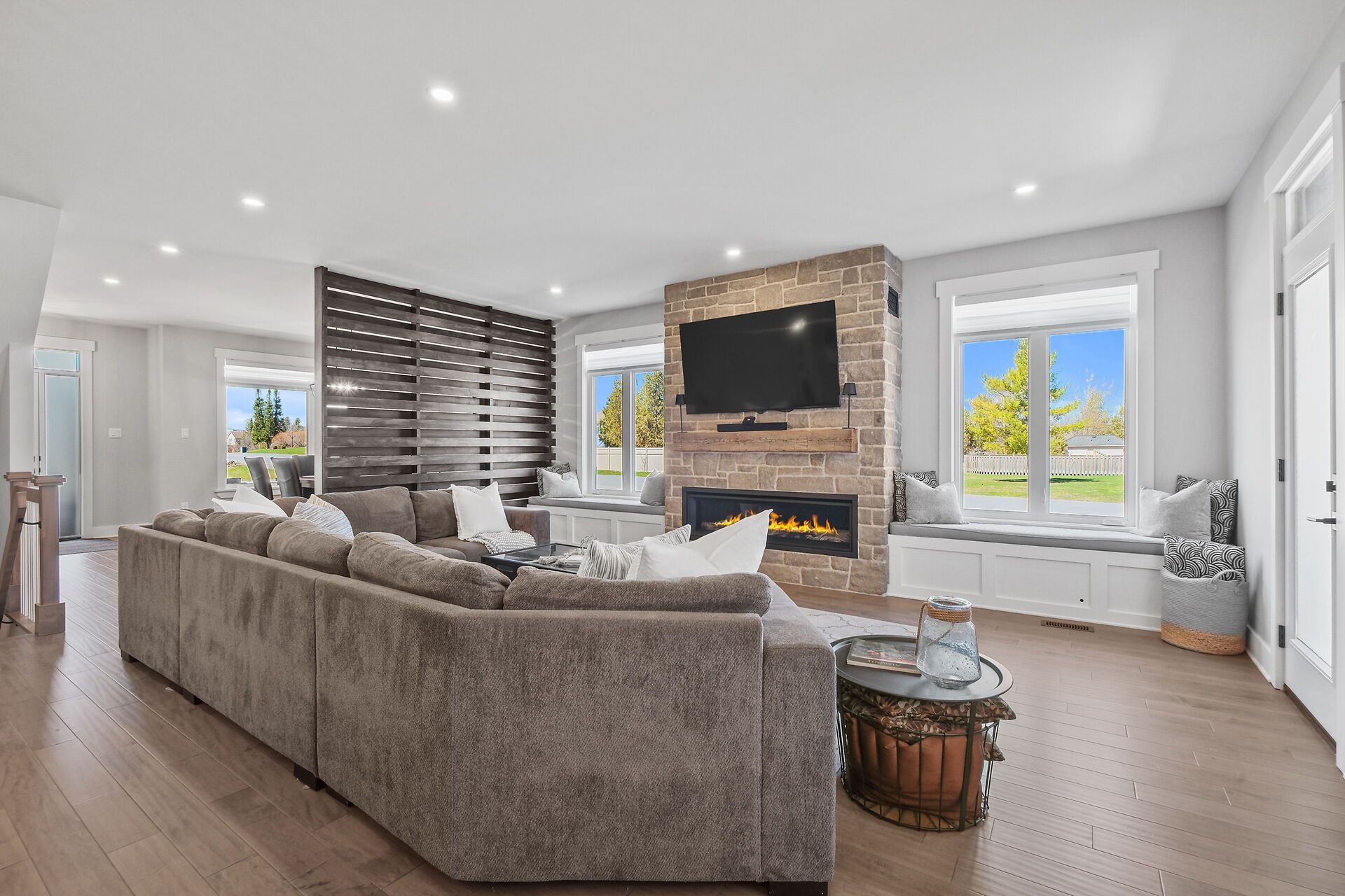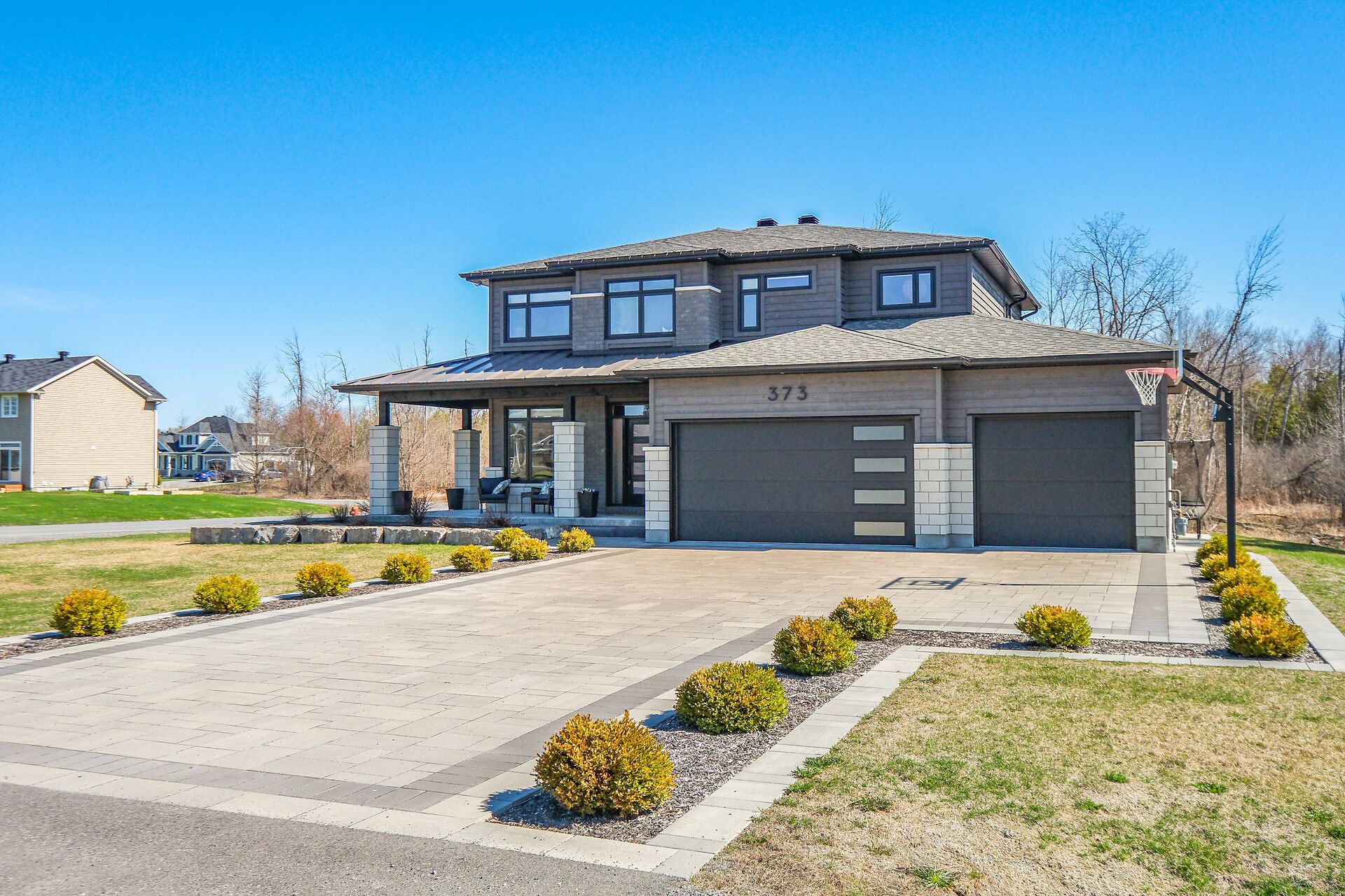 Some homes simply stay with you ~ 373 antler court is one of them. This exceptional custom build stands apart as one of the finest offerings in the neighbourhood. Perfectly positioned on a premium corner lot. A striking first impression begins with the beautifully hardscaped exterior, triple car attached garage, and a separate oversized detached garage - ideal for hobbies, vehicles, or recreational "toys." inside, the home exudes warmth and craftsmanship, with engineered hardwood flowing throughout and thoughtfully curated spaces designed for both everyday living and elegant entertaining. The living room is a true focal point, featuring a gas fireplace framed by charming window seats with built-in storage. A subtle privacy wall defines the dining space while maintaining an effortless flow. The kitchen is a showpiece - ceiling-height cabinetry, quartz countertops, built-in ovens, cooktop, coffee bar, walk-in pantry, and a bright breakfast nook. A well-designed mudroom with custom cubbies provides seamless access to the garage. Upstairs, a sunlit reading nook creates a cozy retreat. The primary suite is a sanctuary, complete with a tray ceiling, private fireplace, spacious walk-in closet, and a luxurious ensuite with an oversized glass shower, soaker tub, and quartz vanity. A generous second bedroom with its own ensuite, plus a third bedroom and full family bath, complete this level. The lower level offers versatility with a potential fourth bedroom, expansive recreation space, home gym area, and abundant storage - including a rare storage area beneath the garage. The triple garage is fully insulated, drywalled, and equipped with its own gas furnace. Outdoors, enjoy a private covered porch and a spacious yard perfect for family living. Set in a sought-after, family-friendly neighbourhood, this home delivers a rare blend of quality, comfort, and elevated design.