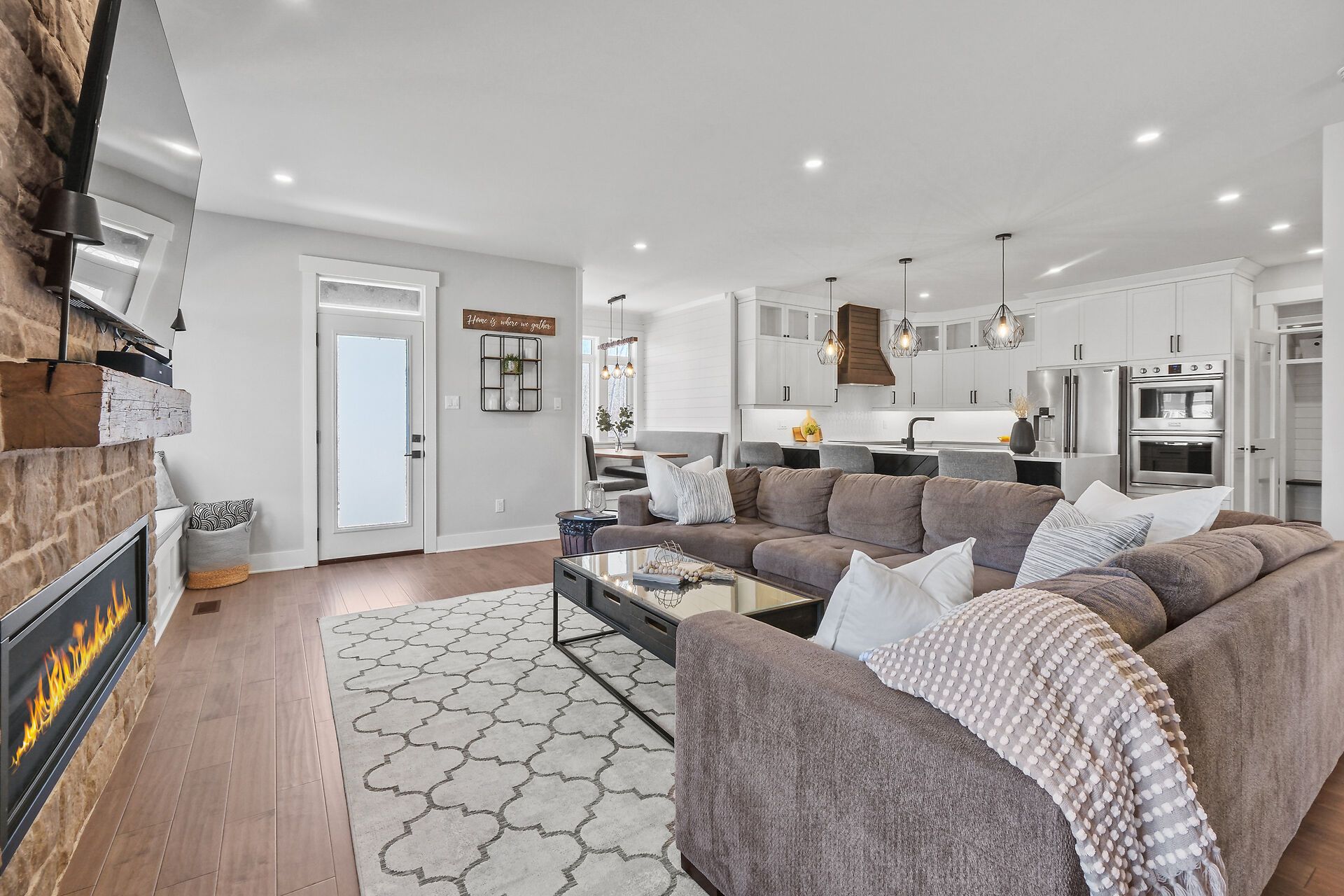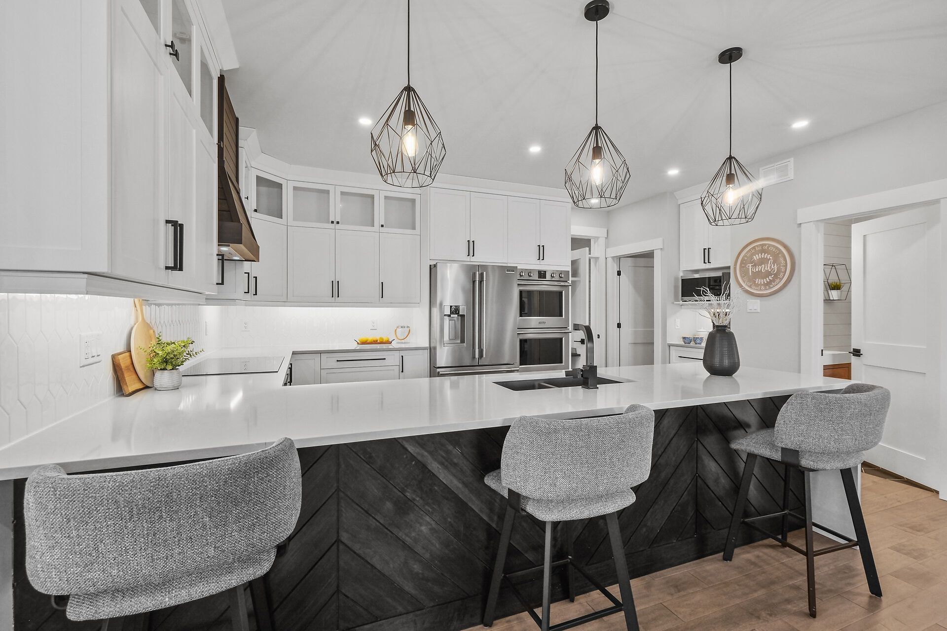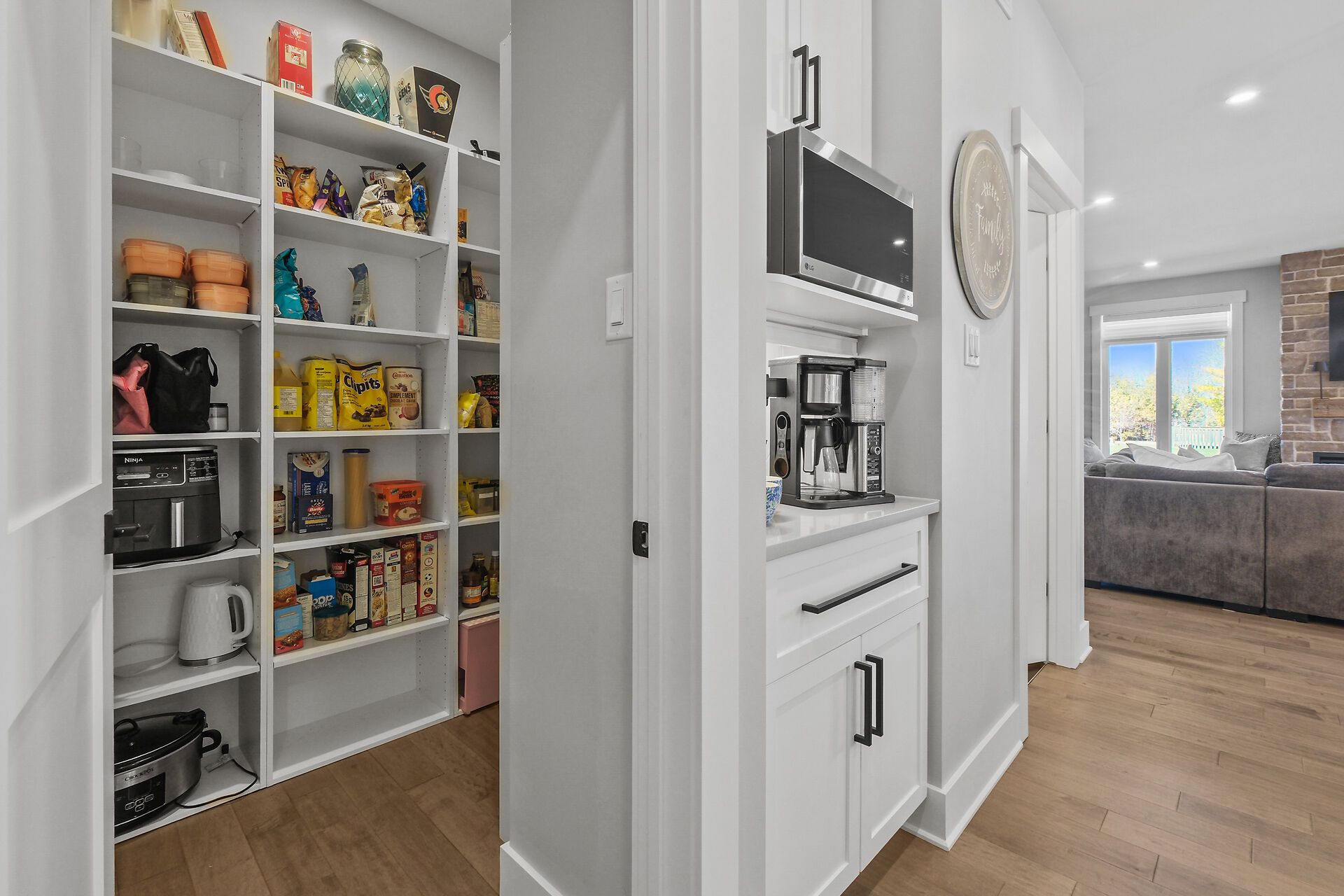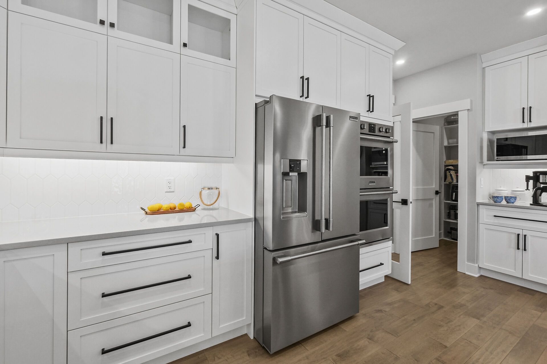 • Gourmet kitchen features quartz counters, built-in ovens, and a walk-in pantry.