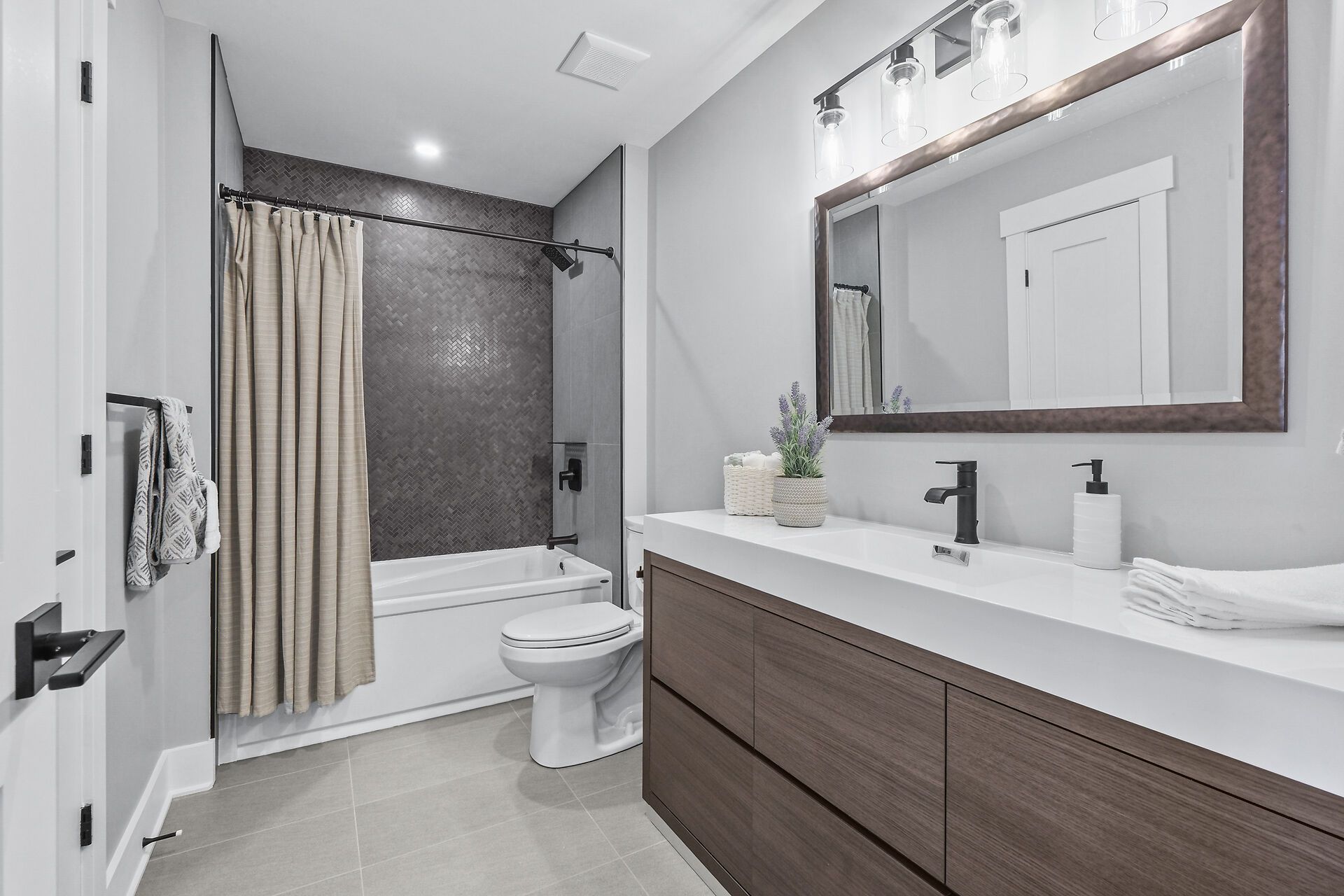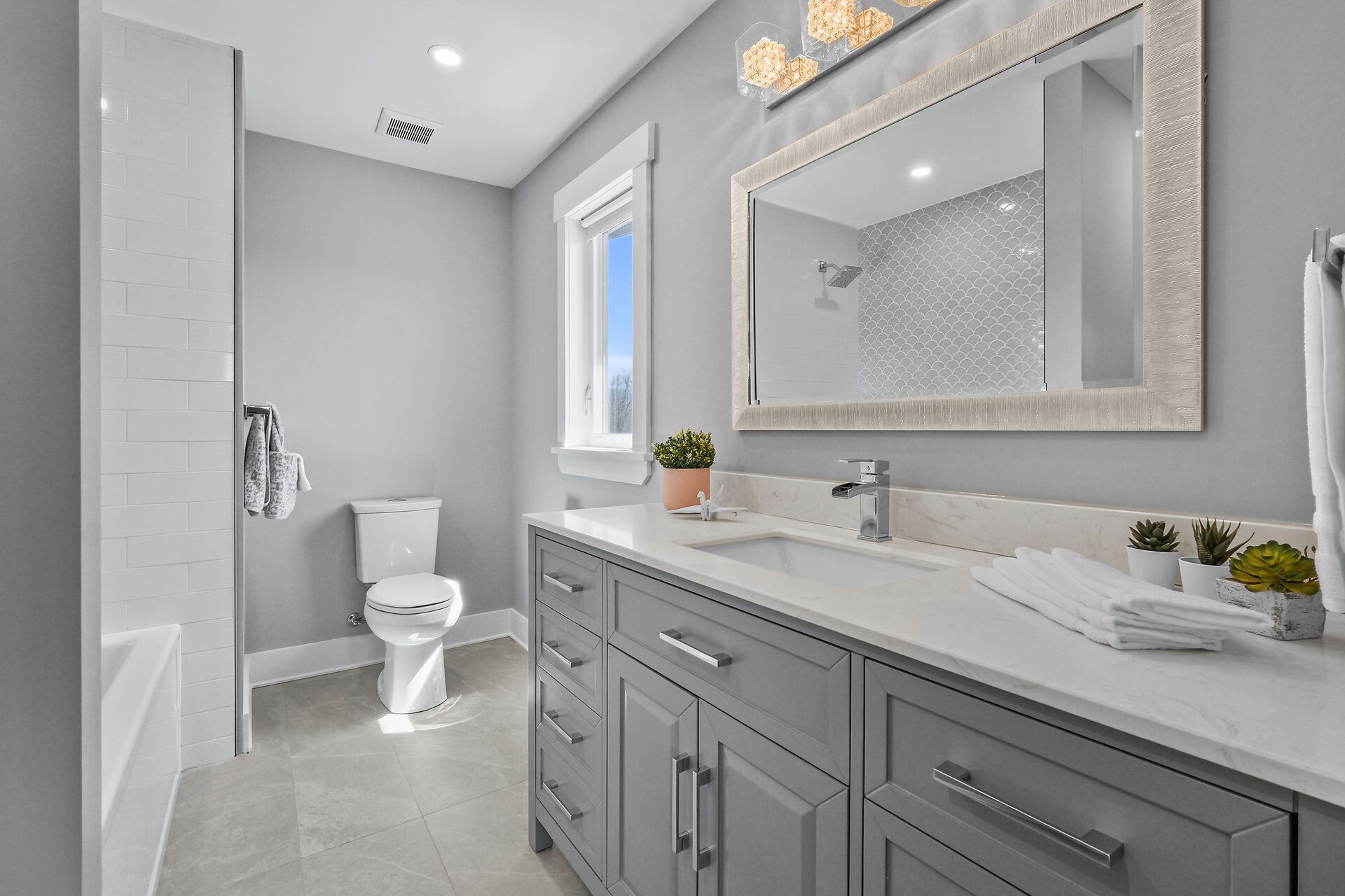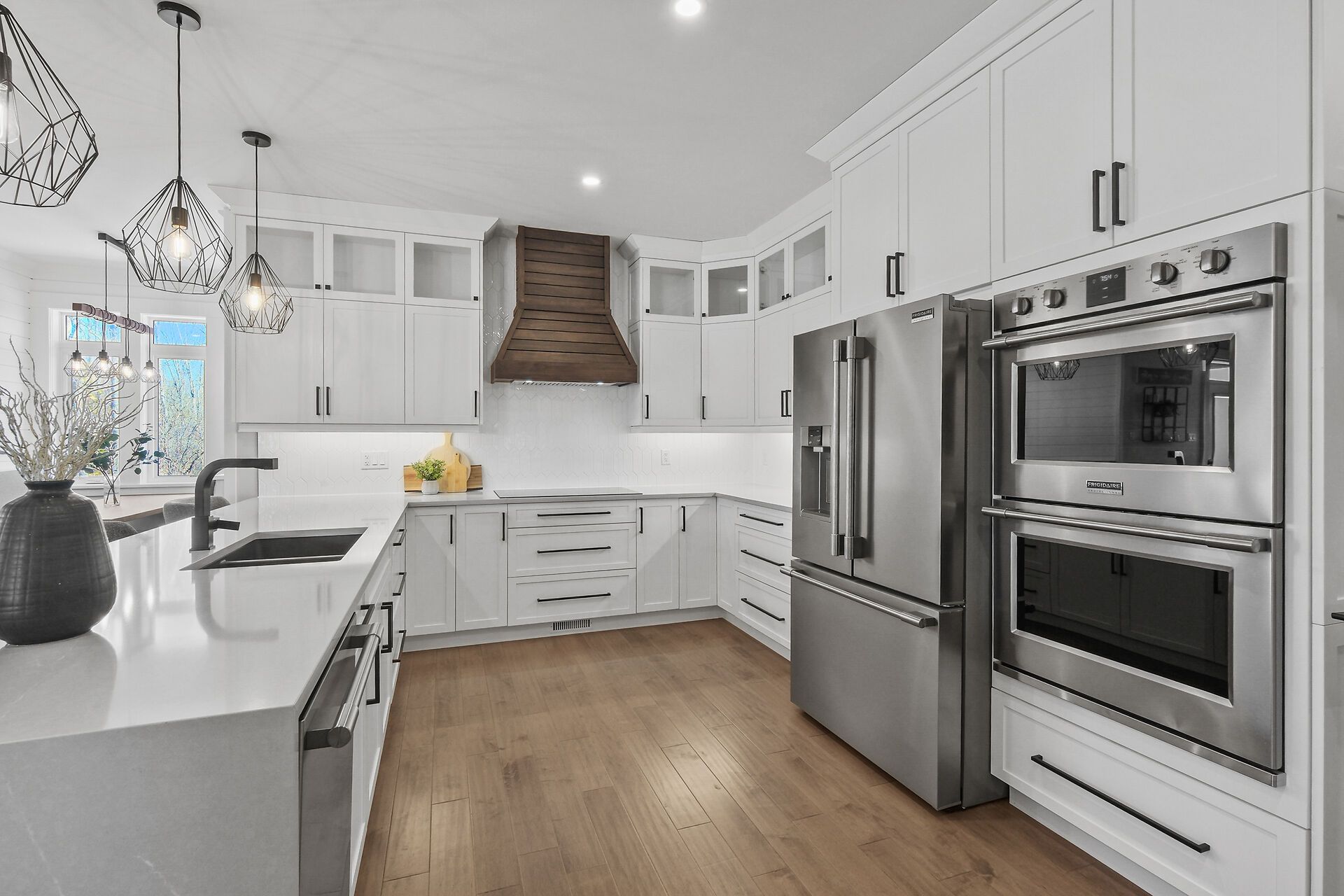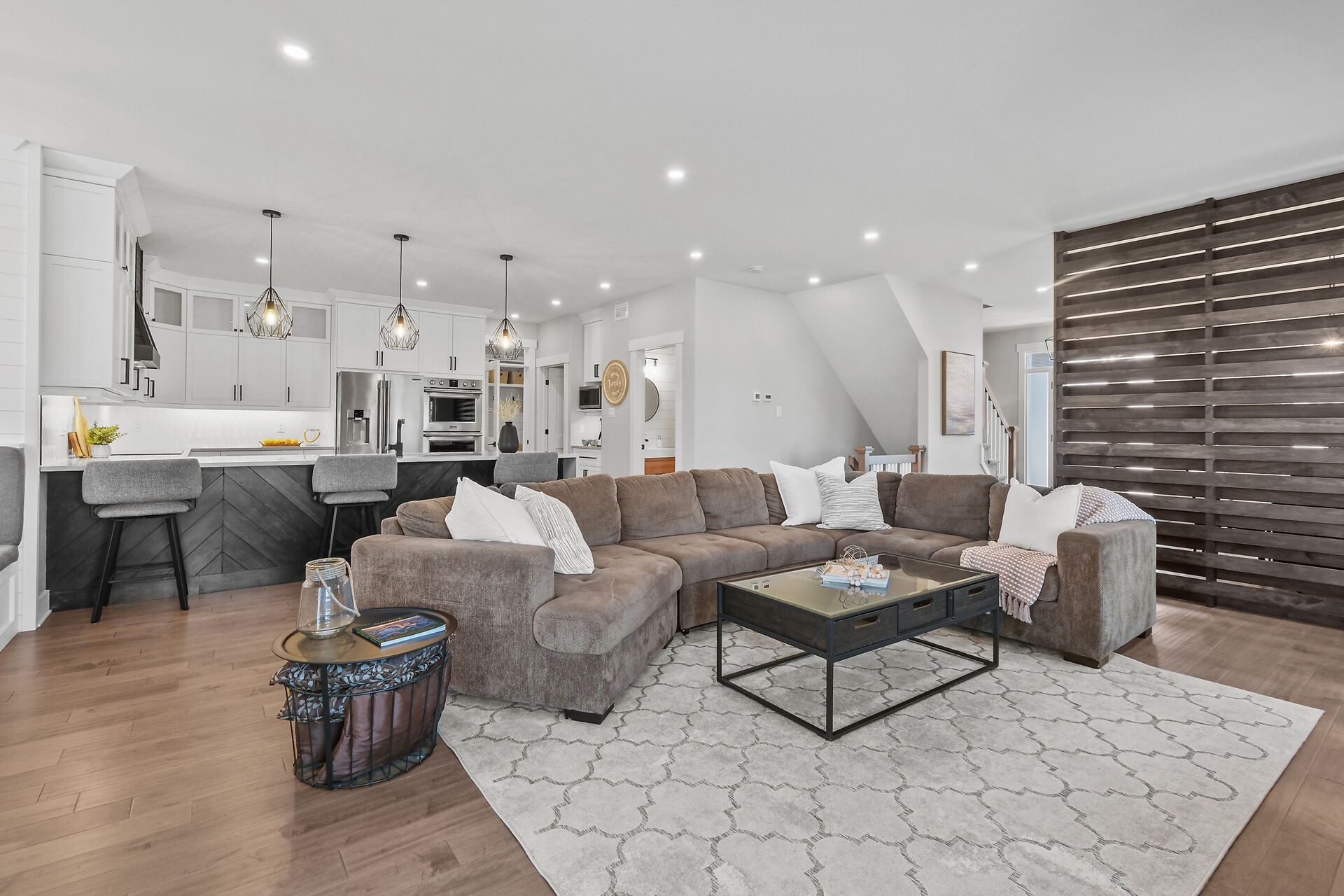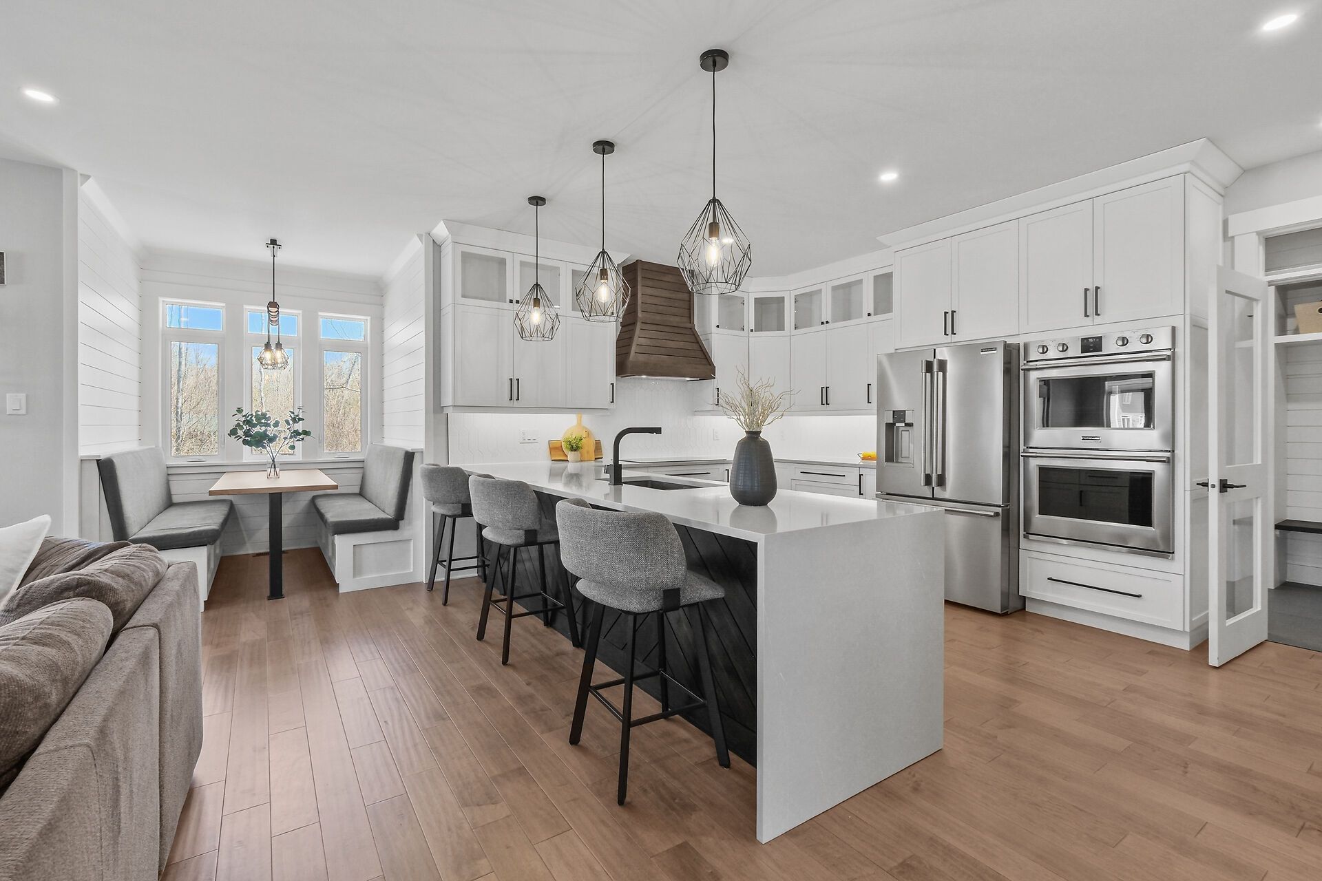 • Gourmet kitchen features quartz counters, built-in ovens, and a walk-in pantry.
