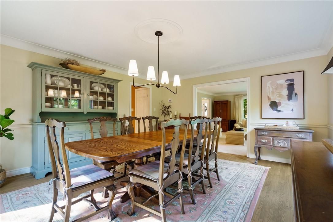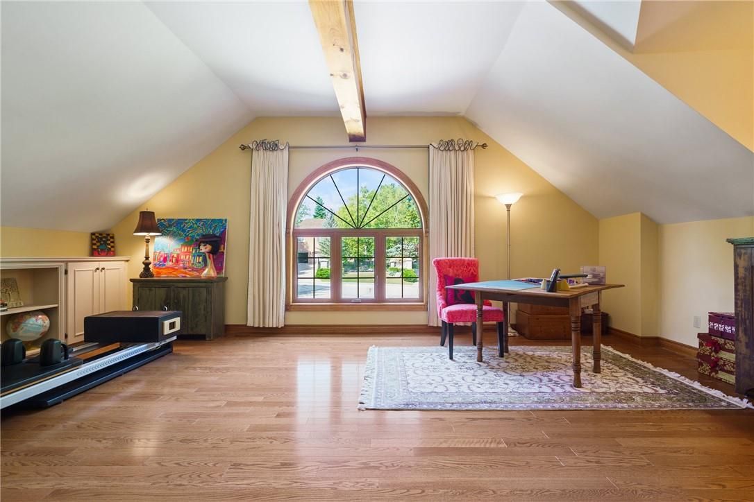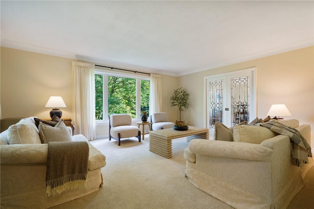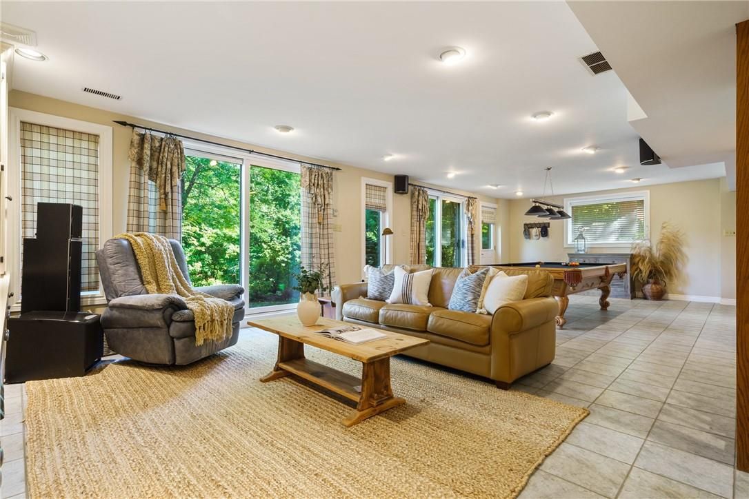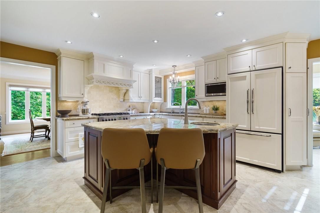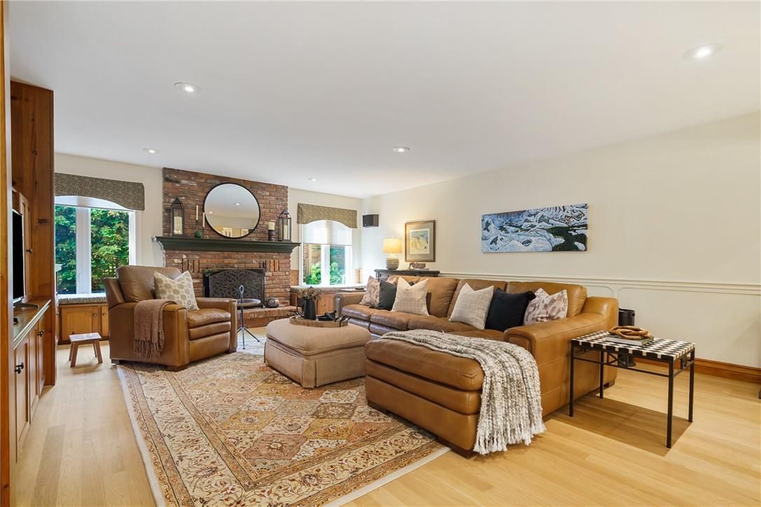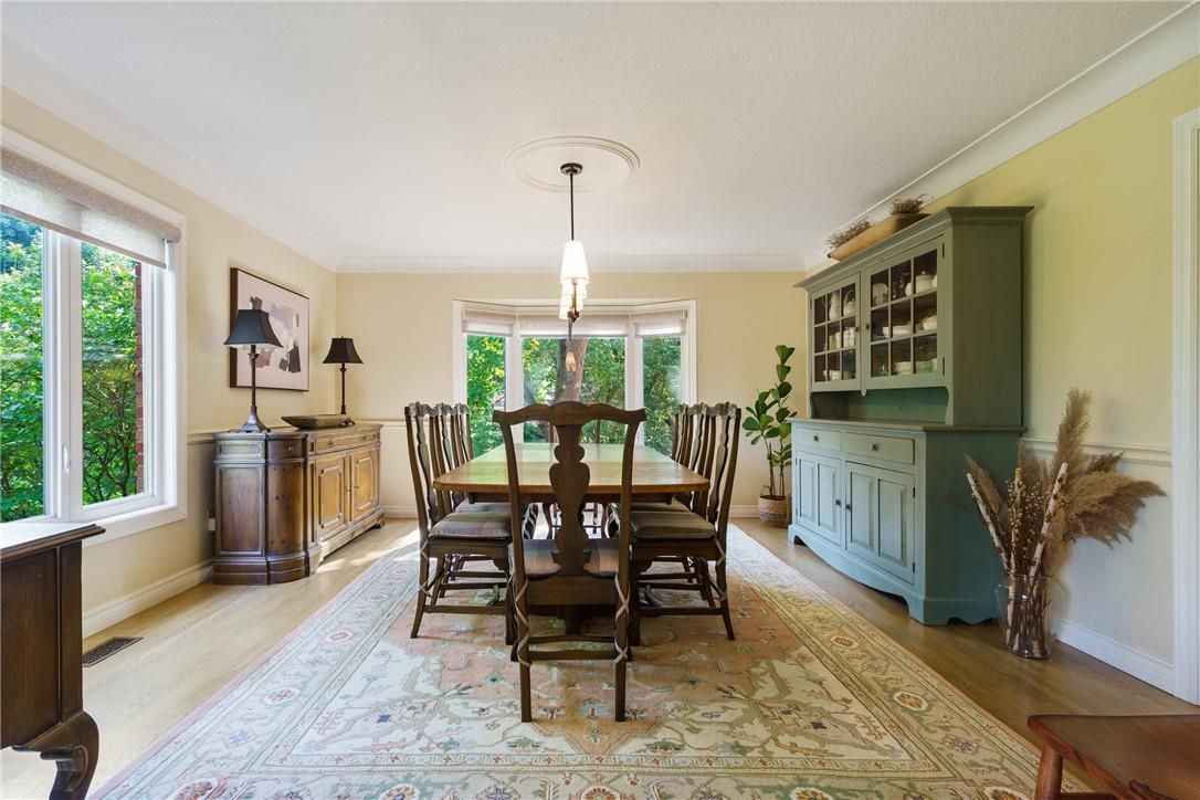 A rare blend of luxury, privacy, and pure lifestyle magic-this exceptional property delivers an experience unlike anything else. Set on a picturesque 0. 61-acre, tree-lined lot backing onto protected conservation lands, this pristine all-brick two-storey home offers refined living surrounded by serene, uninterrupted green space. Designed with family living and entertaining in mind, the home offers six spacious bedrooms and five well-appointed bathrooms. The main level features elegant principal rooms, including a formal living and dining area highlighted by a beautiful bay window. The chef-inspired kitchen is a standout, complete with a gas stove, stone countertops, stainless steel appliances, walk-in pantry, and a generous island with bar seating-seamlessly connecting to a bright dinette and an inviting family room anchored by a wood-burning fireplace with a classic brick mantle. Thoughtful touches continue with a sun-filled reading nook, powder room, main floor laundry, and convenient inside access to the garage. Upstairs, a sweeping oak staircase leads to a luxurious primary retreat featuring a walk-in closet and a recently updated spa-like five-piece ensuite with soaker tub and separate glass shower. Additional bedrooms are generously sized, with well-designed jack-and-jill bath layouts, ideal for family or guests. The fully finished walk-out basement expands the living space even further, offering a large recreation area, dedicated exercise room with three-piece bath and sauna, and the show-stopping squash court. Outdoors, the property transforms into a private oasis with tiered decking, a stone patio, and beautifully landscaped grounds-all perfectly oriented to capture the tranquility of the protected green space beyond. Plus, a charming log cabin retreat and a separate viewing deck perfectly positioned to take in the sweeping natural backdrop. An extraordinary offering where sophistication, comfort, and a sense of adventure come together effortlessly.