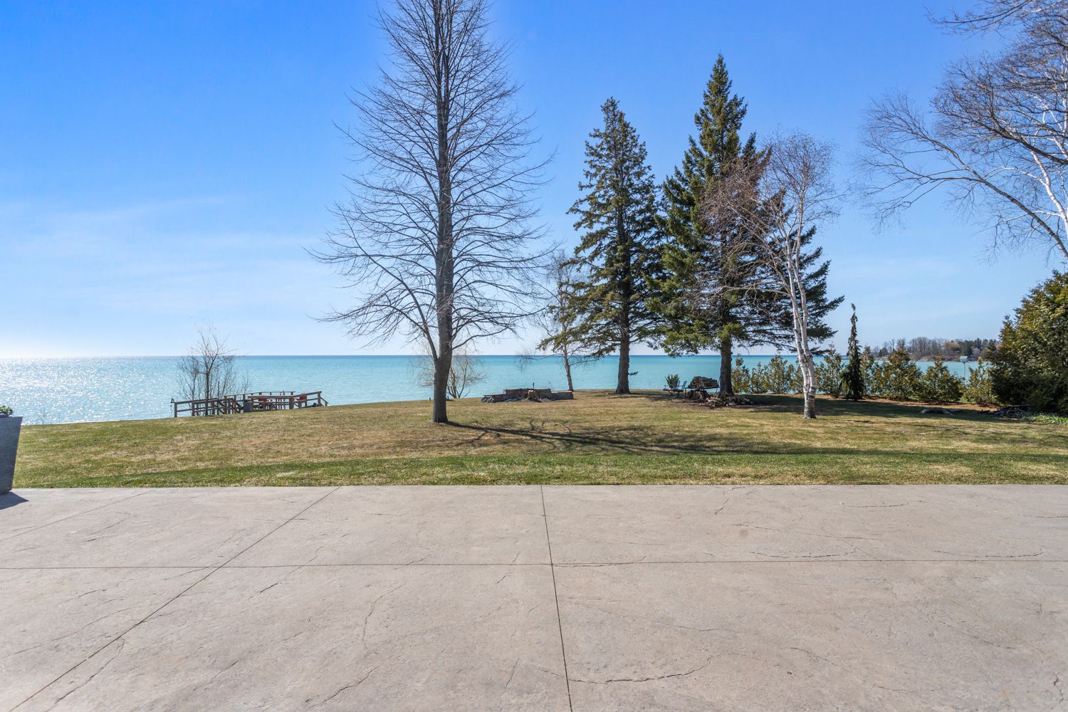 • Large outdoor entertainment space with patio, fire pit, and lake access.