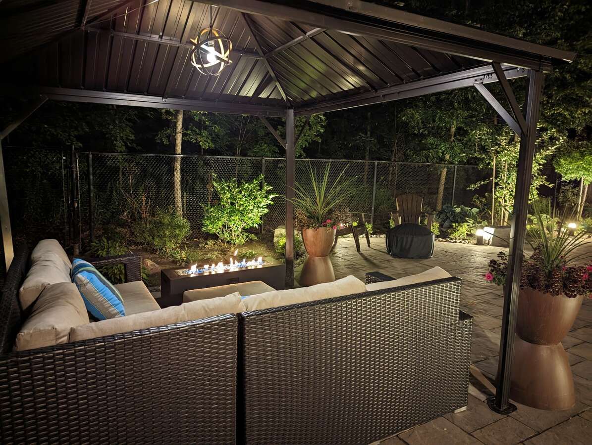 • Lush, professionally landscaped backyard with a fire pit and gazebo.