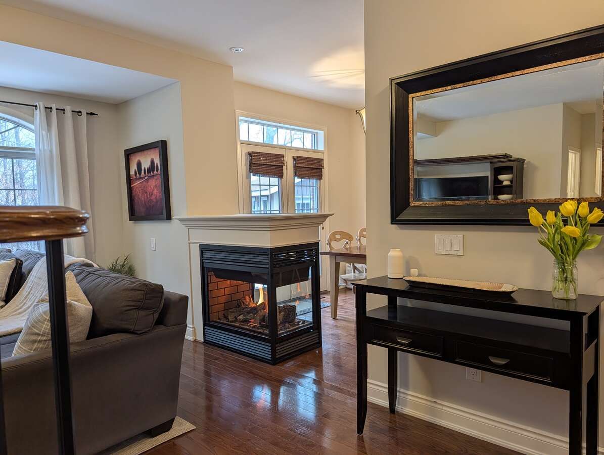 • Inviting family room with a cozy gas fireplace and large windows.