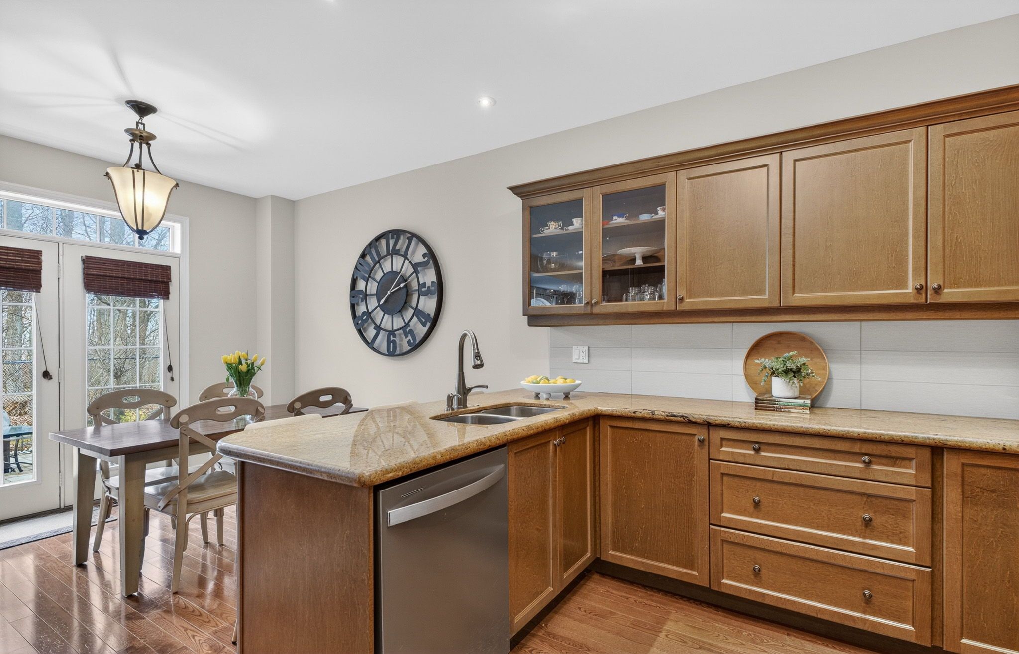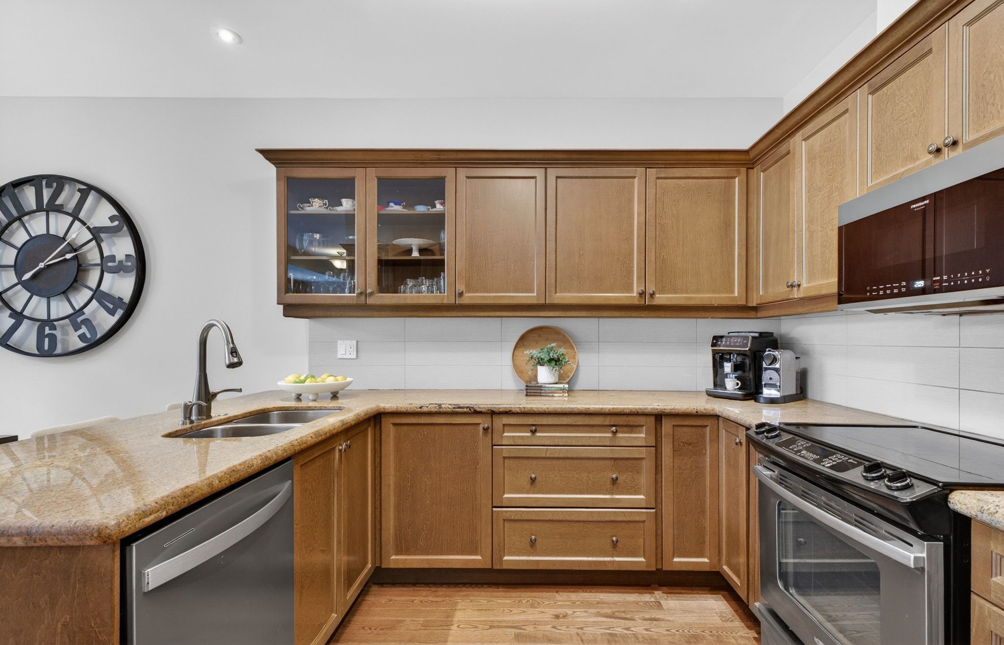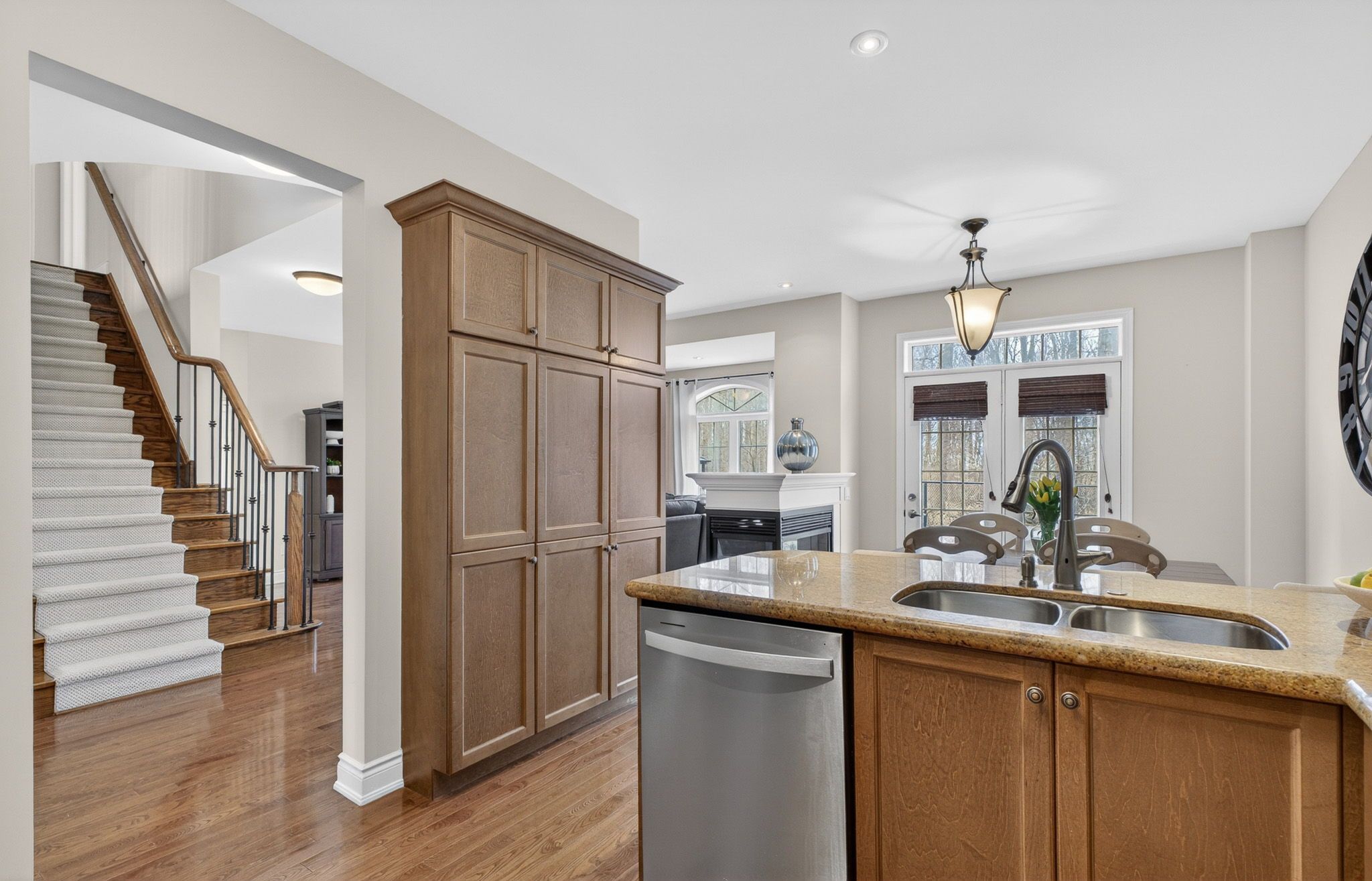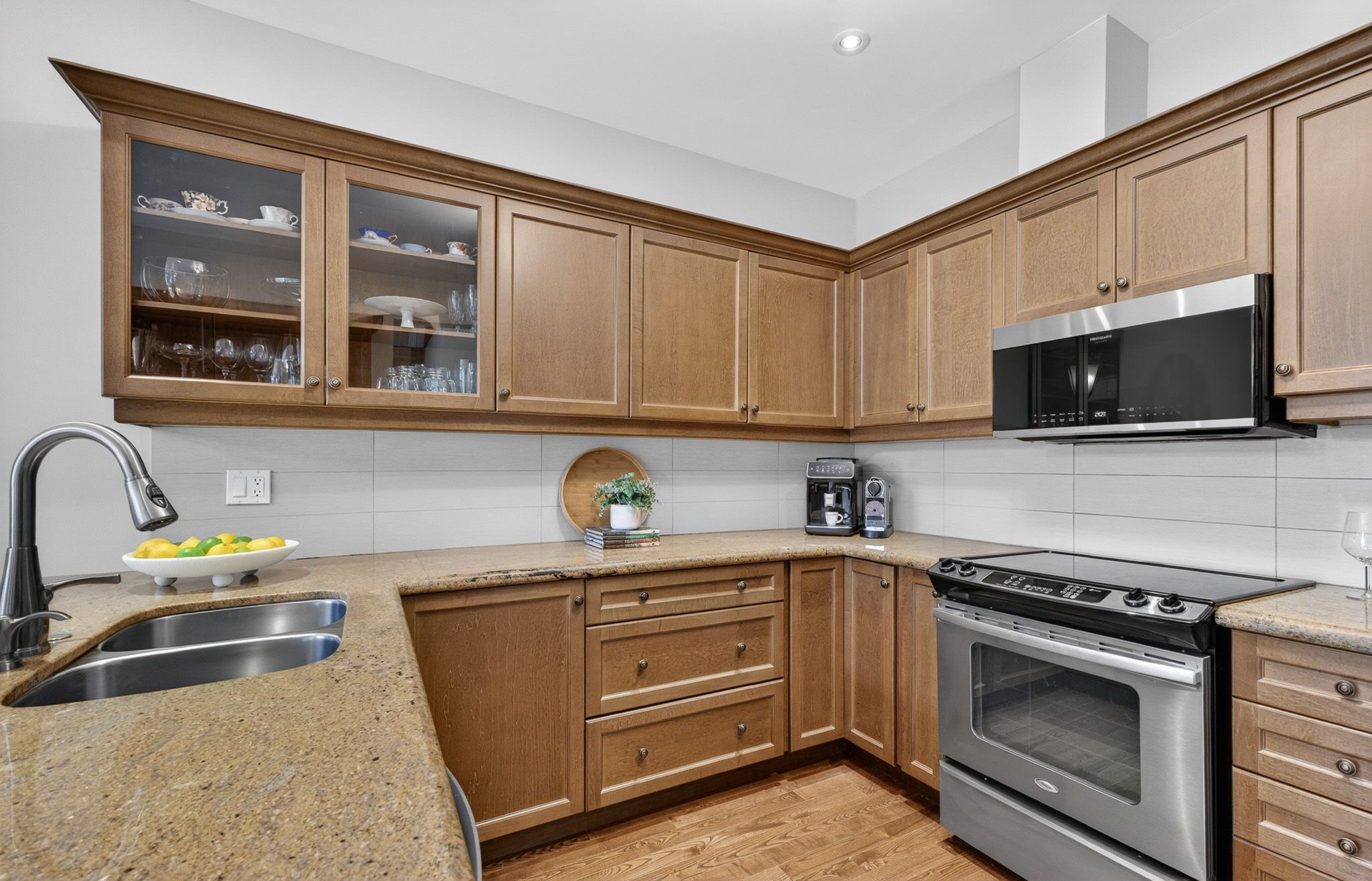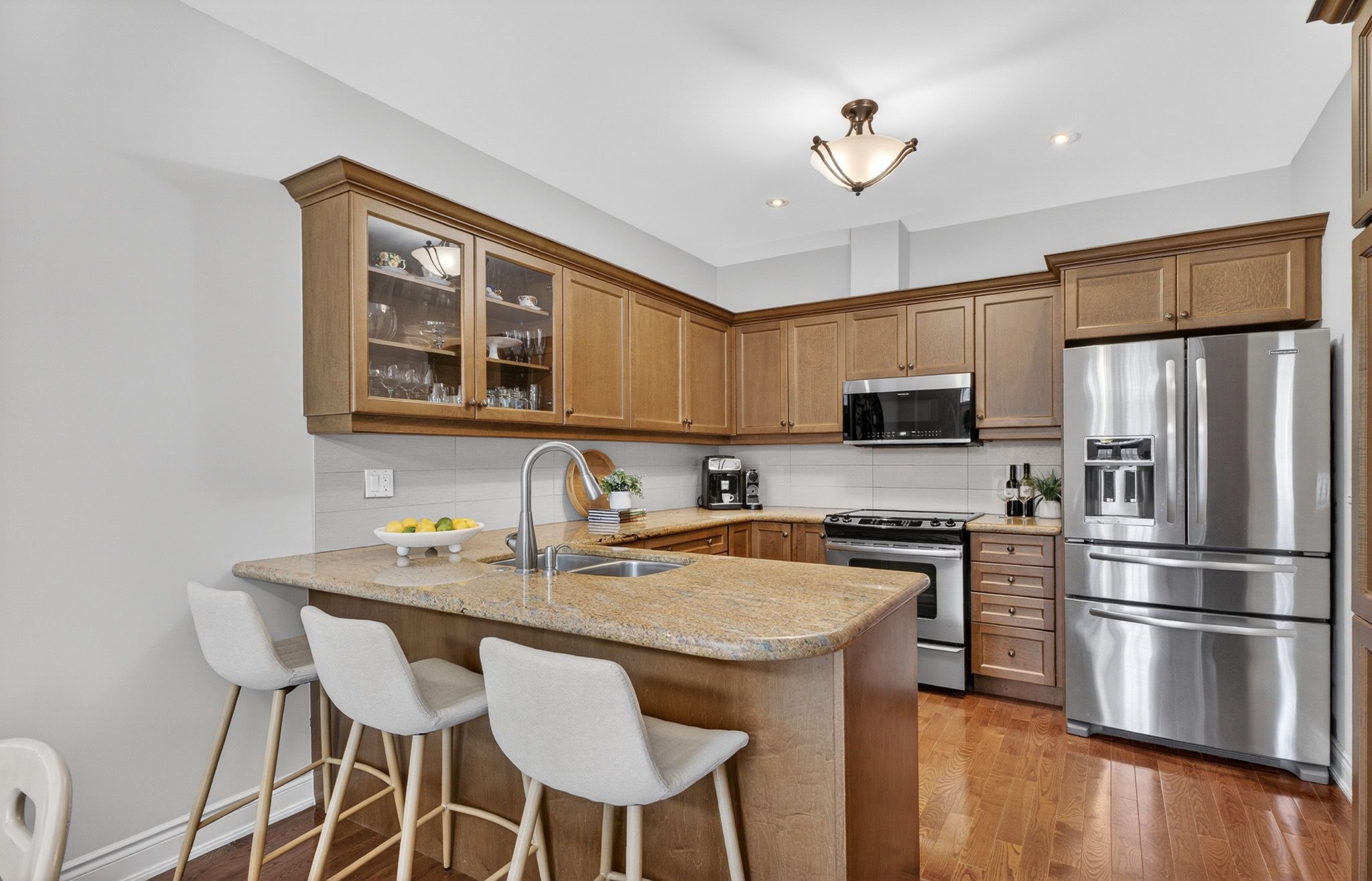 • Gourmet kitchen features granite countertops and stainless steel appliances.