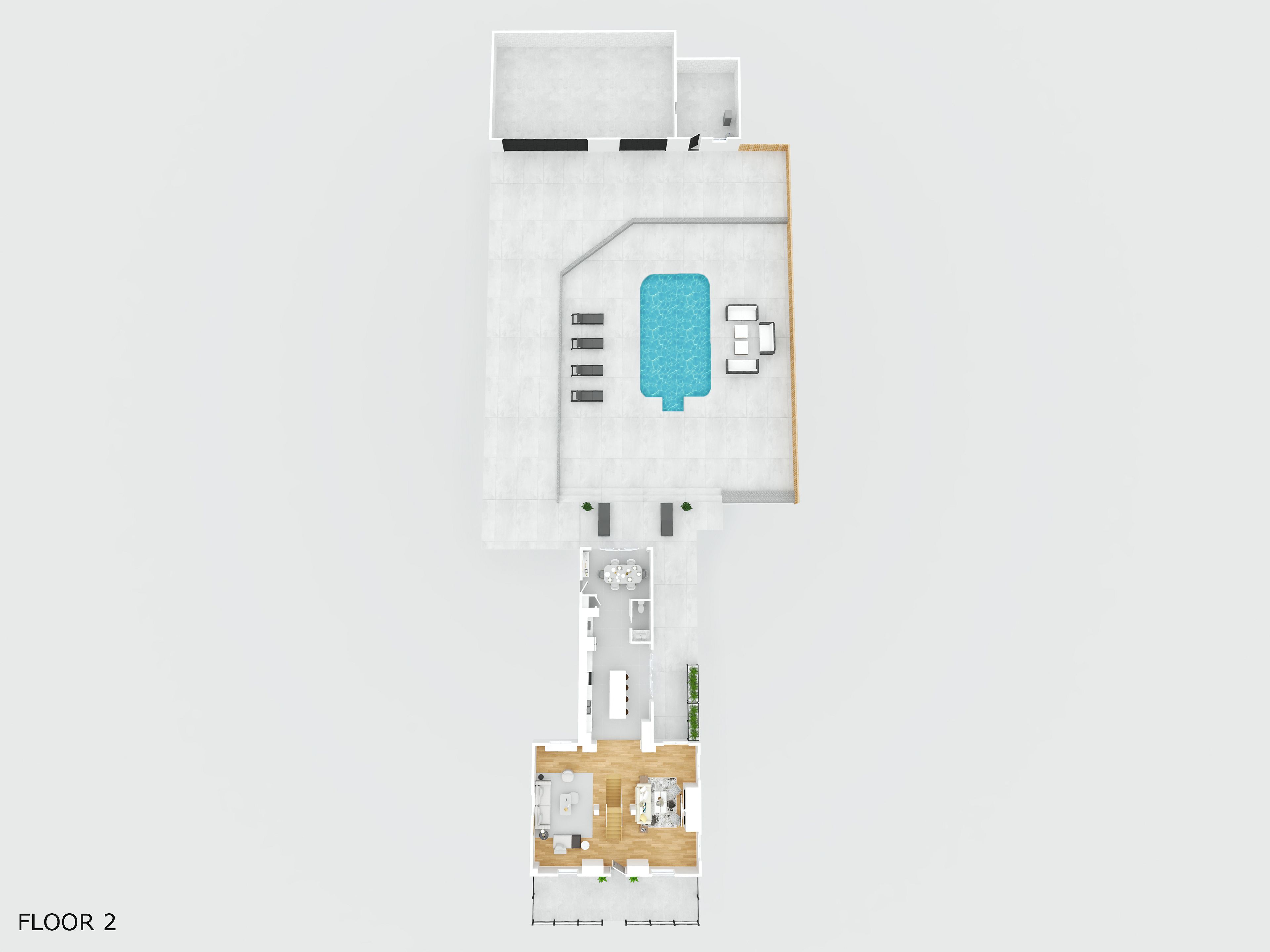 • Private oasis featuring a heated saltwater pool and tiered patio.