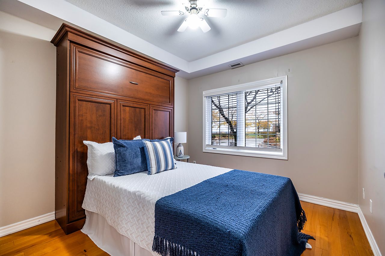 Rare ground-floor condo with unobstructed panoramic views of lake ontario from your unit with over 1000 sqf of finished living space. Beautiful 2 bedroom and 2 bath condo with large covered patio overlooking the park and lake with direct access into the unit. Lovely open concept floor plan featuring a large eat-in kitchen with breakfast bar, 9 foot ceilings, engineered hardwood flooring, primary bedroom with full ensuite bath, 2nd bedroom with convenient "murphy" bed, laundry area, one underground car parking is included a 2nd spot is currently rented. This luxury condo has it all with ownership that includes an exclusive gold membership to the admirals walk clubhouse enjoy access to a fully equipped gym, oversized indoor pool, steam room, on-site restaurant, and a host of additional premium amenities and community events that elevate everyday living. Convenient location only minutes to the 401 and and offers endless outdoor opportunities located directly on the lake. Do not miss this rare ground floor unit! See hd video of this fabulous unit and its lake views!