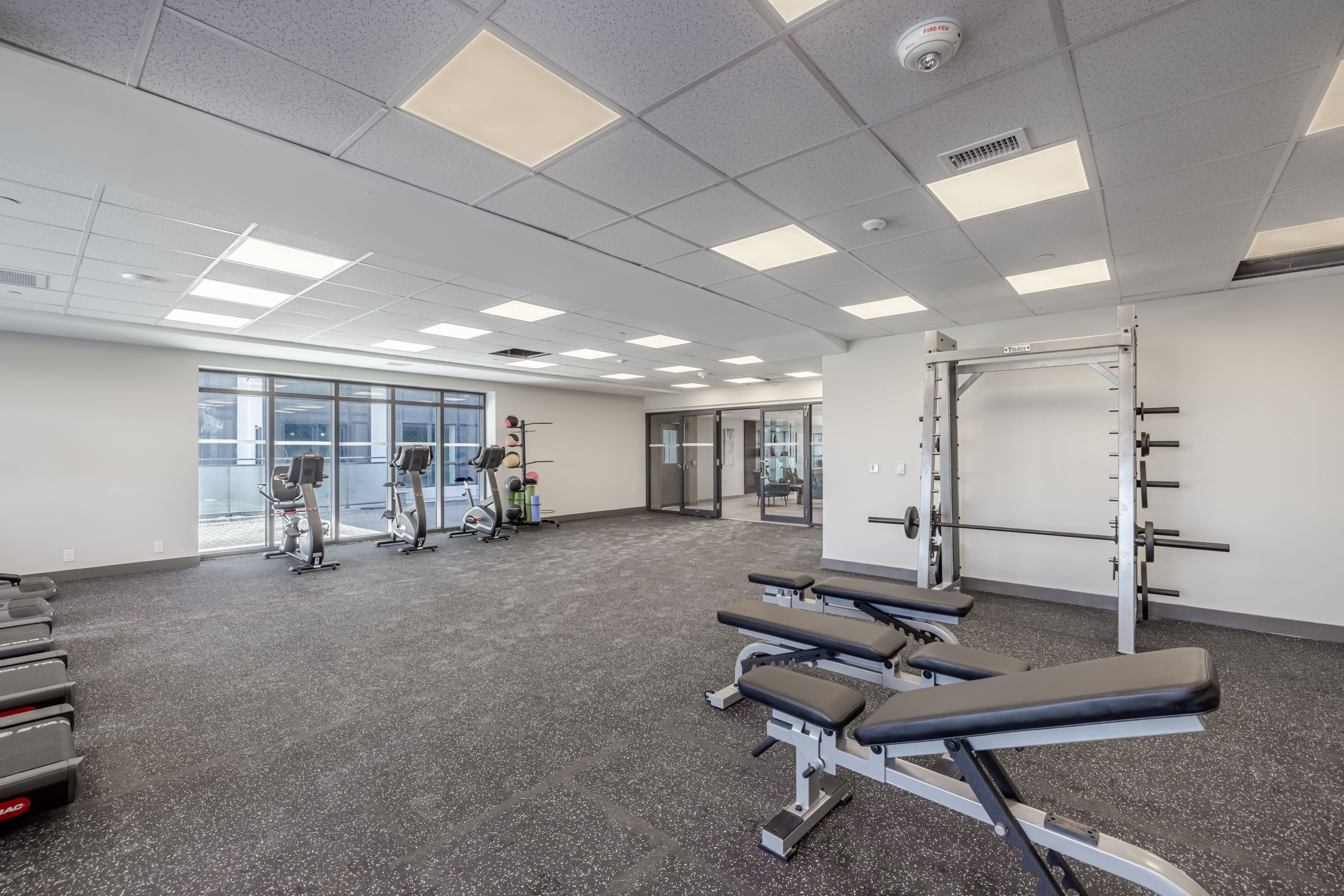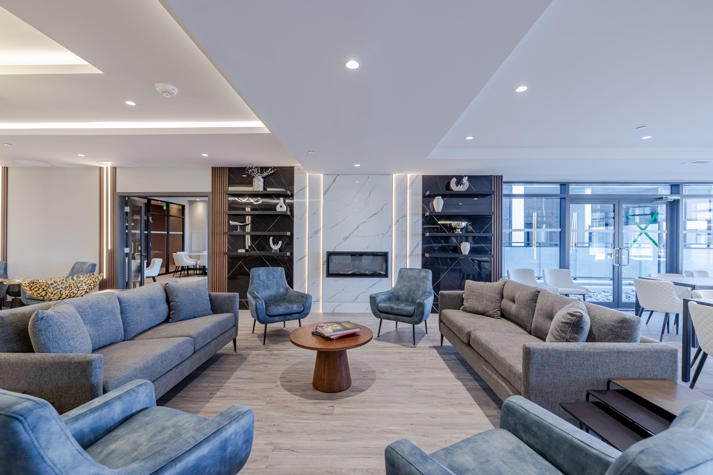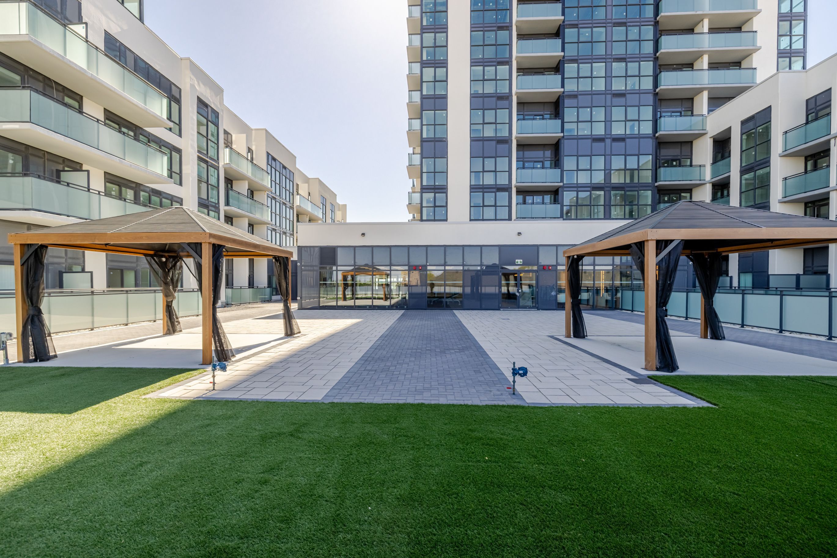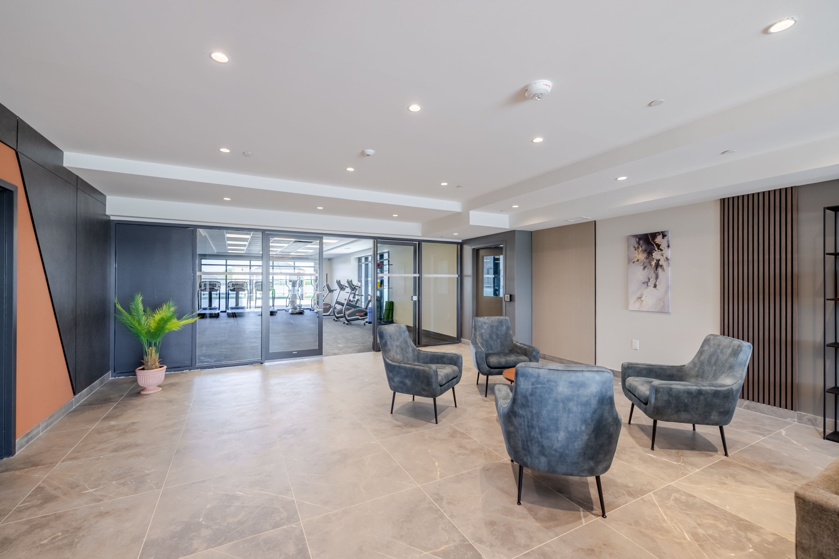 • Amenities include a gym, outdoor terrace, party room, and co-working space.