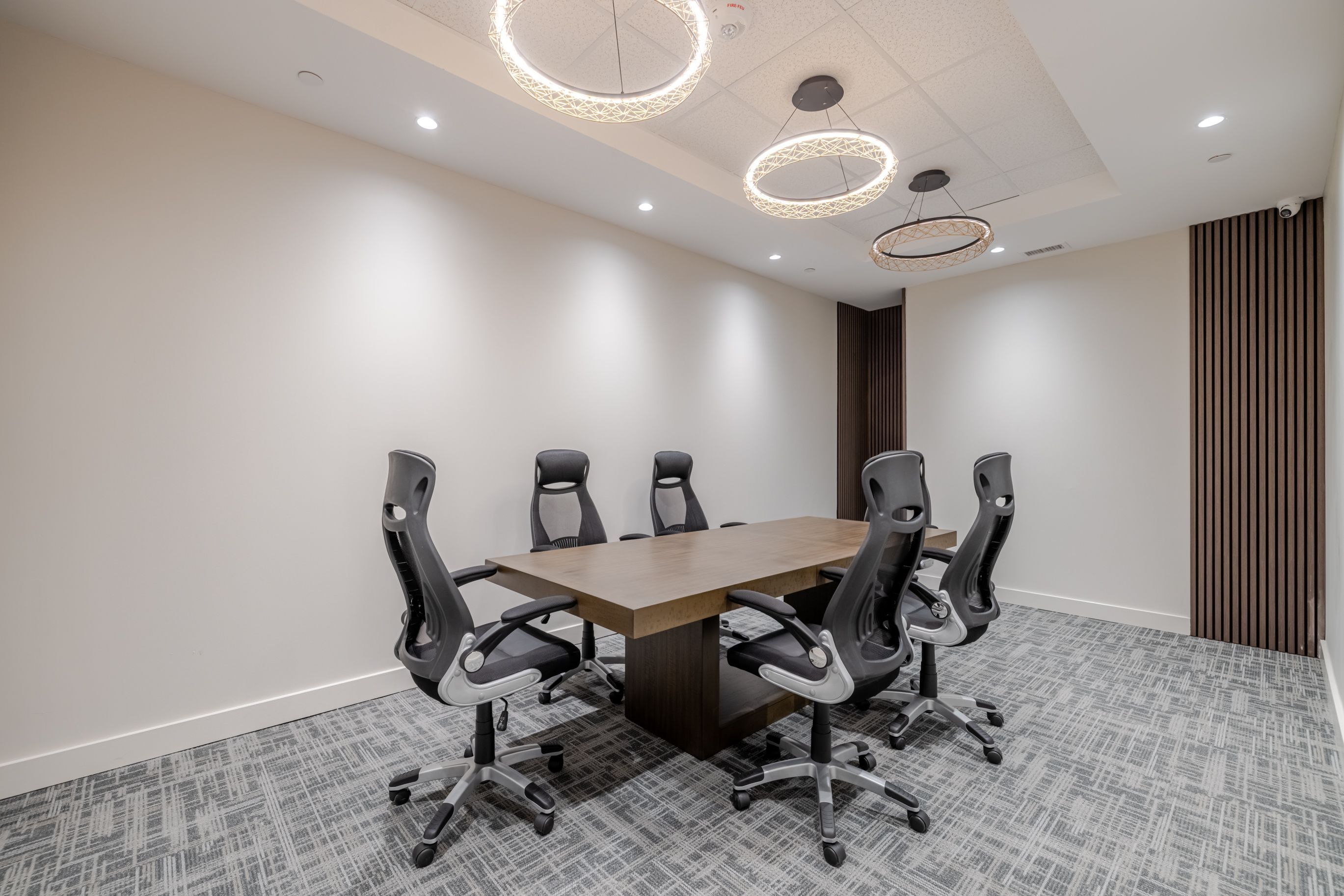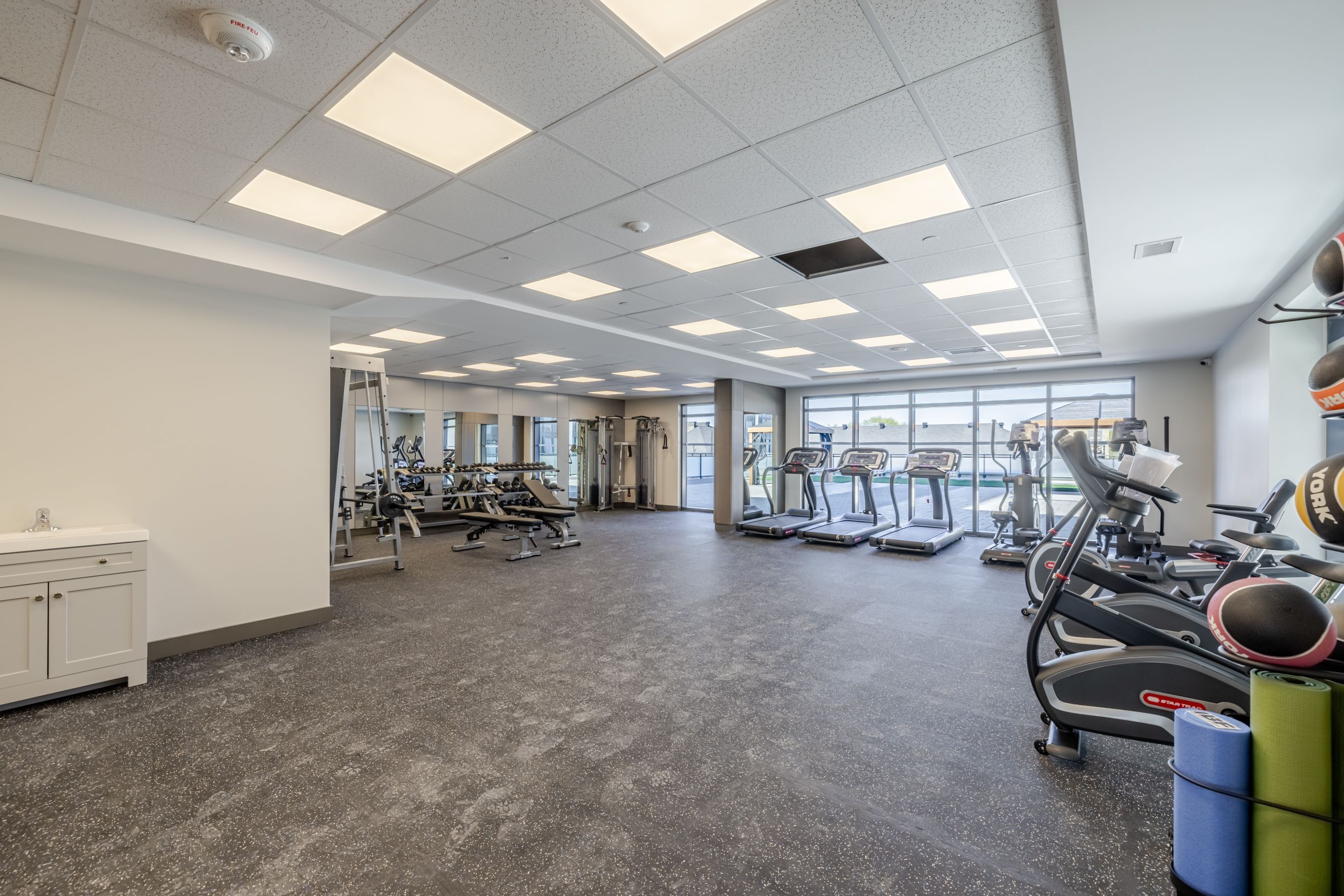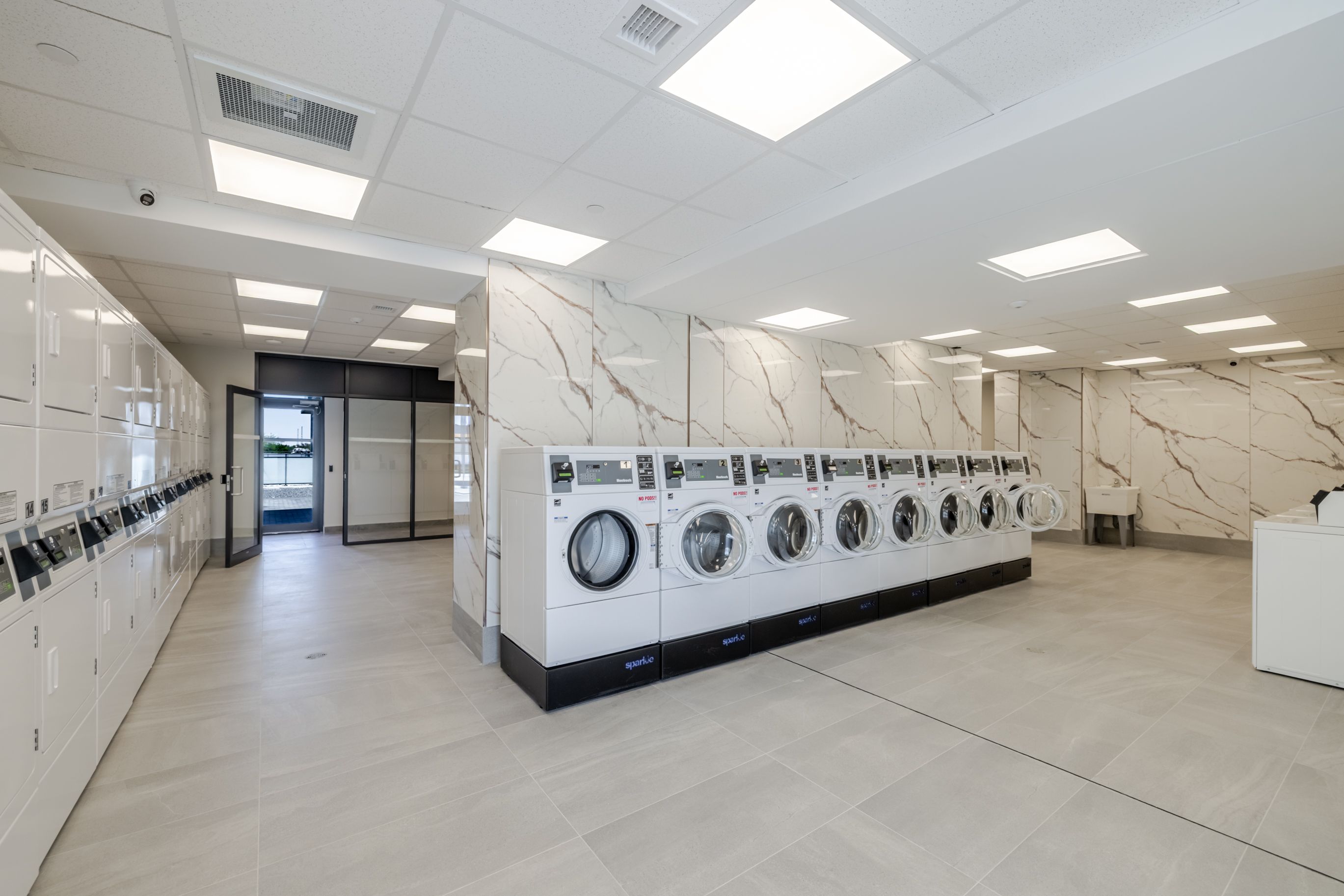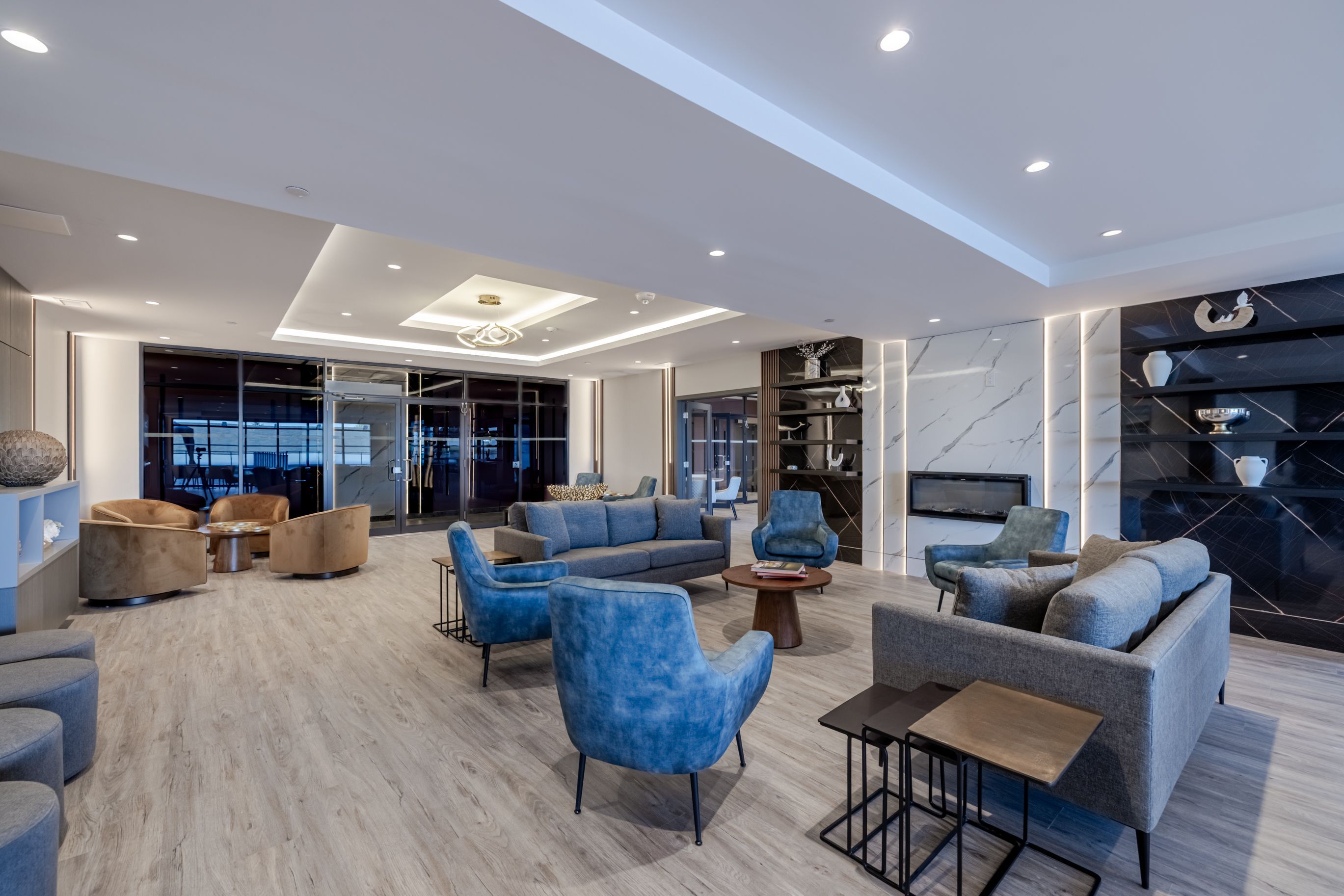 • Amenities include a gym, outdoor terrace, party room, and co-working space.