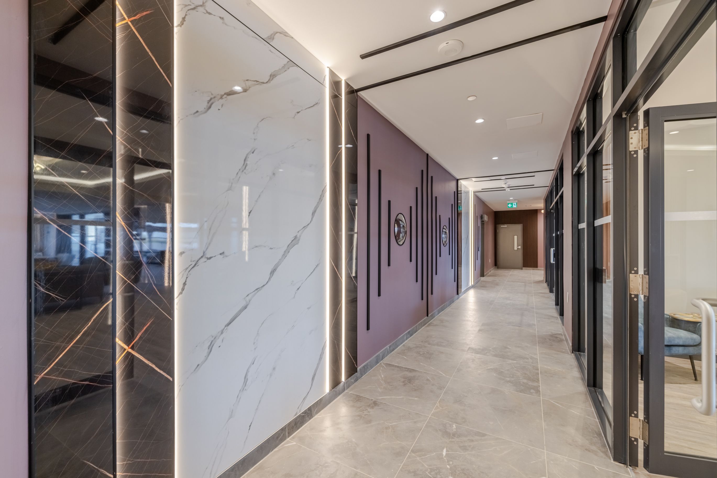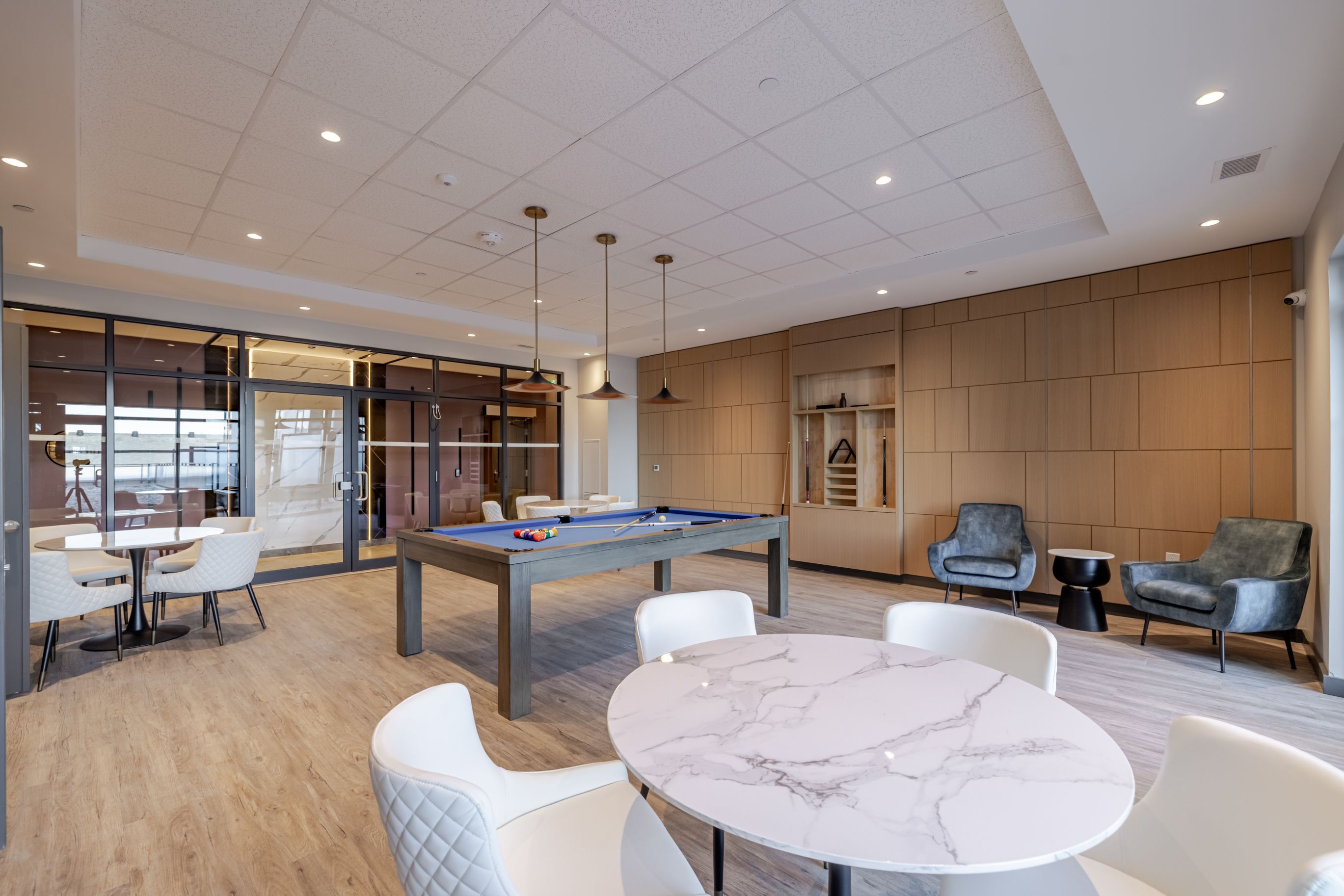 • Suites feature high-end finishes like stainless steel appliances and quartz countertops.