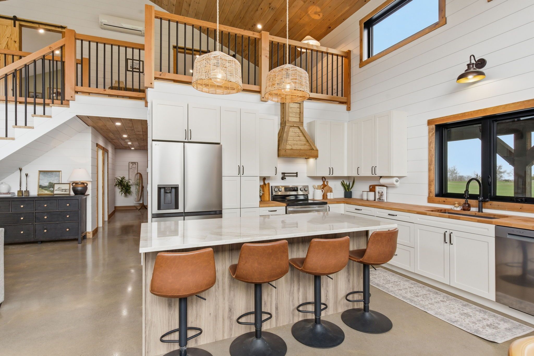 For those seeking an elevated rural lifestyle, this contemporary home offers the perfect balance of warmth and beauty, grounded in modern farmhouse charm. Set on 1. 8 acres, the surrounding exterior mirrors the home's natural elements. Step inside to discover a striking architectural interior, where vaulted ceilings and expansive windows define the home's signature barndominium style, filling the space with natural light and an airy, open feel. The chef-inspired kitchen is as functional as it is beautiful, featuring a large centre island and abundant counter space and cabinetry. Uniquely designed as a natural extension of the main kitchen, the secret pantry is dedicated to prep and storage and designed to streamline workflow. This space keeps the main kitchen tidy and organized, allowing for a seamless cooking and entertaining experience. Privately positioned at the rear of the home, the primary bedroom offers a peaceful retreat, complete with a 3-piece ensuite featuring a glass shower and a spacious walk-in closet. A beautifully crafted open staircase leads to a full-size loft, offering a unique vantage point over the main living area while adding architectural interest and flexible living space. Here, the second and third bedrooms are thoughtfully positioned and share a semi-private ensuite. The well-designed jack & jill 5-piece bathroom provides both convenience and privacy with dual access from both bedrooms. The oversized garage offers far more than just parking. Its extended depth creates a versatile extension of the home, ideal for a hobby space, home gym, workshop or additional storage. A dedicated area has also been transformed into a bar, perfect for entertaining, game days, movie nights, or your own private retreat. Impressive covered porches grace both sides of the home - inviting outdoor living spaces, ideal for dining, entertaining, or simply relaxing while taking in the surrounding natural beauty-effortlessly extending the living space in every season.