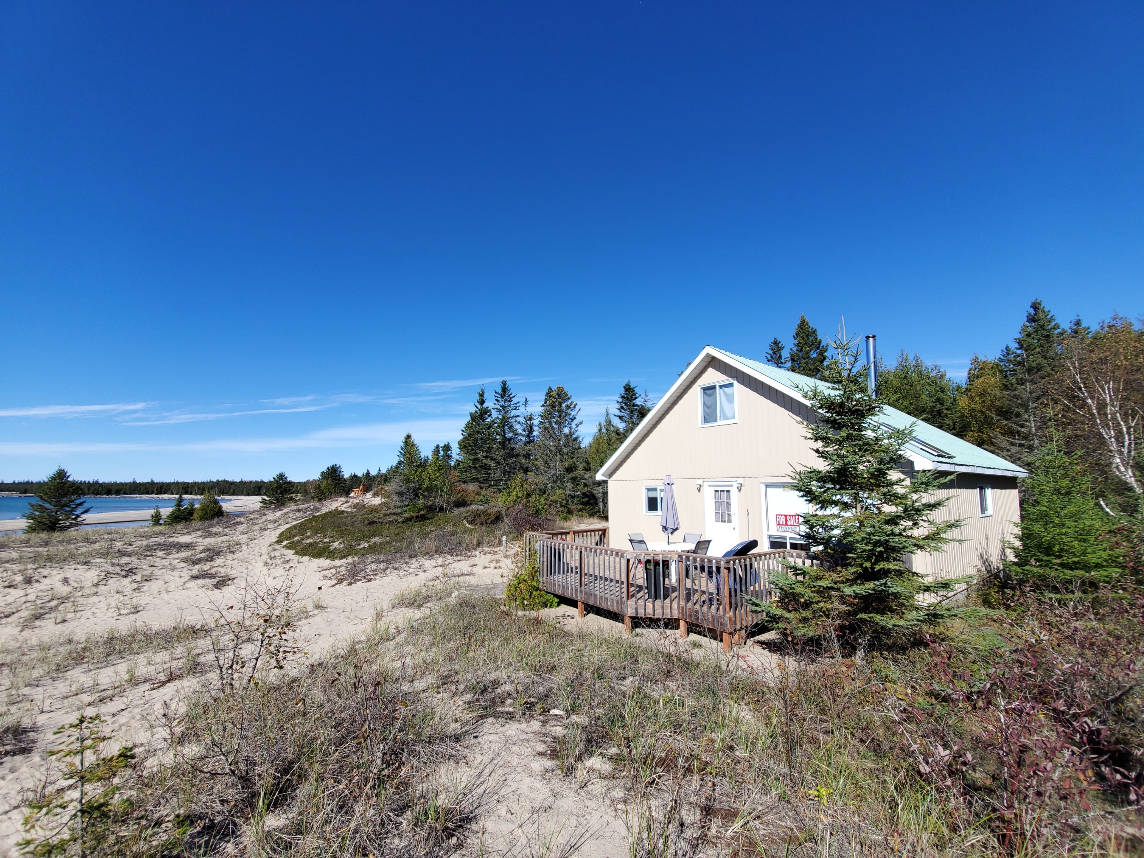 Located on two acres overlooking sand dunes on manitoulin's tranquil south shore, this off-grid waterfront cottage offers rare privacy and a deep sense of calm. Overlooking the crystal waters of shrigley bay, the property is defined by soft, sandy shoreline and breathtaking, uninterrupted views of lake huron. The cottage itself is a charming 1. 5-storey with a metal roof and vinyl siding, designed for seasonal living with a welcoming, low-maintenance appeal. Inside, you'll find warm wood finishes throughout, a full kitchen with gas stove, and a cozy wood stove in the living area for cooler evenings. The open-concept layout includes two bedrooms, a 3-piece bathroom, and a dining area that feels perfectly in tune with its natural surroundings. A generous deck offers front-row seats to sunsets and starlit skies, while a rustic playhouse adds charm and extra utility. With solar power, a well, and a septic system already in place, this cottage blends simplicity with comfort. Whether you're unwinding on the deck, exploring nearby trails, or kayaking the quiet bay, this retreat is all about reconnecting with nature, with loved ones, and with yourself. It's a rare opportunity to own waterfront on manitoulin island with direct access to lake hurons raw beauty.
