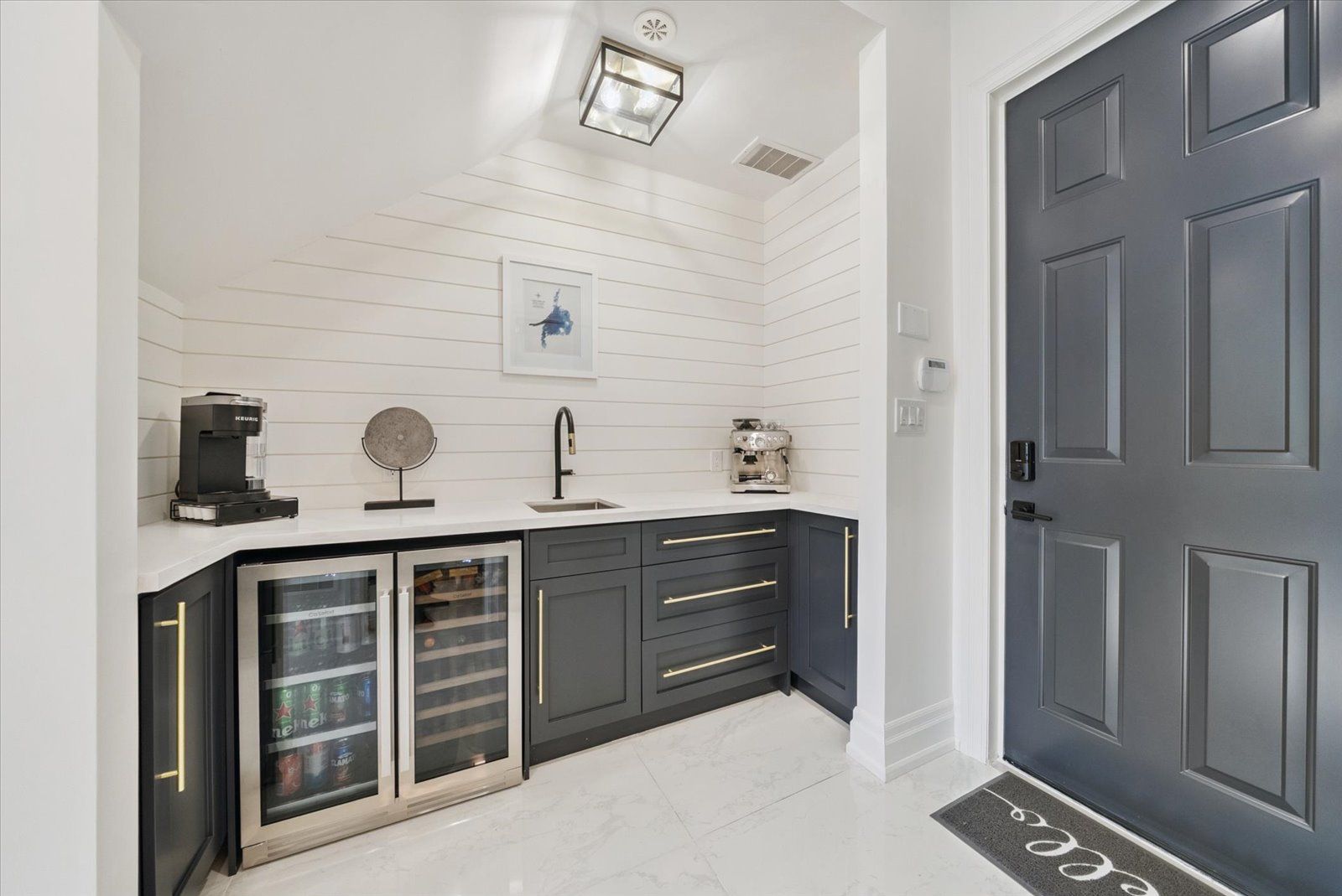 • Updated white kitchen features stainless steel appliances and a coffee station.