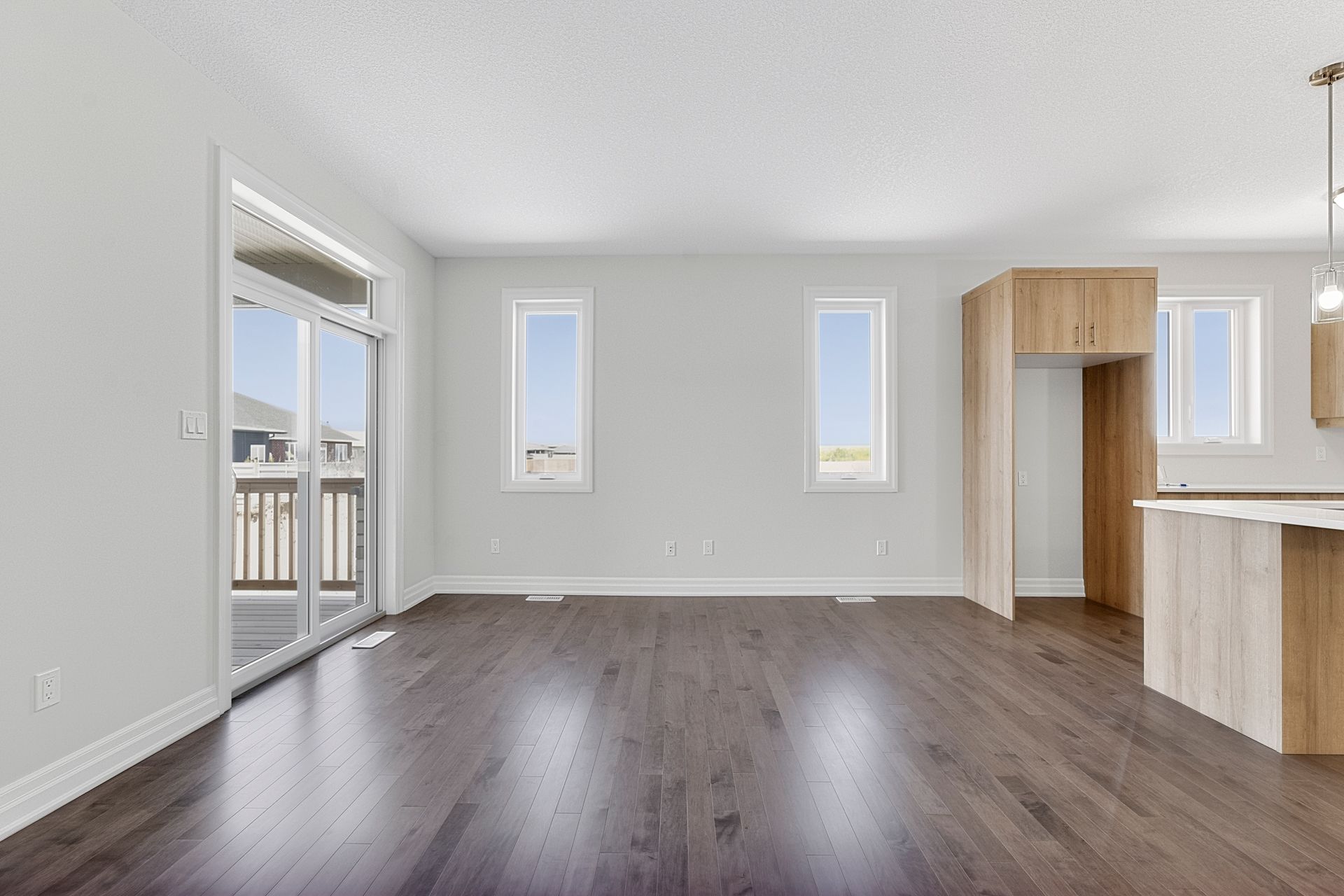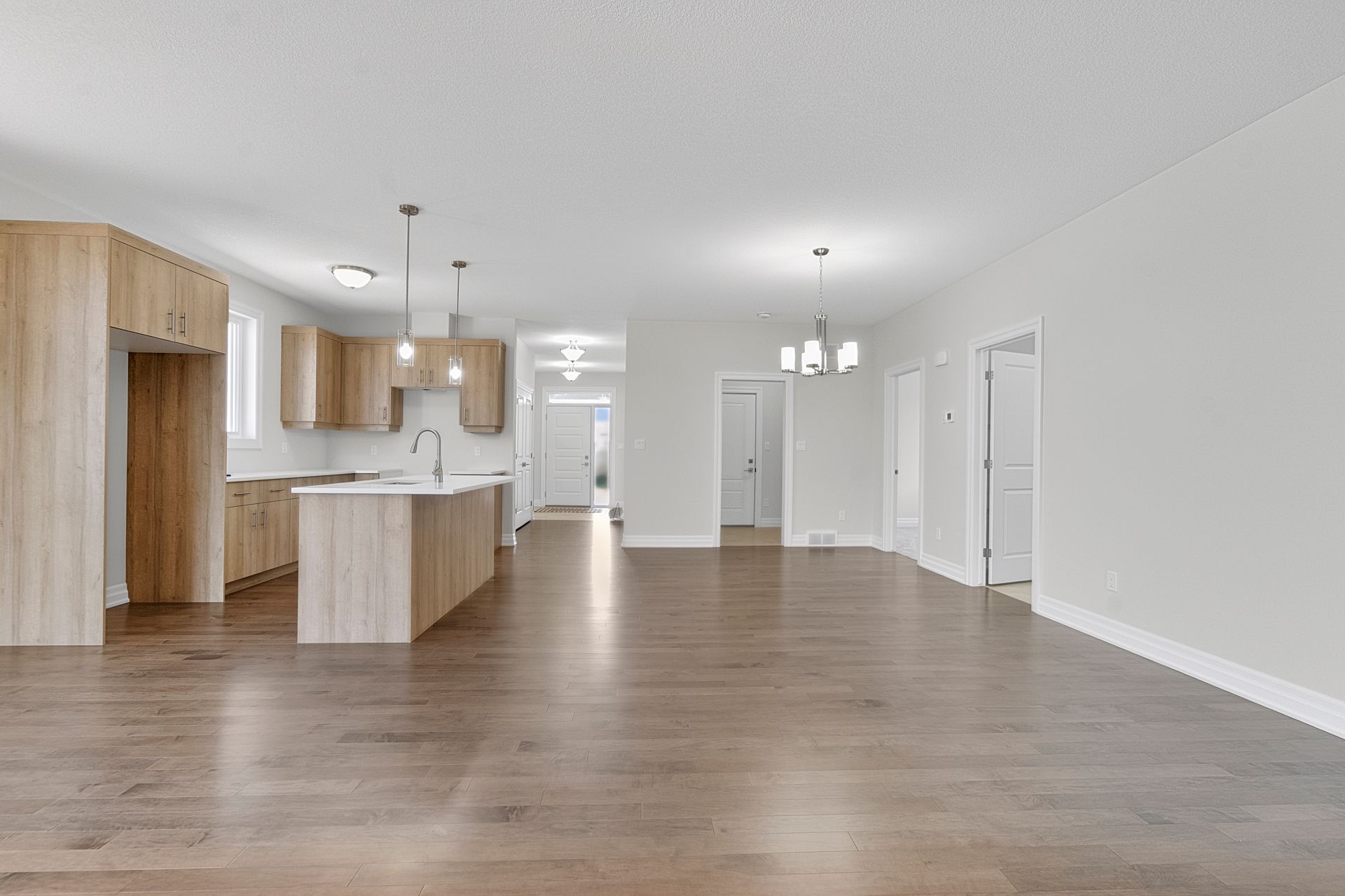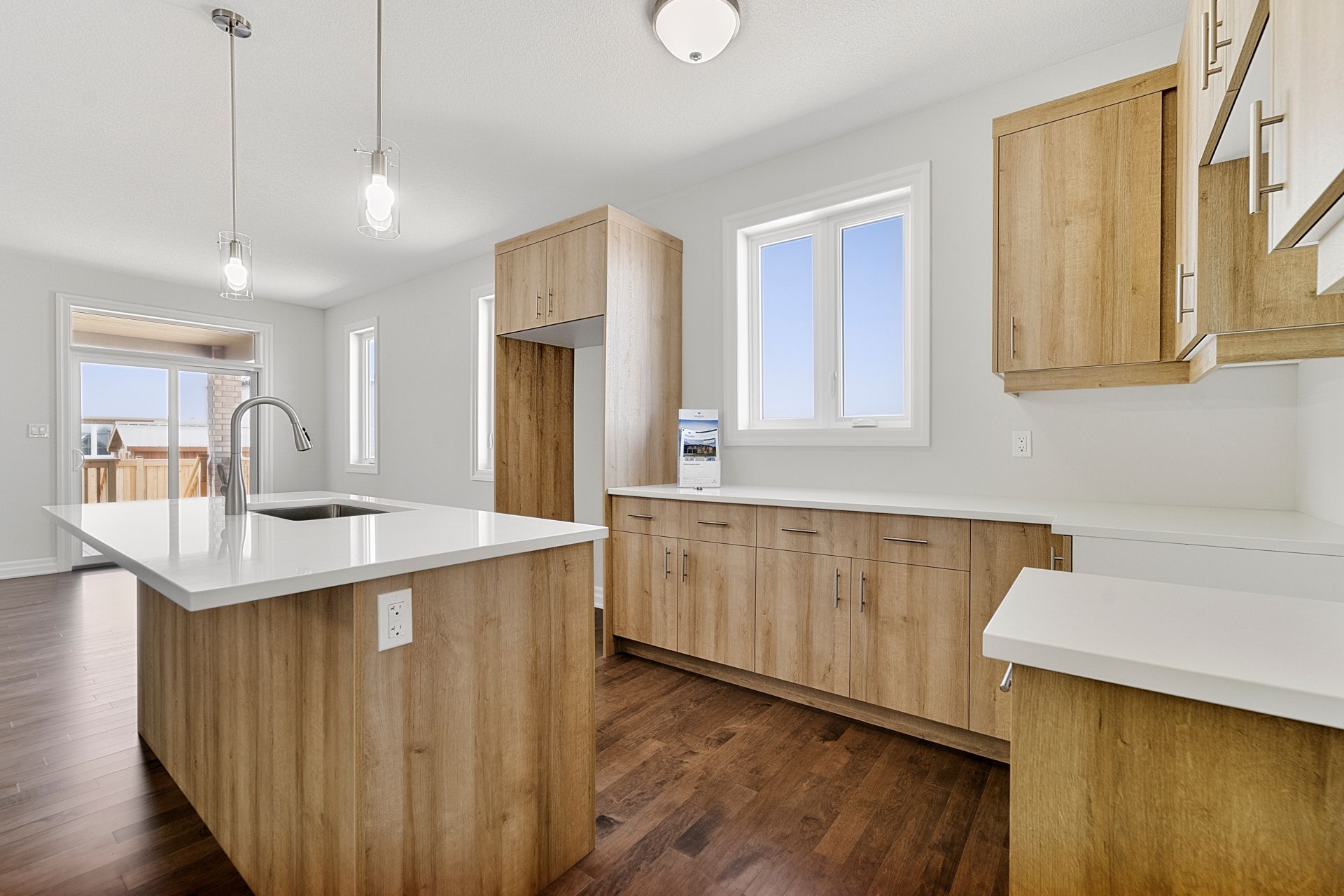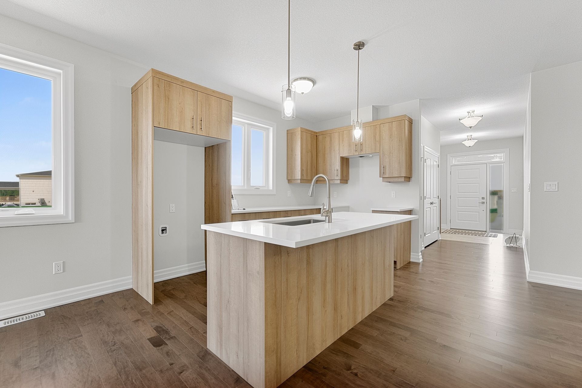 • Open-concept living space with modern kitchen featuring quartz countertops.