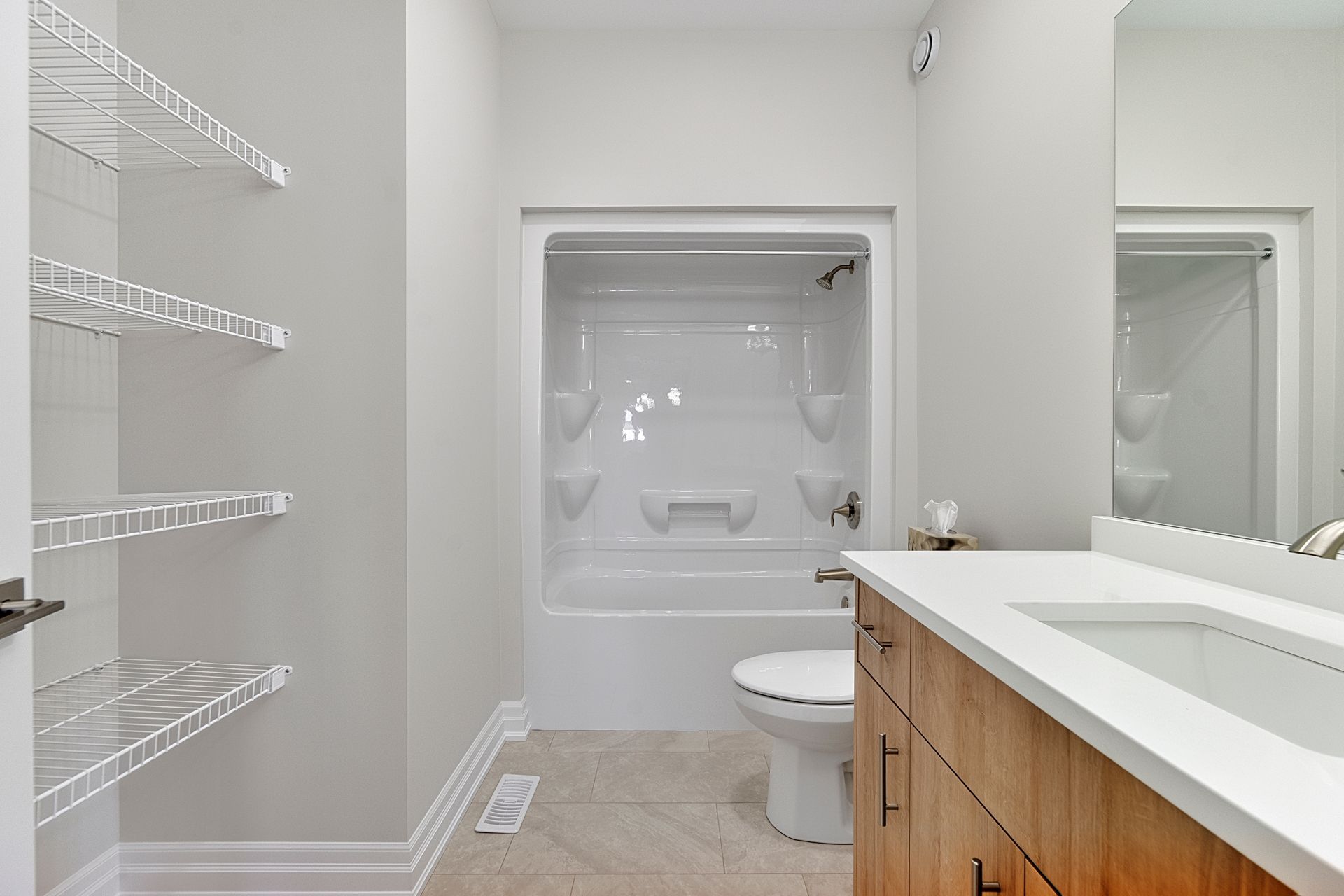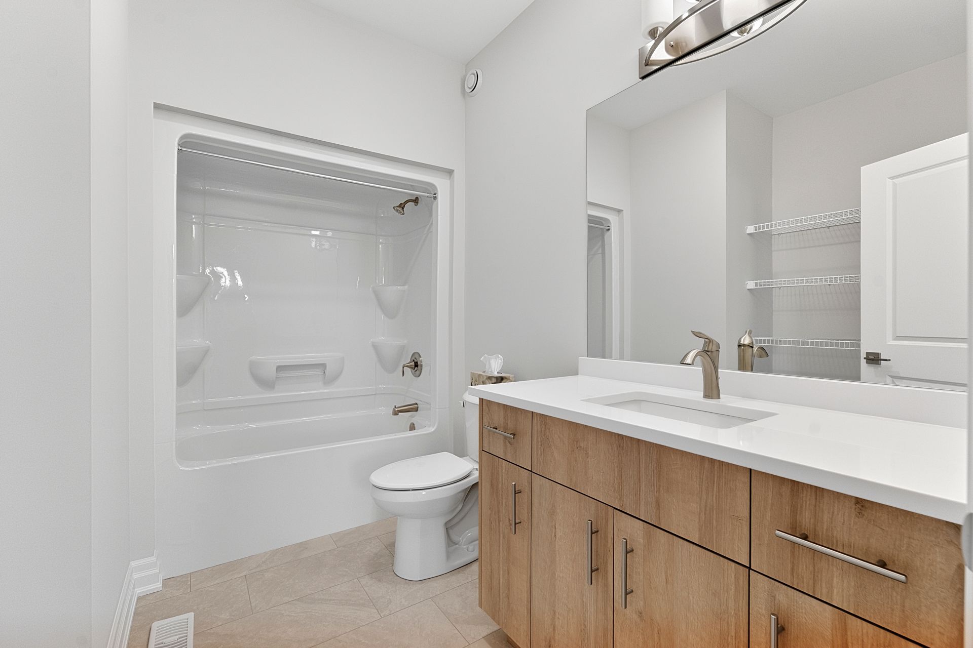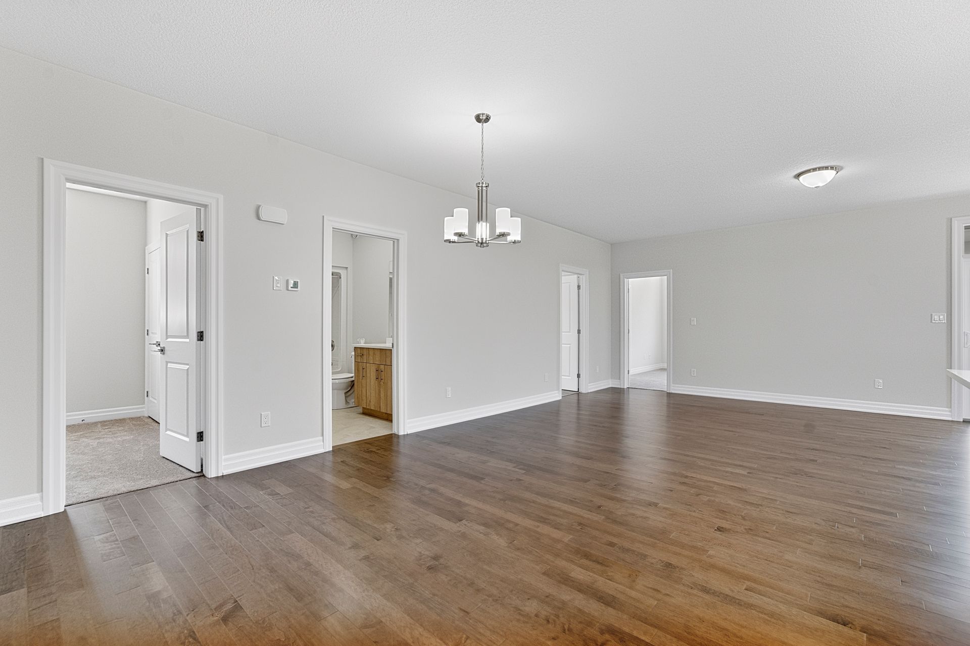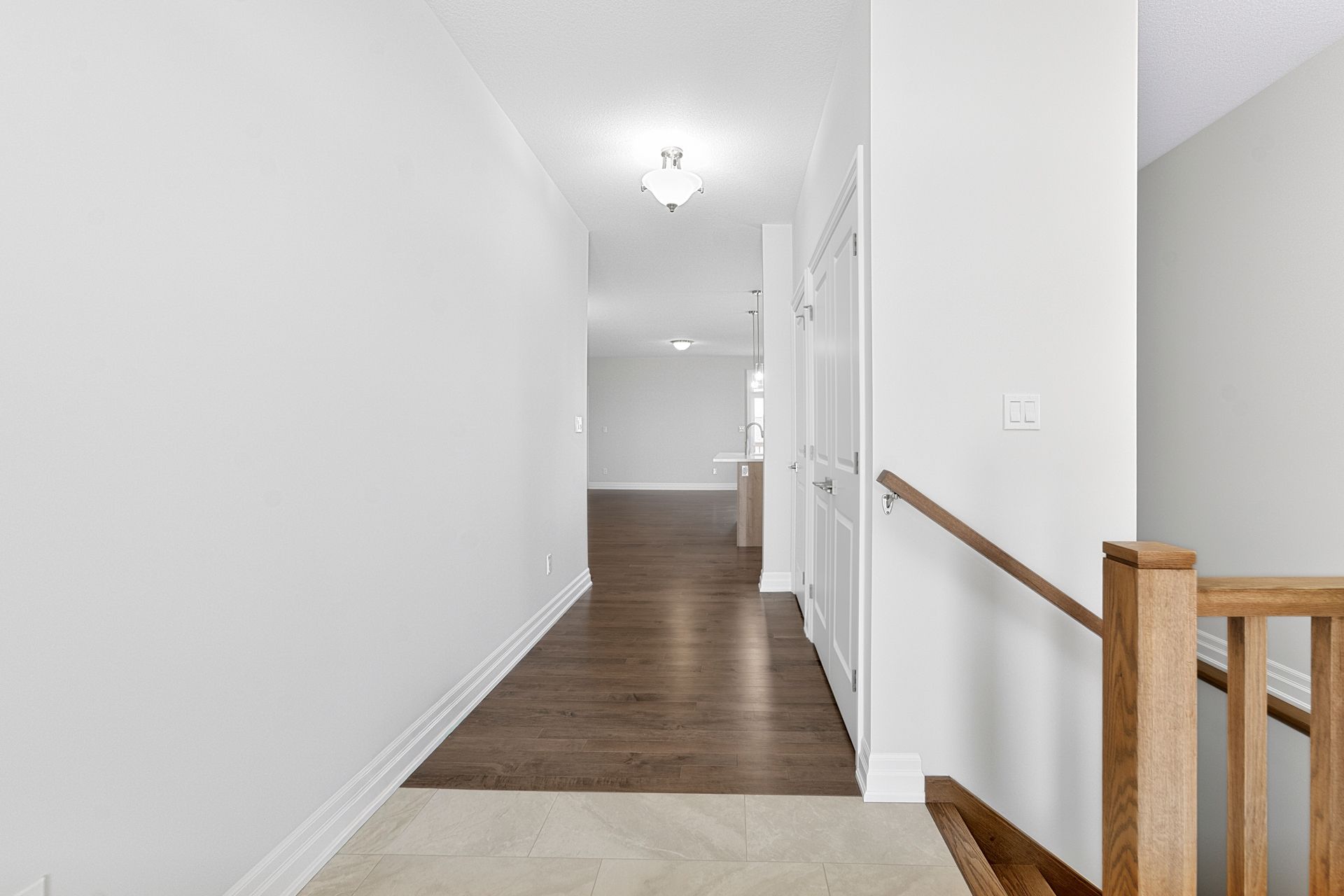 • Open-concept living space with modern kitchen featuring quartz countertops.